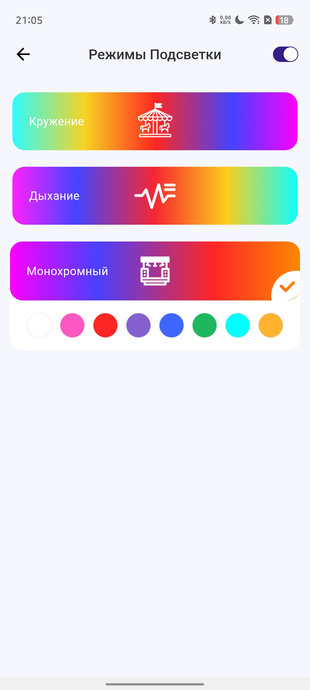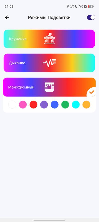 - Управление подсветкой. Можно выбрать один из трех режимов или полностью её отключить;