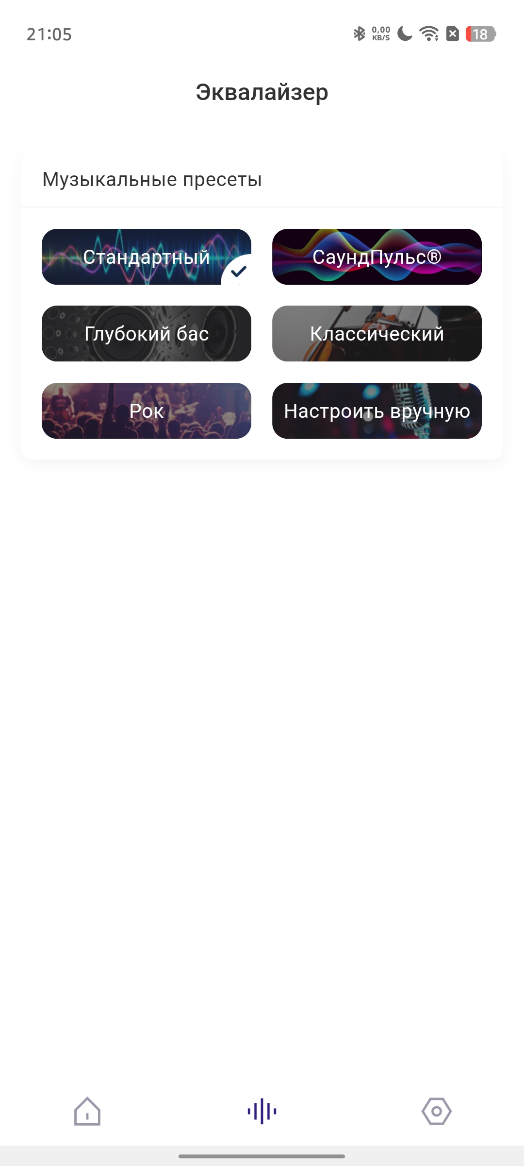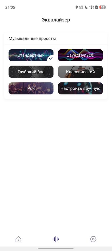 - Выбор эквалайзера. Доступны 4 базовых варианта и фирменный Sound Pulse. Его можно включить и кнопкой на корпусе, а вот выбрать другие пресеты — только через приложение;