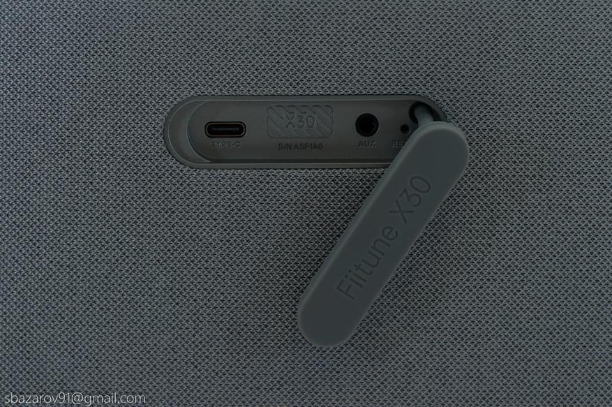 Сзади, под резиновой заглушкой, находятся порт Type-C для зарядки, AUX-вход и кнопка сброса.