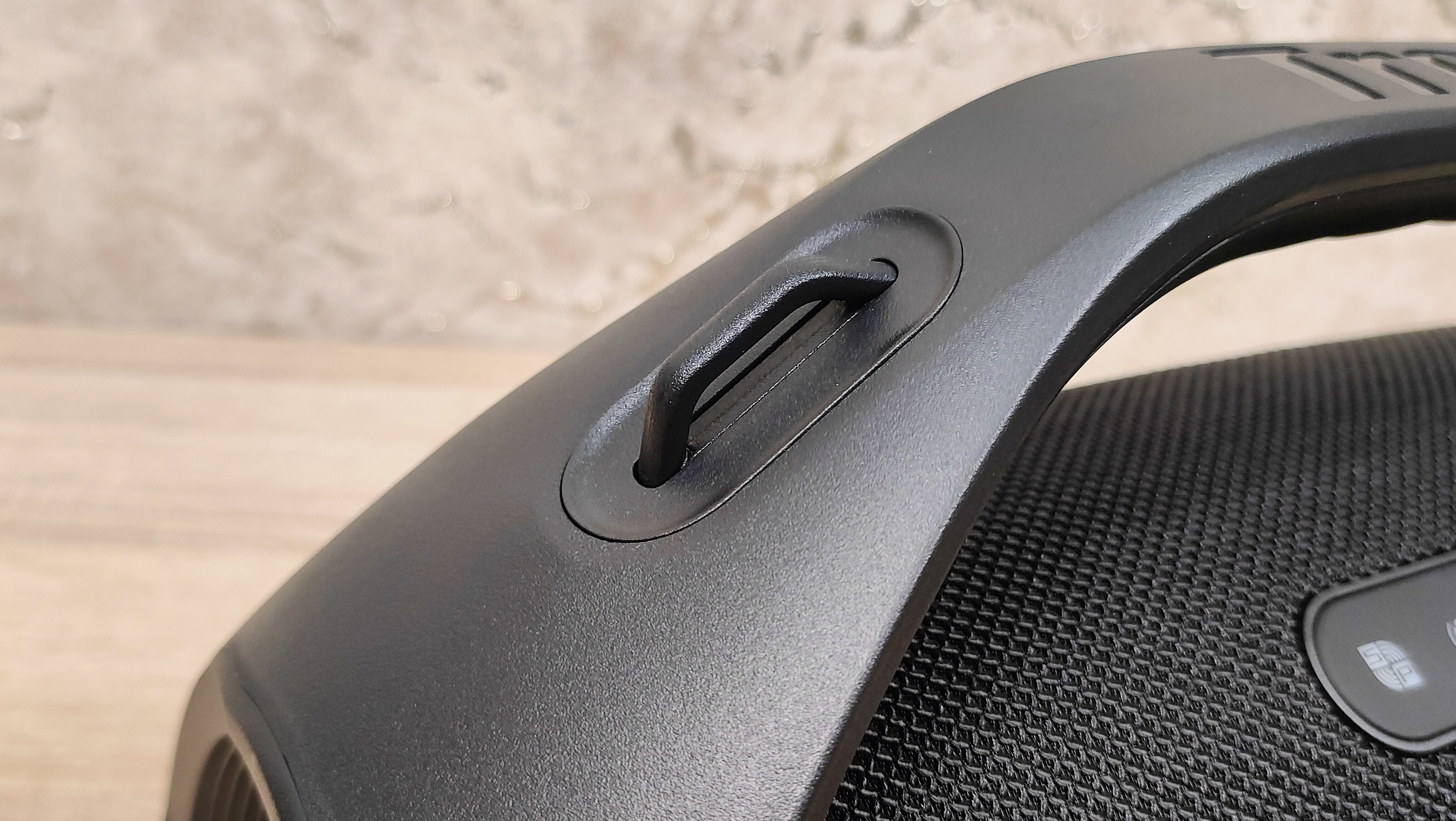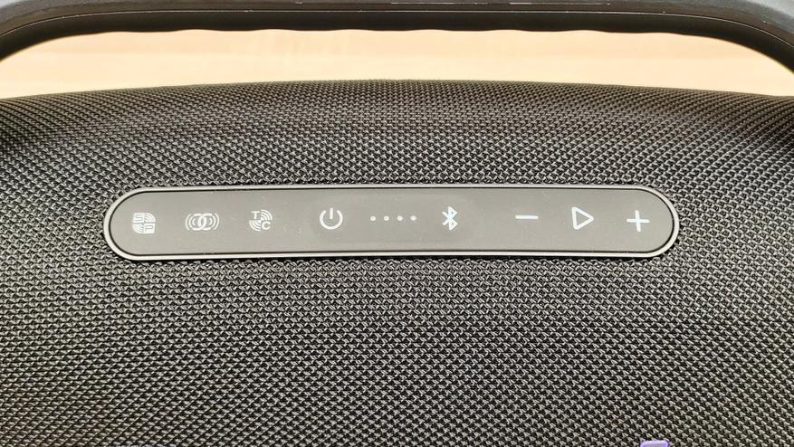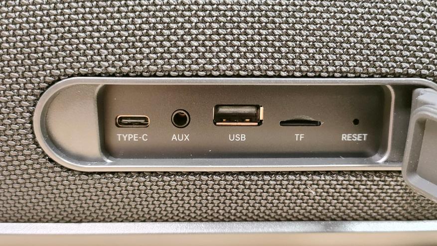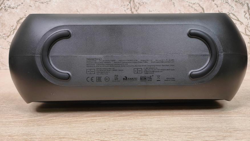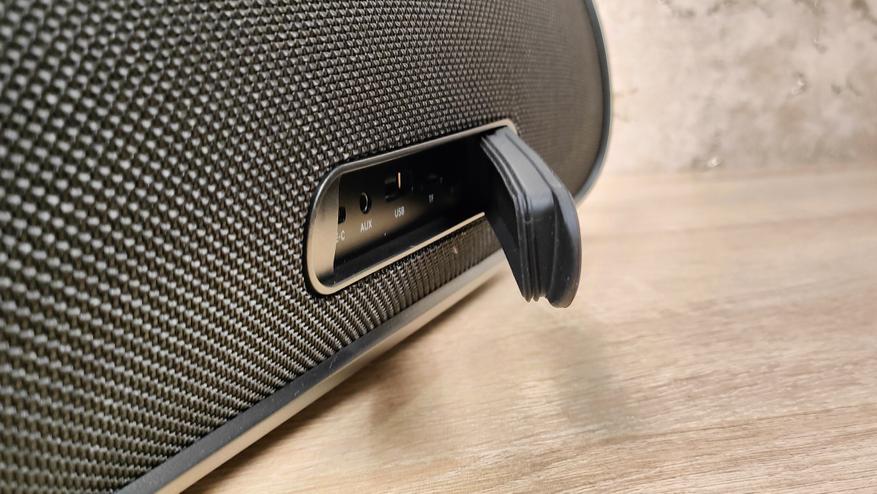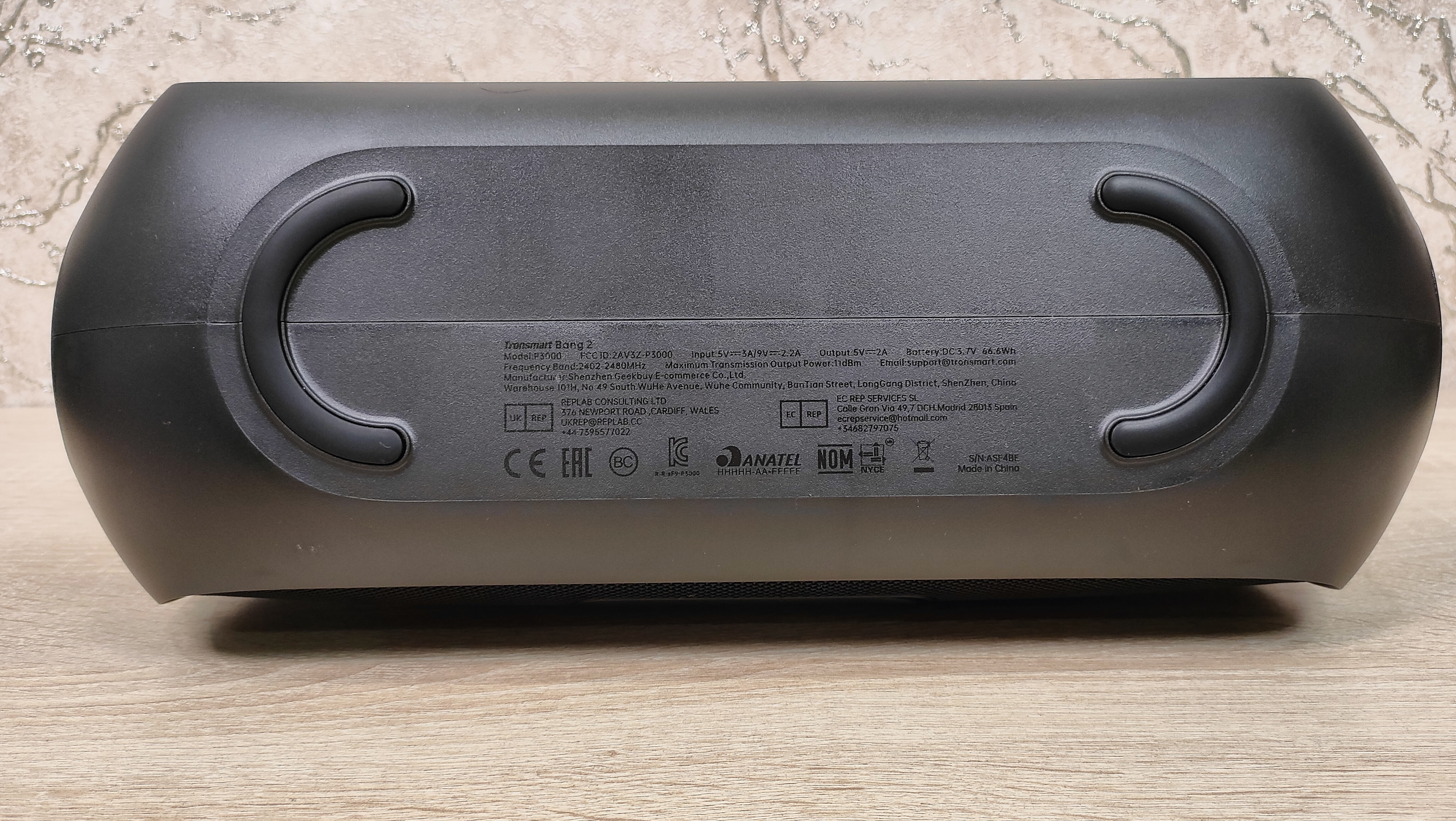 Предназначение всех кнопок на панели управления становится понятным ещё с упаковки, но пробегусь по порядку: пресет эквалайзера SoundPulse, соединение в стереопару, TuneConnect, кнопка включения-выключения, состояние заряда, кнопка сопряжения, уменьшение громкости, воспроизведение пауза, увеличение громкости. На ручке с двух сторон есть два ушка, за которые карабином цепляется комплектный ремешок, к которому я вернусь чуть позже. Сзади у колонки есть силиконовая заглушка, за которой скрывается следующее: разъём USB Type-C для зарядки самой колонки, а также для зарядки других устройств, так как колонка это поддерживает, AUX, USB A, слот для SD карт, кнопка сброса всех настроек. На дне у колонки есть две силиконовые ножки в виде почти полумесяца, которые будут цепко удерживать колонку на месте и сопротивляться катанию колонки по поверхности во время воспроизведения музыки. Кроме того, чёрным по чёрному нанесена базовая информация, которую всегда можно встретить на обороте или на дне различных устройств, например, модель, питание, информация о производителе.