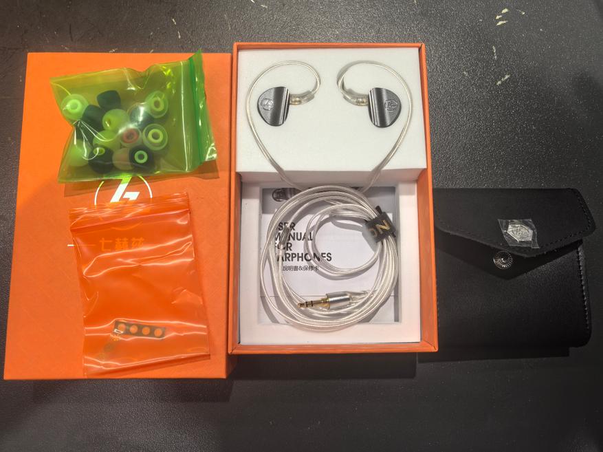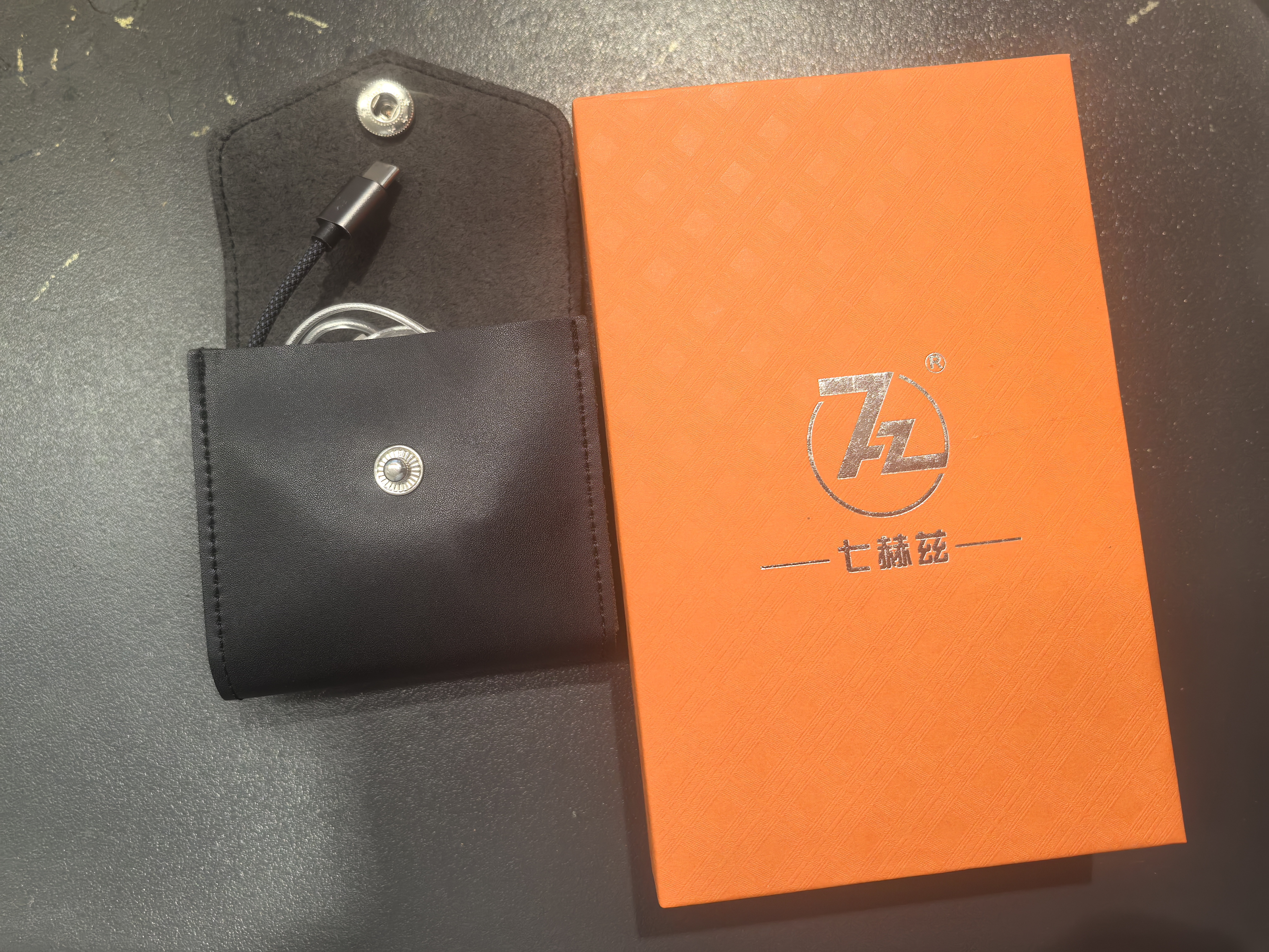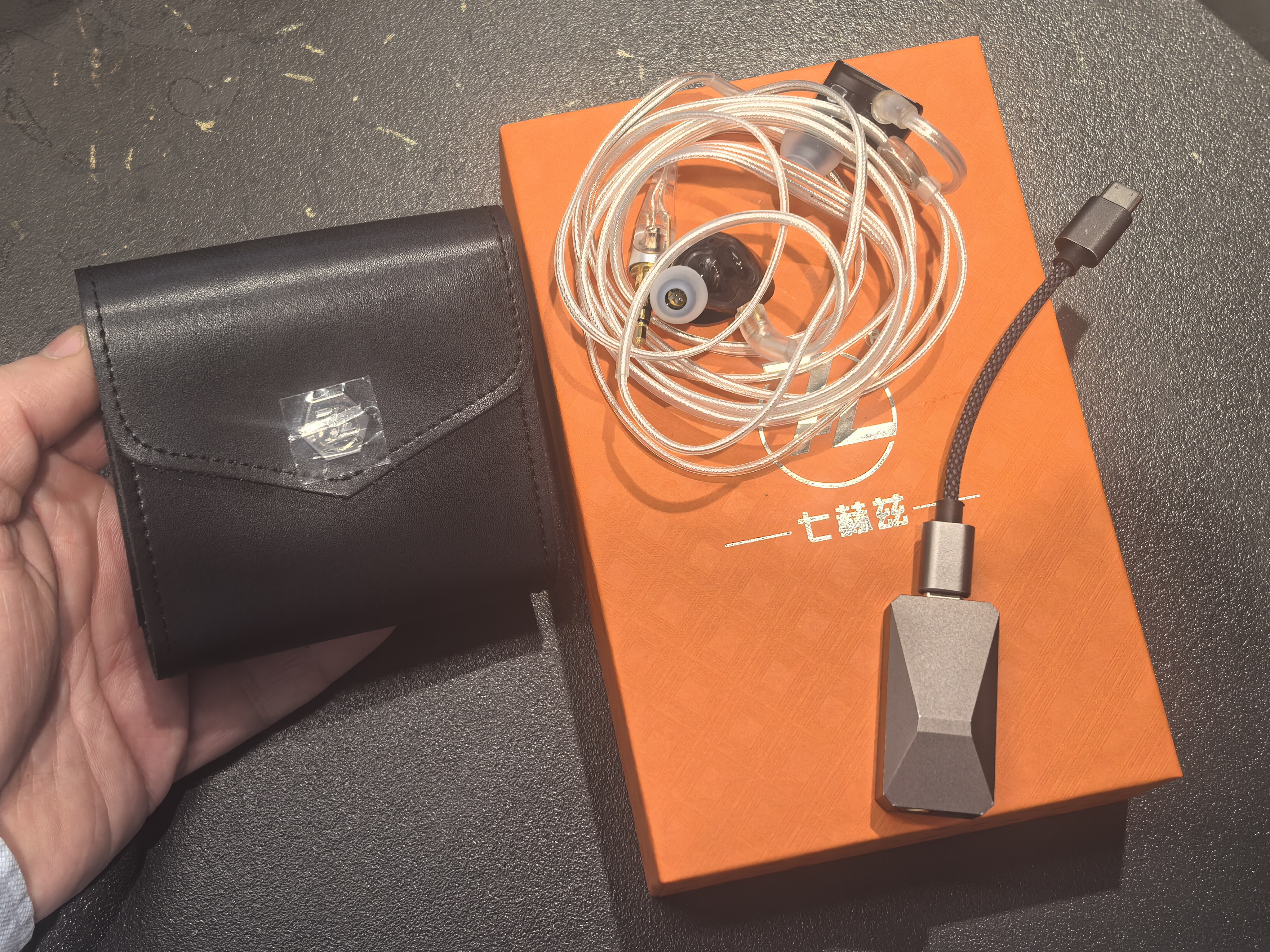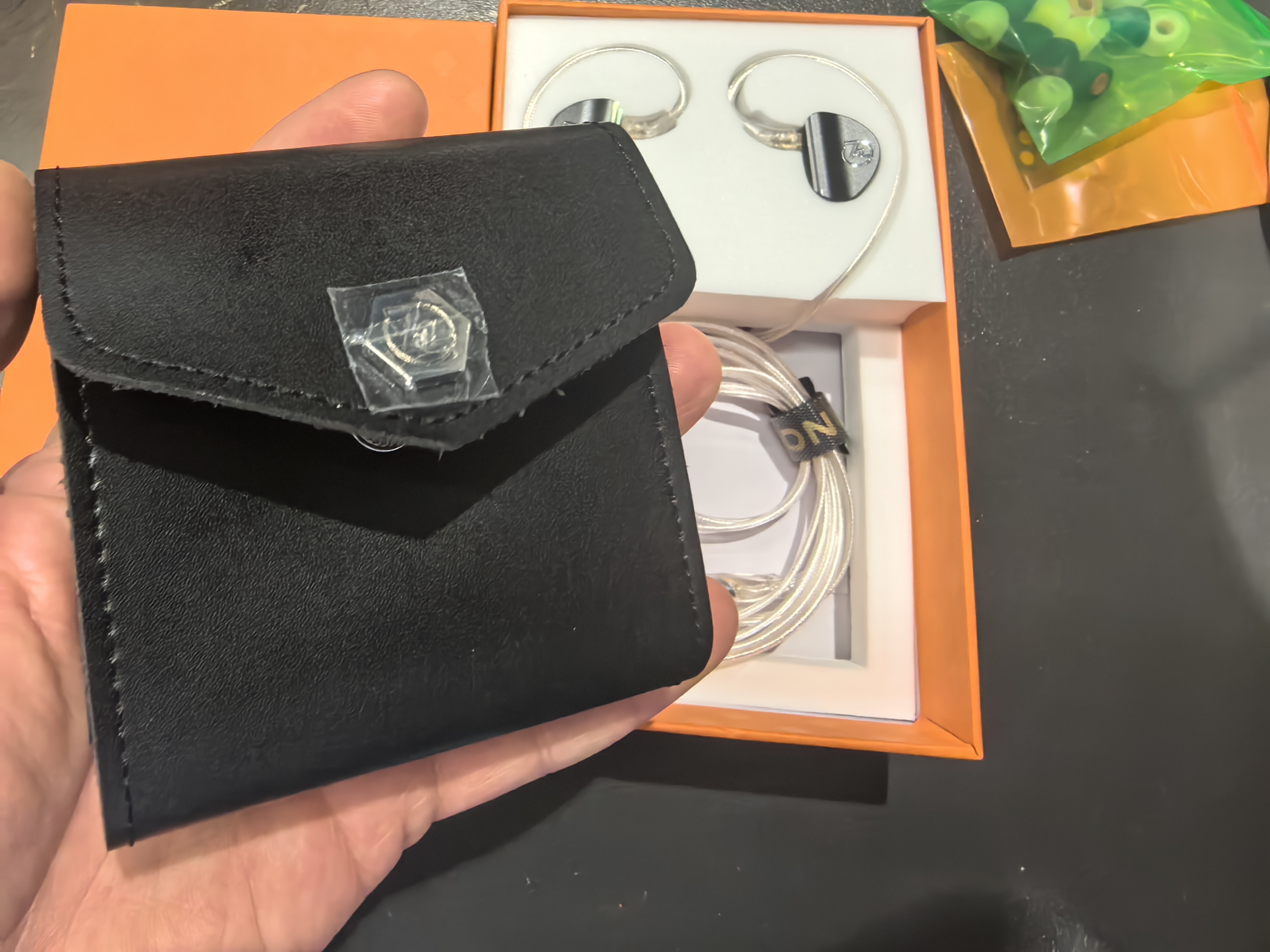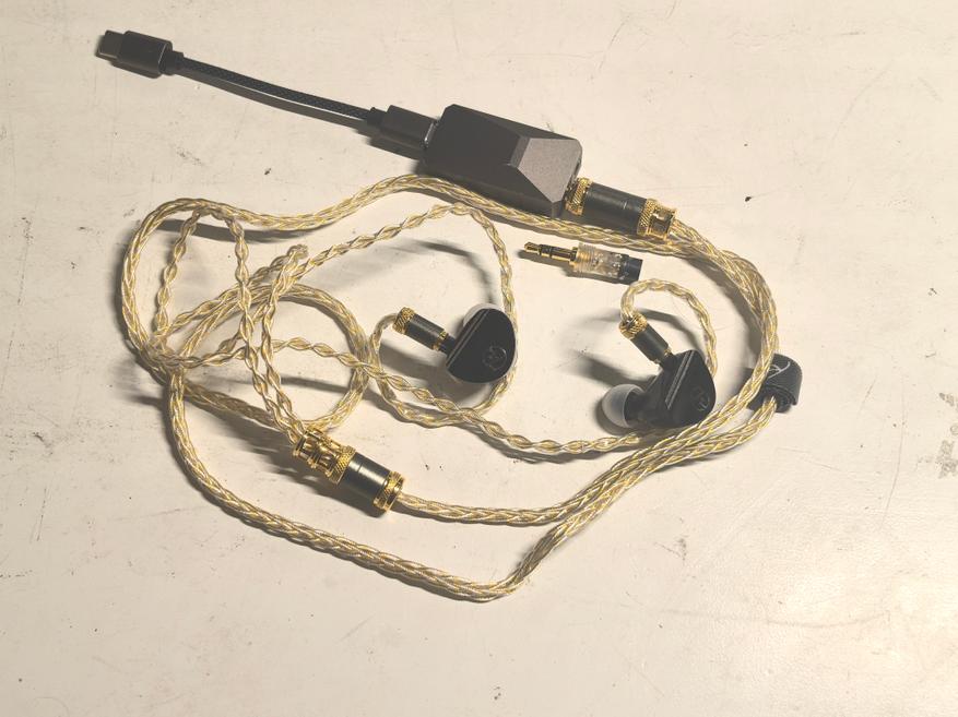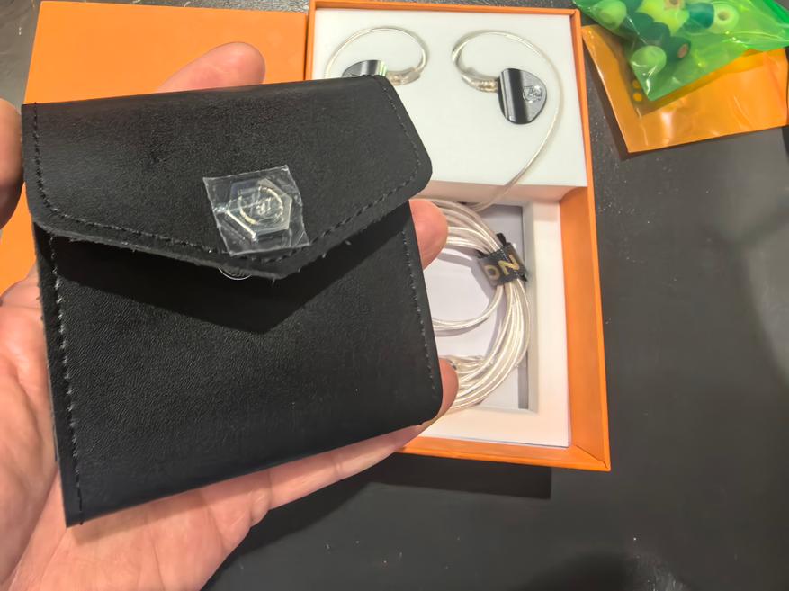 На следующей фотографии показал чехол и рядом наушники со «свистком» Dumu DTC 480. Верхняя часть корпуса сделана из материала медицинского класса, нижняя — из лёгкого авиационного алюминия. Кабель состоит из 49 проводов в каждой из четырех жил, сплетенных в одну форму.