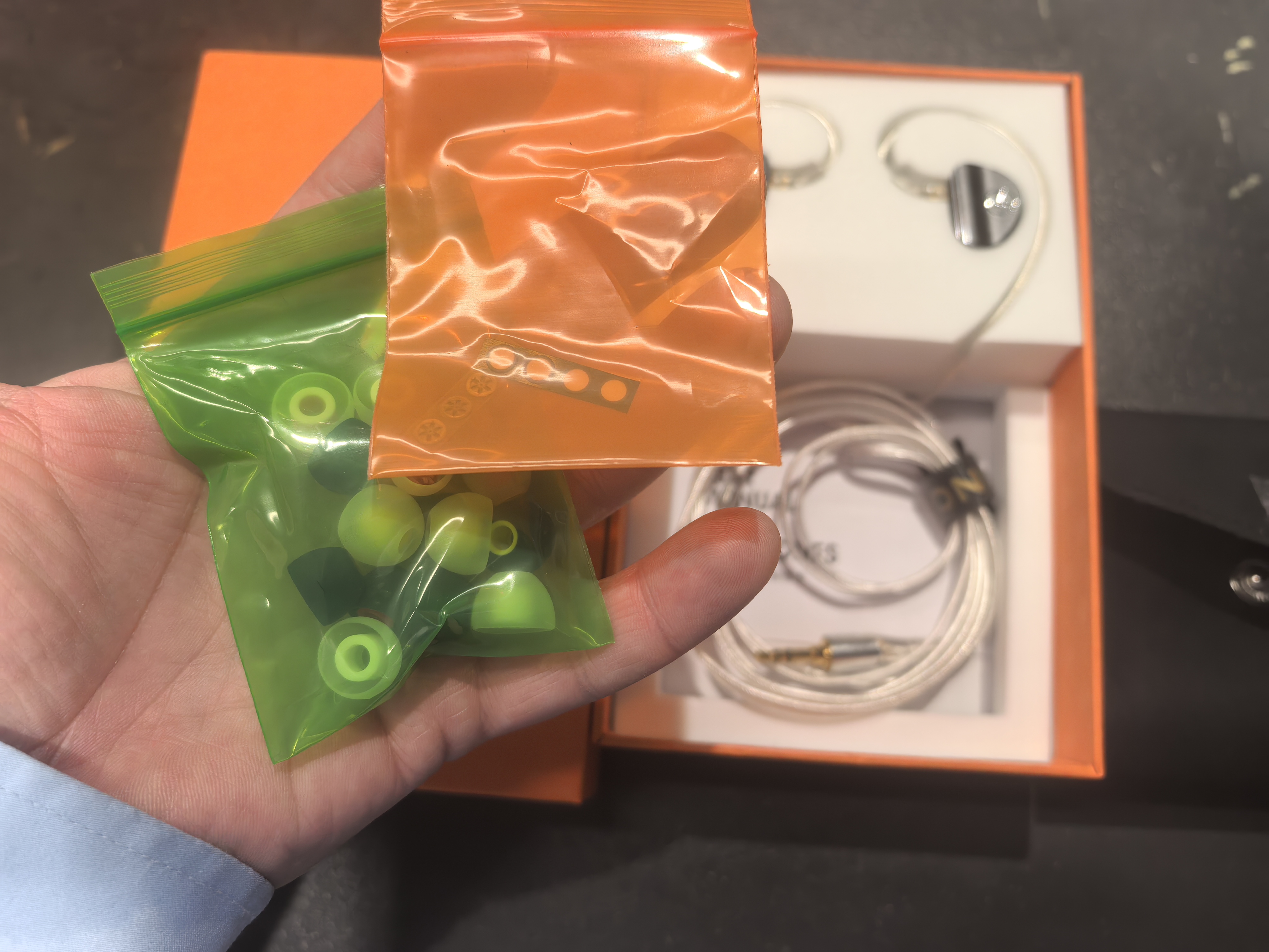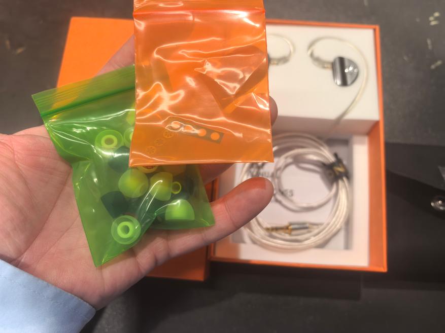 Чехол несколько отличается от строгих форм аналогов в комплекте других моделей. Сделан из кожзама и особо не держит форму — мягкий чехол. Помимо комплектов сменных амбушюр есть насадки на ноззлы. Ещё одно отличие от аналогов — кабель. Он толстый, широкий. Его форма не даёт скручиваться, поэтому он практически не запутывается.