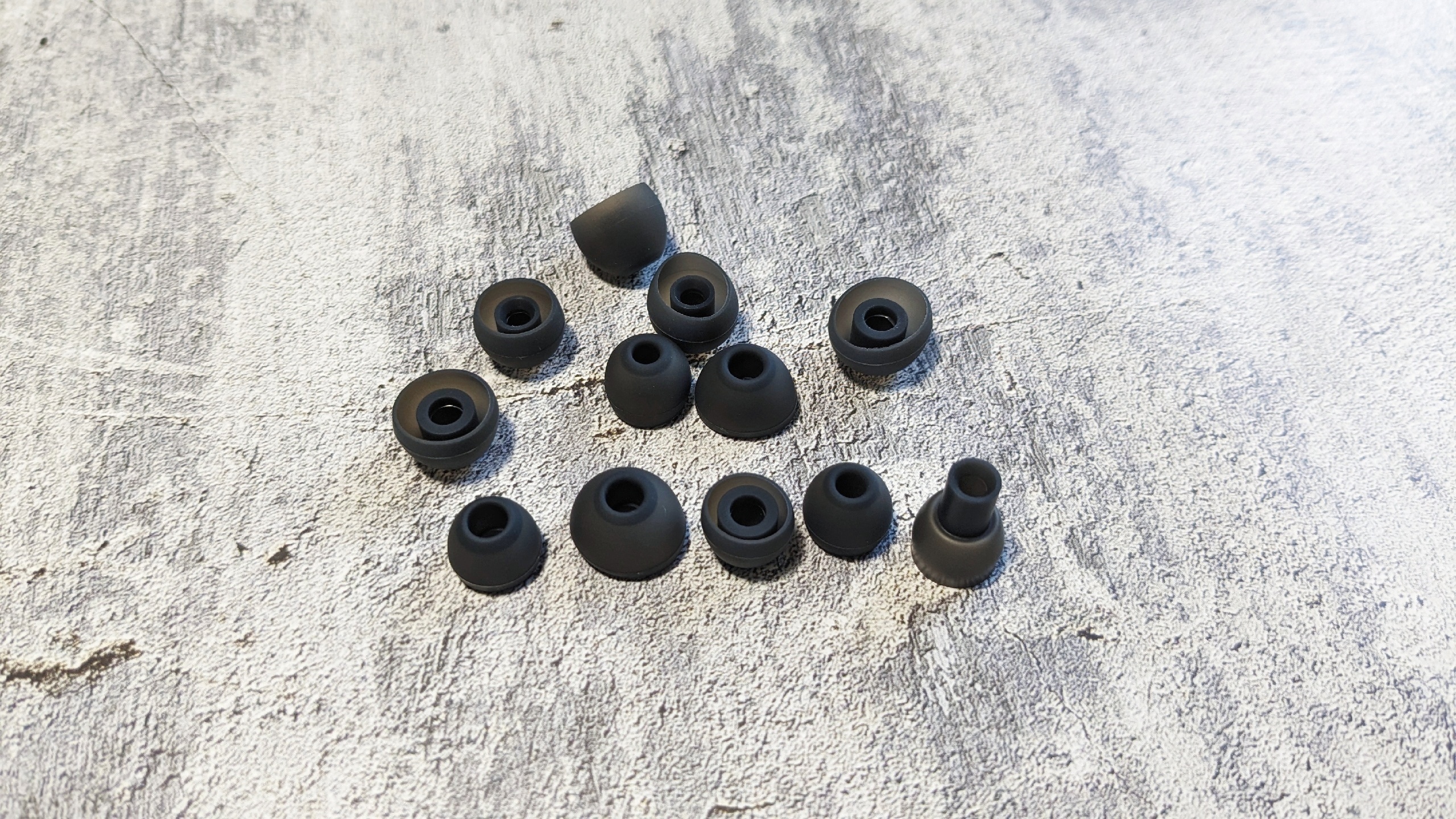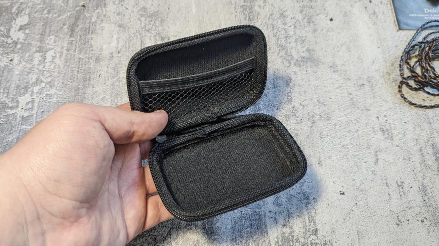 С комплектом всё очень просто — положили самое необходимое — насыпали насадок, докинули кейс на молнии. Кейс самый обычный и не особо жесткий, с довольно мягкими стенками. Внутри кейса достаточно много пространства чтобы разместить как наушники, так и несколько комплектов любимых амбушюр (предусмотрен сетчатый карман).