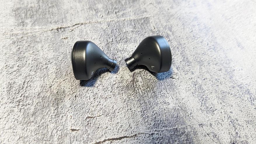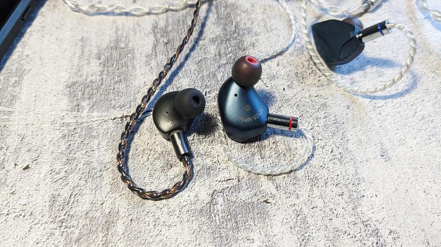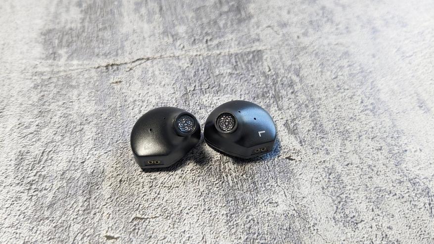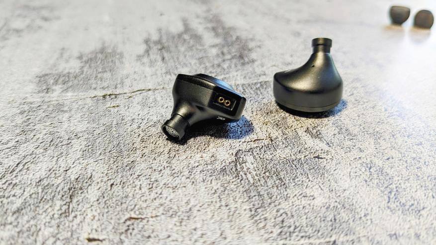 Корпуса впечатляют — идеальная и универсальная форма наушника, которая понравится владельцам как больших, так и маленьких ушей. Они не такие уж и большие, и в целом очень крепко сидят в ушах. Внешняя часть украшена круглыми вставками с названием производителя. На внутренней — два компенсационных отверстия и разметка каналов. Звуководы с бортами — цельные (наконечники не раскручиваются). Площадка под кабель зафиксирована надёжно.