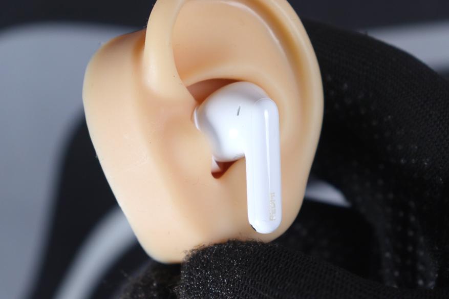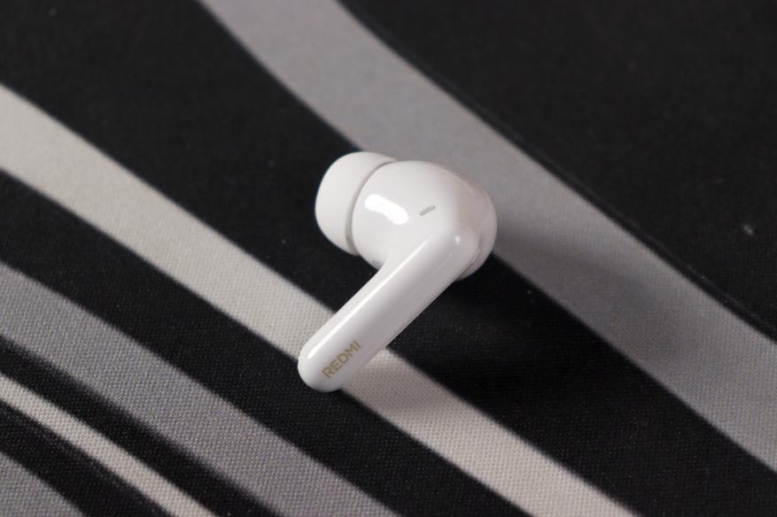 Форм-фактор — классическая капля с ножкой, очень близко к AirPods Pro по силуэту. Корпус глянцевый, ножка чуть длиннее, чем у конкурентов в том же ценовом диапазоне. На ножке золотистая надпись «REDMI» — небольшой штрих, который добавляет характера. Звуковод с сетчатым акустическим фильтром золотистого цвета защищает драйверы от влаги и загрязнений. Силиконовые амбушюры двухуровневые — сидят плотно, создавая пассивную шумоизоляцию ещё до включения ANC. На корпусе несколько микрофонных портов. Контактные площадки для зарядки на кончике ножки. На внешней грани — сенсорная зона управления.