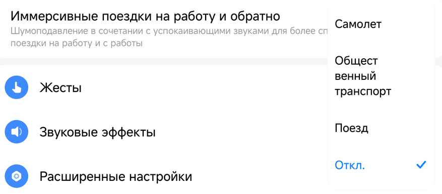 Отдельный режим «Иммерсивные поездки» — это ANC в связке с генерируемыми успокаивающими звуками, адаптированными под контекст: самолёт, общественный транспорт, поезд. Звучит как маркетинг, но для длинных поездок в метро с тревожным фоном реально снижает усталость от шума. Переключение между режимами — удержанием любого наушника, быстро и без лишних движений.