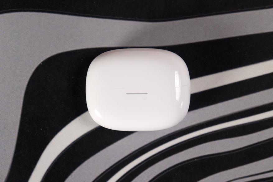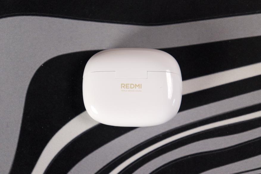 Кейс выполнен из глянцевого ABS-пластик белого цвета — выглядит свежо из коробки, но уже через неделю превратится в коллектор отпечатков. На верхней крышке тонкая светодиодная полоска-индикатор, едва заметная в закрытом состоянии. На обратной стороне золотистая надпись «REDMI / TRIPLE-DRIVER SOUND» — намёк на трёхдрайверную конфигурацию, и это уже интересно. Шарнир открывается плавно, без люфта. На дне — порт Type-C. Размер компактный, форма скруглённая — в карман ложится без острых углов.