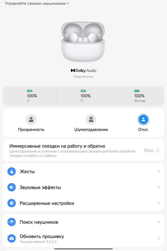 Главный экран сразу показывает заряд всех трёх компонентов по отдельности. Переключение между режимами ANC — прямо с него, без лишних тапов. И главная фишка для владельцев Android-устройств Xiaomi: все настройки доступны прямо из системного меню Bluetooth, без запуска отдельного приложения.