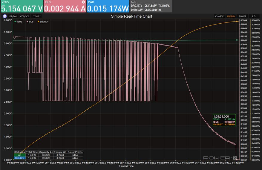 По автономности: замер с активным ANC дал 5 часов 52 минуты — сильный результат для гибридного шумодава. Многие конкуренты в этом ценовом диапазоне при активном ANC едва дотягивают до пяти часов. График зарядки кейса (Power-Z) показал 3,27 Втч за 1 час 30 минут — кейс заряжается быстро и без сюрпризов.