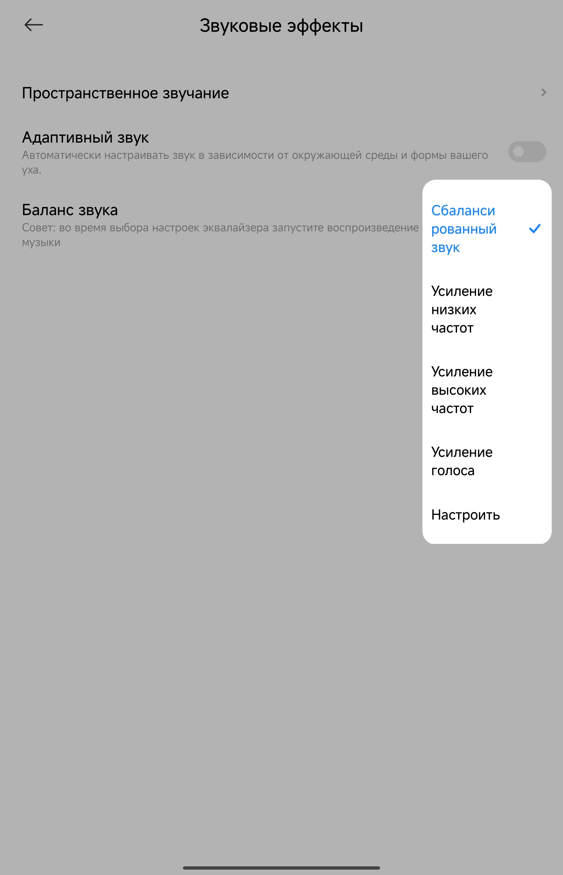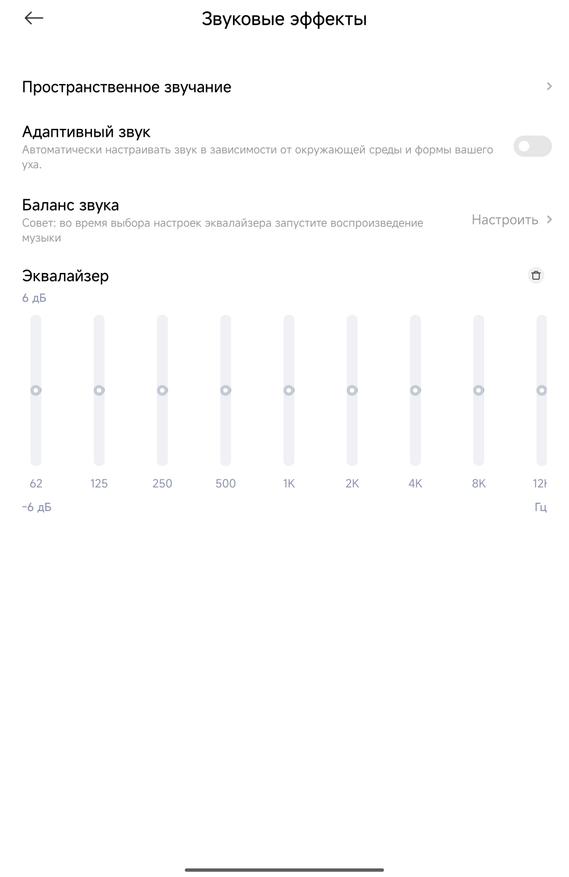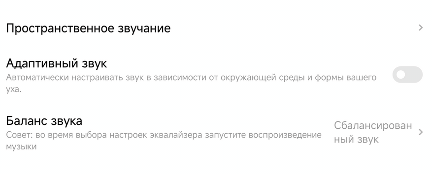 Эквалайзер девятиполосный, от 62 Гц до 12 кГц — полноценный, не декоративный. Пресеты: сбалансированный, усиление низких, высоких, голоса, плюс ручная настройка. Адаптивный звук подстраивает АЧХ под форму уха и окружение. Пространственный иммерсивный звук — для тех, кто хочет расширить сцену.