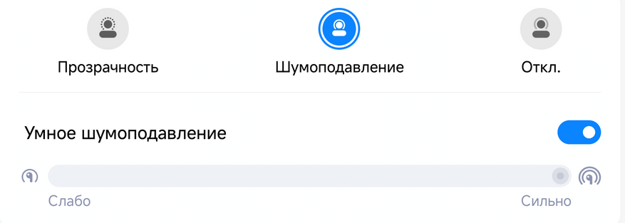 ANC здесь гибридный — микрофоны работают и снаружи корпуса, и изнутри звукового канала. Такая схема даёт более точное подавление как низкочастотного гула транспорта, так и более высокочастотных раздражителей вроде офисного фона. Интенсивность регулируется ползунком от «слабо» до «сильно», а «Умное шумоподавление» самостоятельно адаптирует уровень давления под текущий шумовой фон — заходишь в метро, система автоматически докручивает изоляцию. Без ручного вмешательства, просто работает.