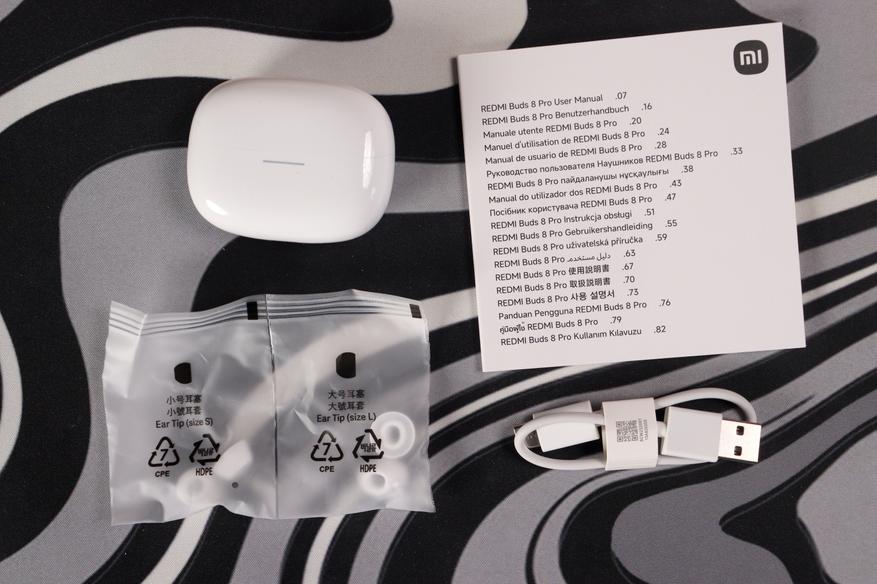 Внутри: кейс с наушниками, кабель USB-A → Type-C (короткий, чисто для зарядки), две пары запасных амбушюр в отдельных пакетиках — S и L, плюс предустановленный размер M. Бумажная инструкция на добром десятке языков. Зарядника в комплекте нет. В целом аккуратно, без изысков, всё необходимое есть.