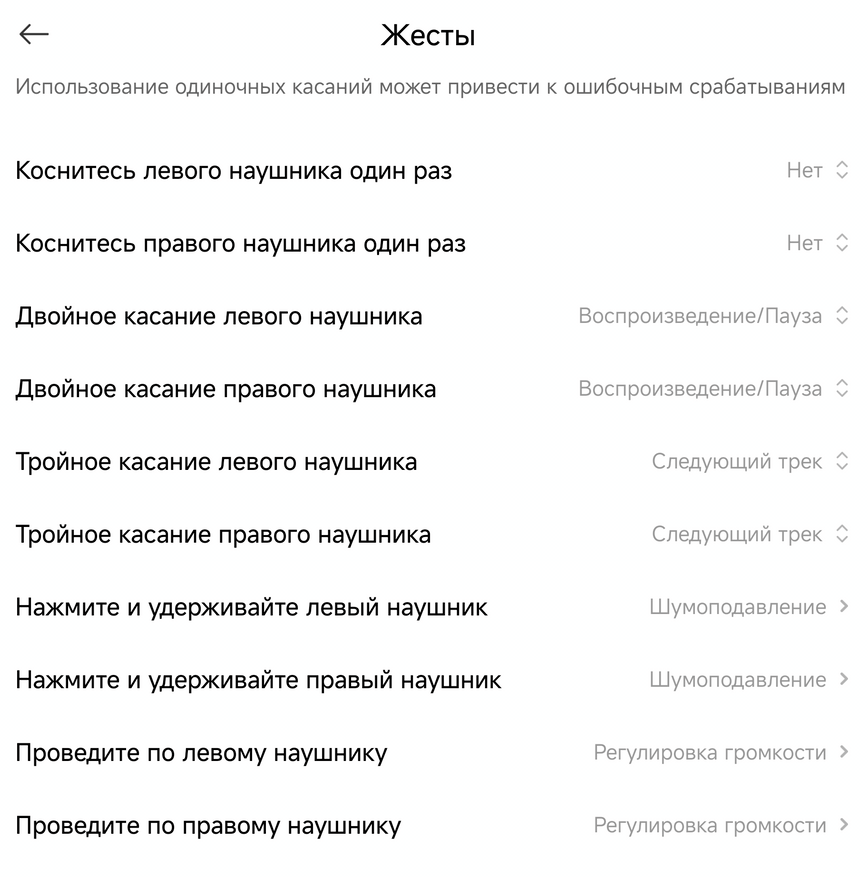Жесты гибко переназначаются. Одиночный тап по умолчанию отключён — меньше случайных срабатываний. Двойной — воспроизведение/пауза. Тройной — следующий трек. Удержание — переключение ANC. Свайп по ножке — регулировка громкости. Последнее особенно приятно: у многих конкурентов в этом ценовом сегменте свайпа просто нет.