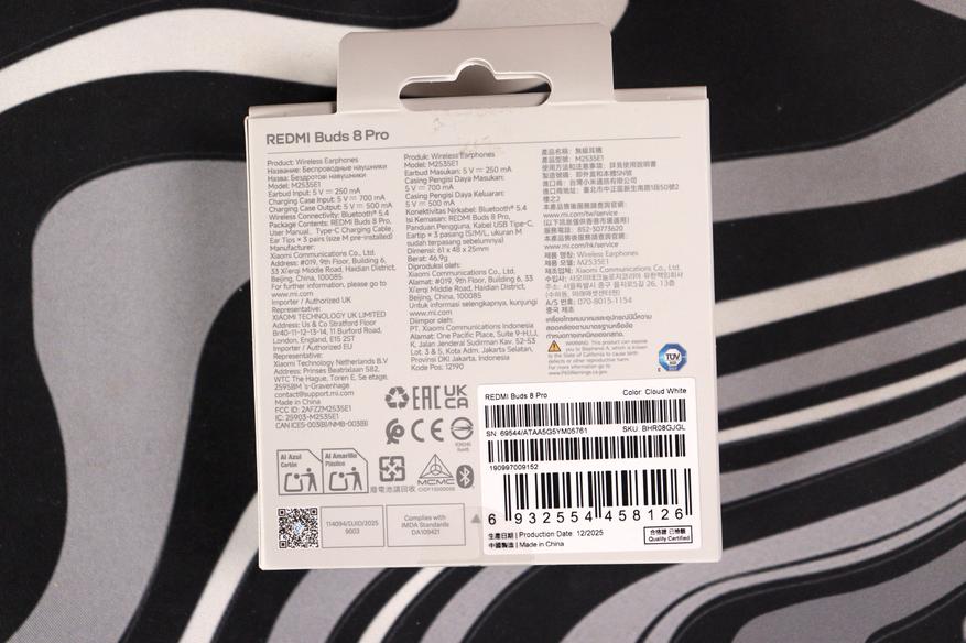 Коробка небольшая, квадратная, в духе минималистской упаковки Xiaomi последних лет. Белый картон, чёткая полиграфия, никаких лишних украшений — всё строго и по делу. На обороте — полный разворот характеристик сразу на нескольких языках