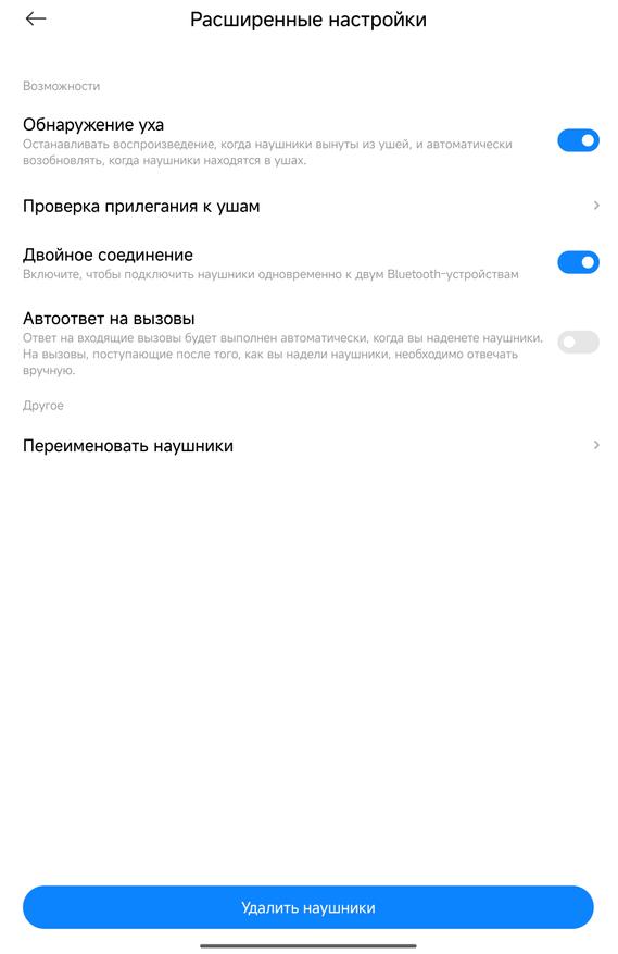 В расширенных настройках: обнаружение уха, проверка прилегания амбушюр, мультиподключение к двум устройствам одновременно — всё включено и работает.