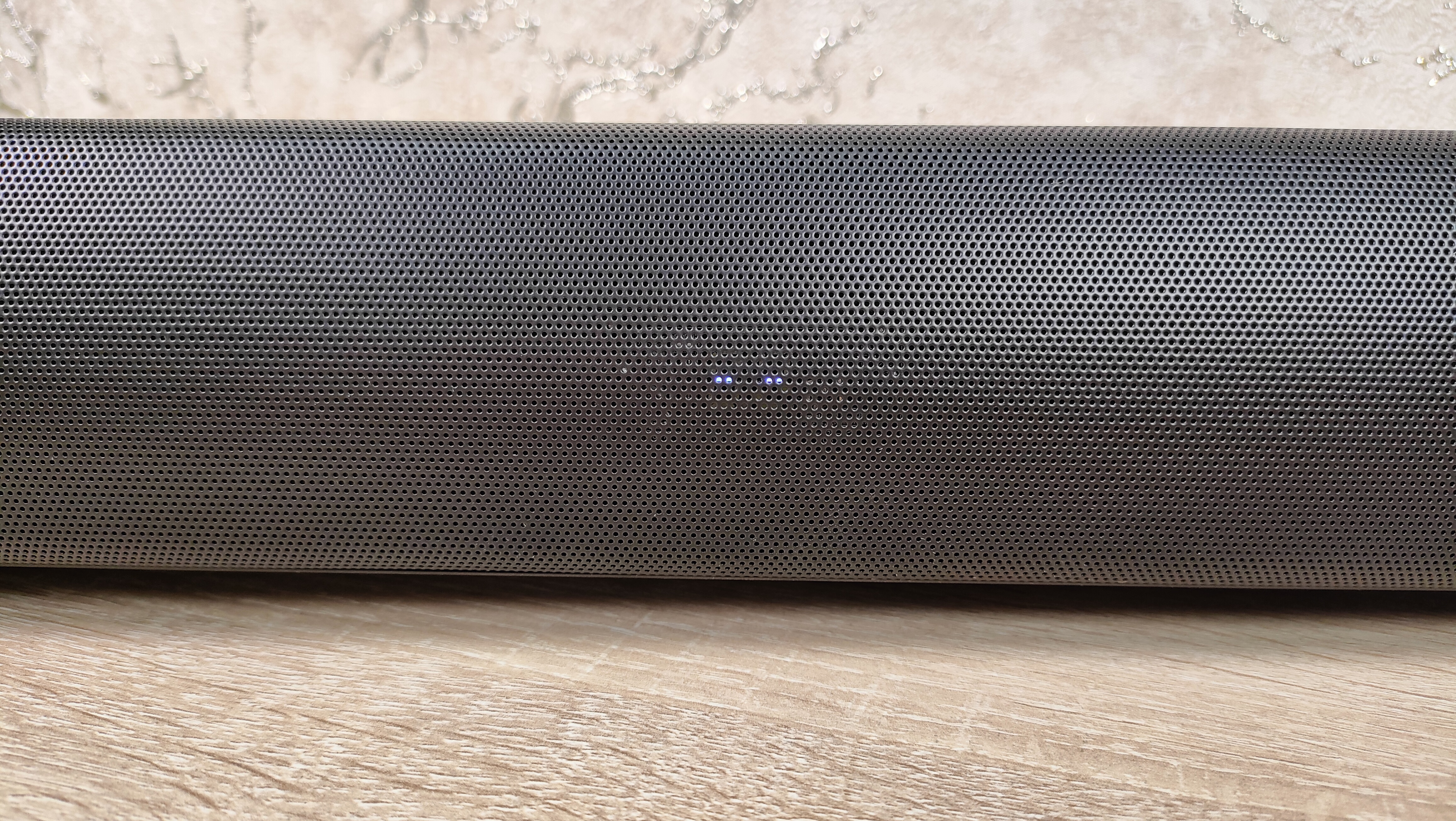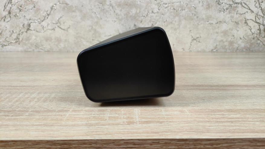 Если бы колонка была чуть короче, она была бы похожа на типичную беспроводную Bluetooth колонку, только с очень спокойным дизайном. Саундбары зачастую имеют очень схожий между собой дизайн в виде широкой панели небольшой высоты и глубины, где спереди есть решетка, закрывающая динамики, и, собственно, всё. Примерно такой дизайн у среднестатистического саундбара, раньше, примерно подобный вид, имели фронтальные динамики в системах 5.1. если мысленно поделить его пополам, то получится просто пара вытянутых в высоту колонок. Все органы управления сосредоточены на правом торце, это всего несколько кнопок и шайба для регулировки громкости, совмещённая с кнопкой питания.
