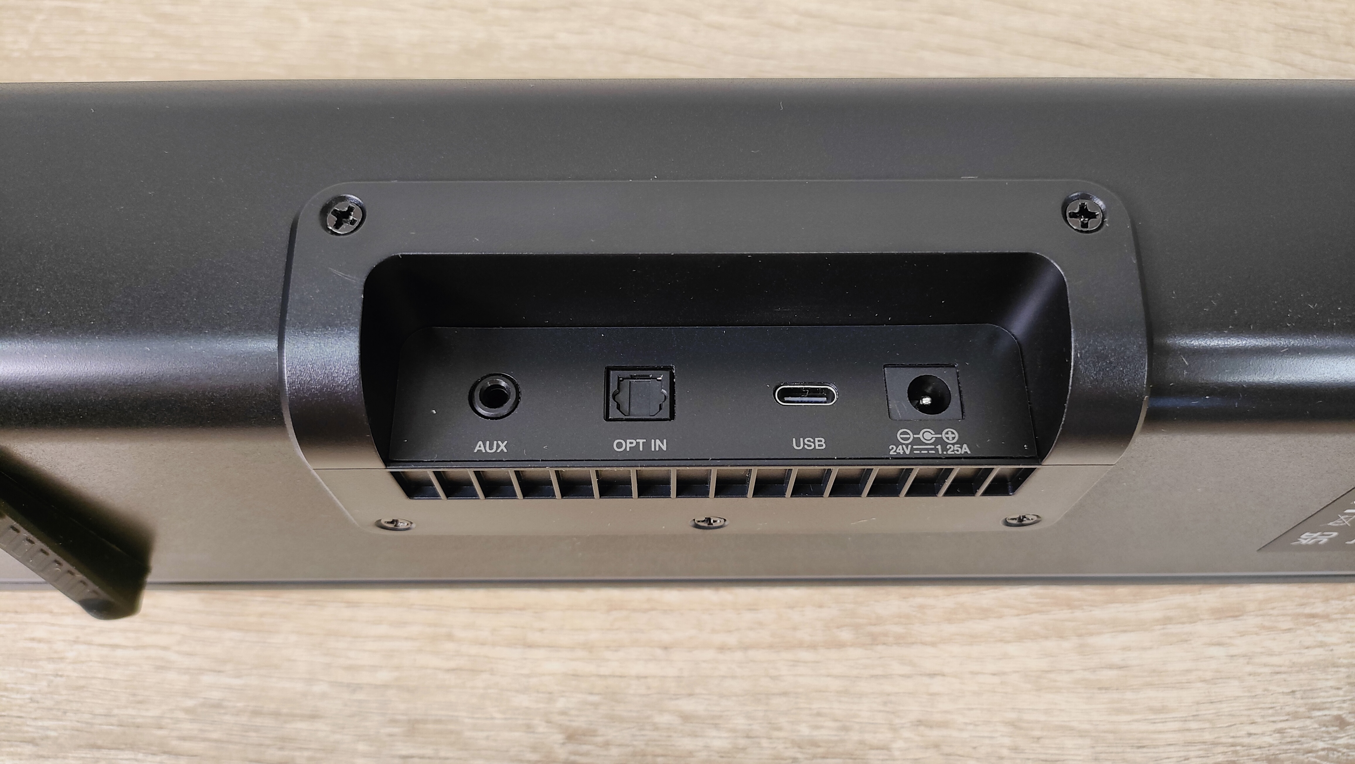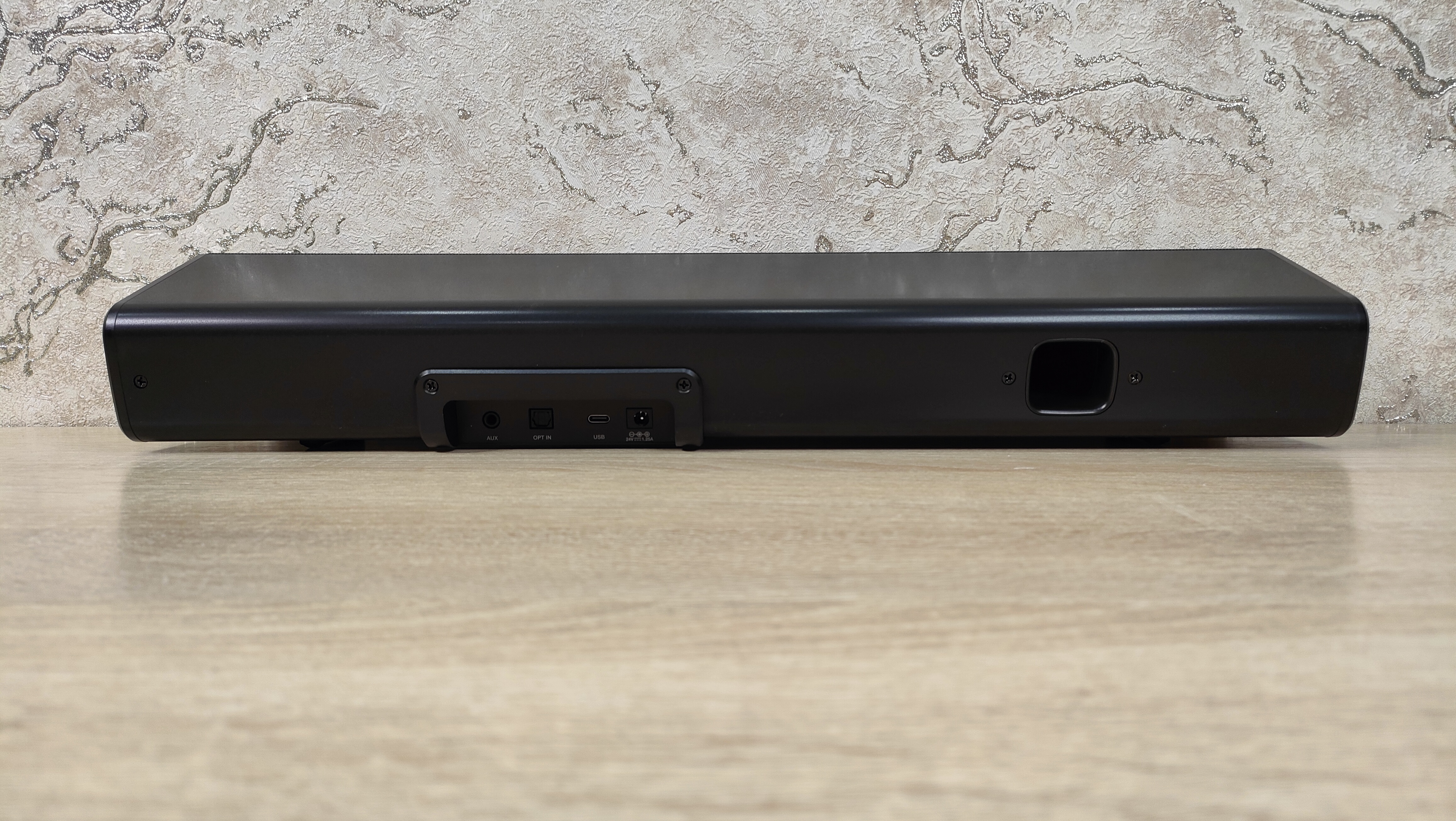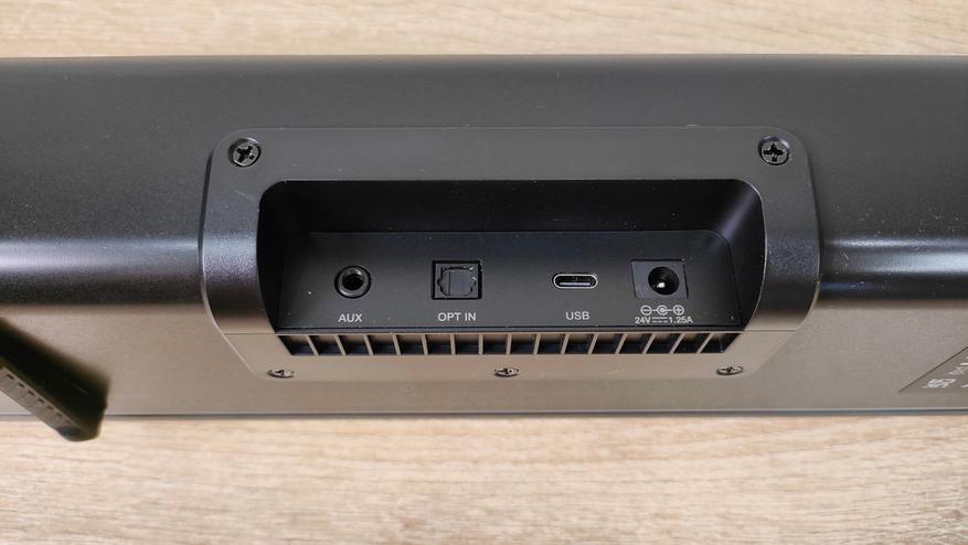Количество разъёмов можно сказать минимальное: порт питания, оптический разъём, миниджек, и USB. Возможно, для полной картины не хватает HDMI ARC. Естественно, в духе современной акустики, не забыт и Bluetooth, ведь как говорил Шелдон Купер «Все становится лучше, если добавить Bluetooth», здесь он есть. Кроме разъёмов, сзади можно увидеть отверстие фазоинвертора, а значит вплотную к стене ставить нежелательно. Сквозь решётку на передней панели можно заметить нечто, что впоследствии оказалось сегментным экраном.