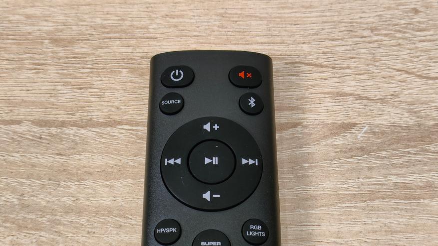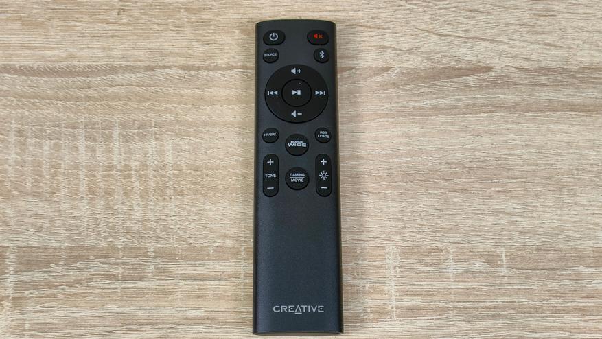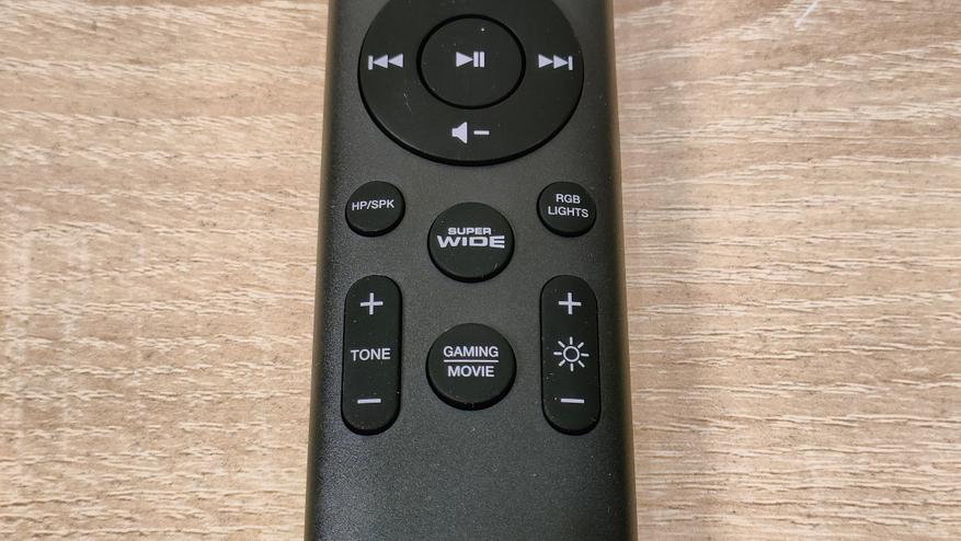 Аксессуаров немного, это USB A-C кабель для подключения, например, к компьютеру, а также пульт дистанционного управления. На нём есть все необходимое, даже работа с подсветкой. Да, подсветка в данном саундбаре есть, но она очень ненавязчивая, далее я продемонстрирую это.