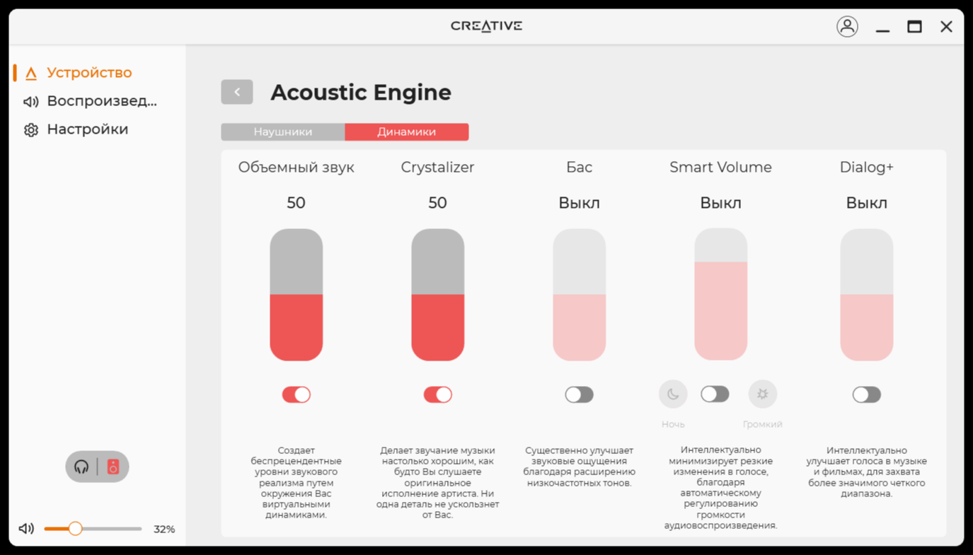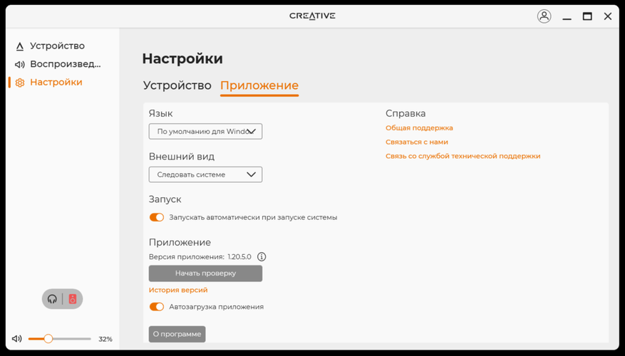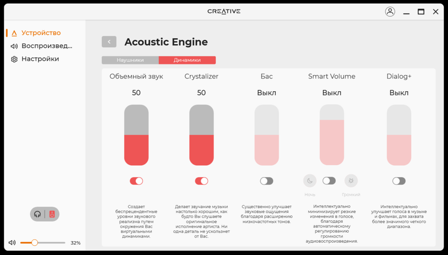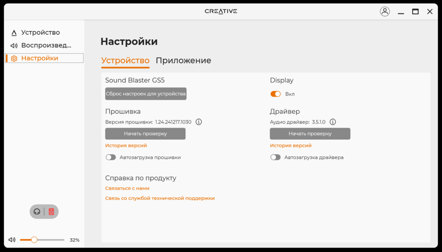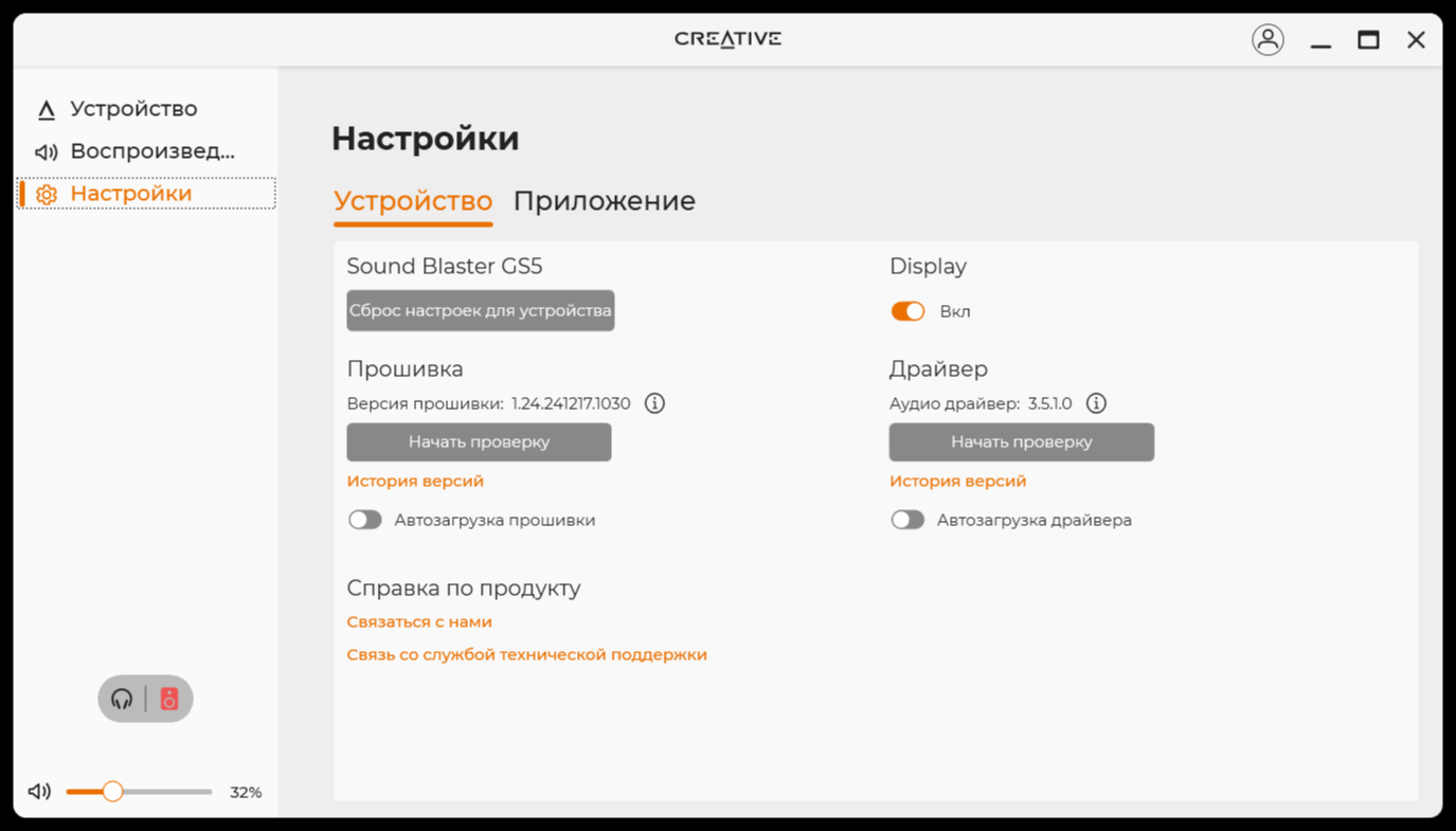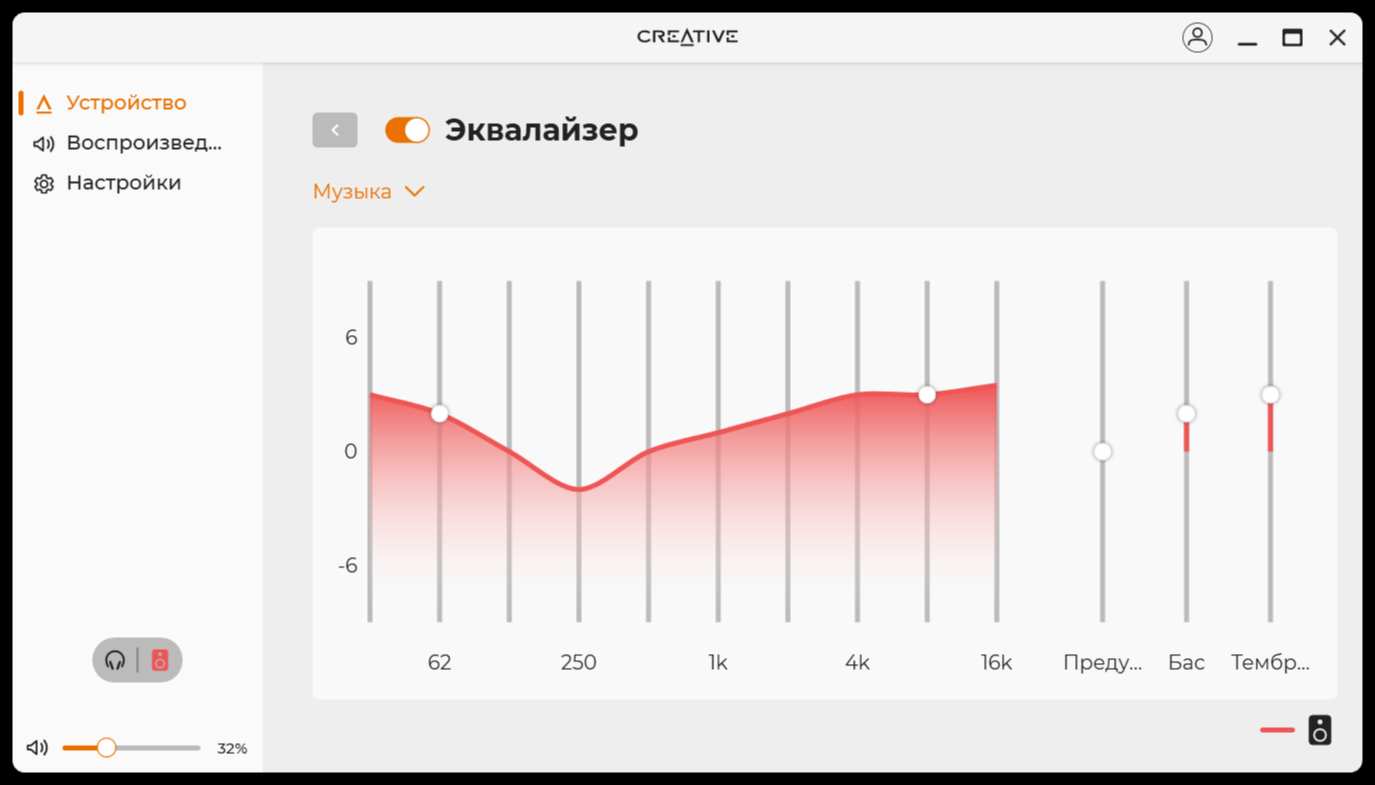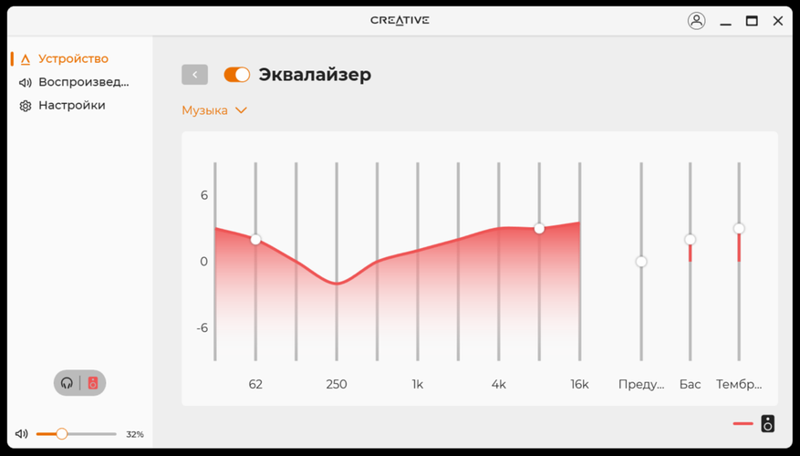 По большому счёту, программное обеспечение похоже на то, что поставляется к разного рода колонкам или наушникам. Кроме того, подобное ПО есть почти к каждому устройству Creative. После установки и запуска, сразу все полезло обновляться, включая прошивку. В нём есть базовая необходимая функциональность по настройке звука и в целом устройства. Я бы сразу начал с настройки эквалайзера или, хотя бы, использования готового профиля «музыка».