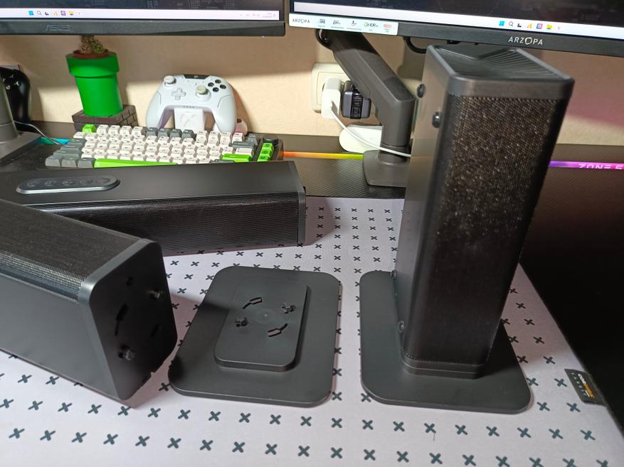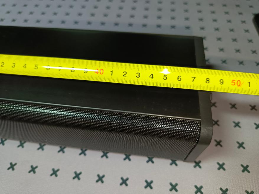 Боковые колонки можно устанавливать вертикально с помощью подставок или закрепить на стене, как и центральную часть. Длина маленькой колонки составляет 21 см, большой — 48 см. В собранном виде общая длина саундбара достигает 90 см.