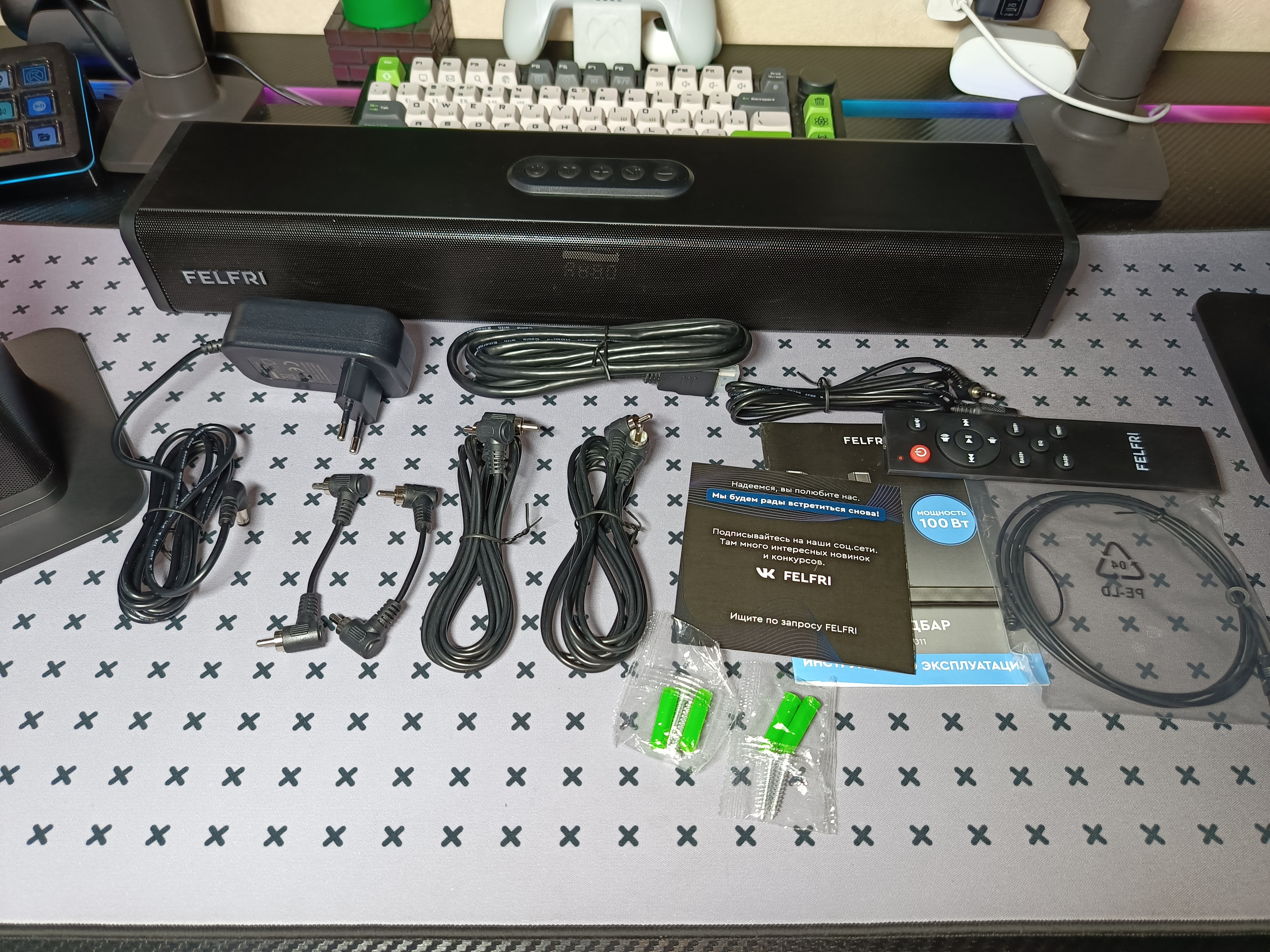 Данная модель может похвастаться тремя типами подключения, а также воспроизведения с флешки или со смартфона, используя саундбар как беспроводную колонку. Хорошая комплектация, которая включает в себя всё, что может понадобиться, даже оптический кабель длиной 1,5 метра, но почему-то две батарейки формата ААА для пульта ДУ не положили. Кстати, пульт полноразмерный, кнопки большие.