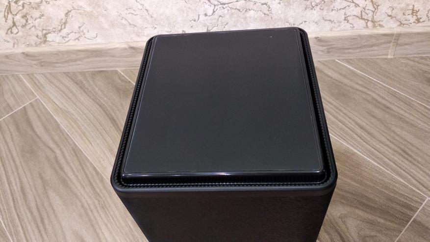 Сабвуфер выполнен в том же стиле, что и фронтальная колонка. Было бы странным, будь это иначе. Верхняя часть корпуса немного отличается, она глянцевая, защищенная пленкой. Логотип в нижней части никуда не делся.