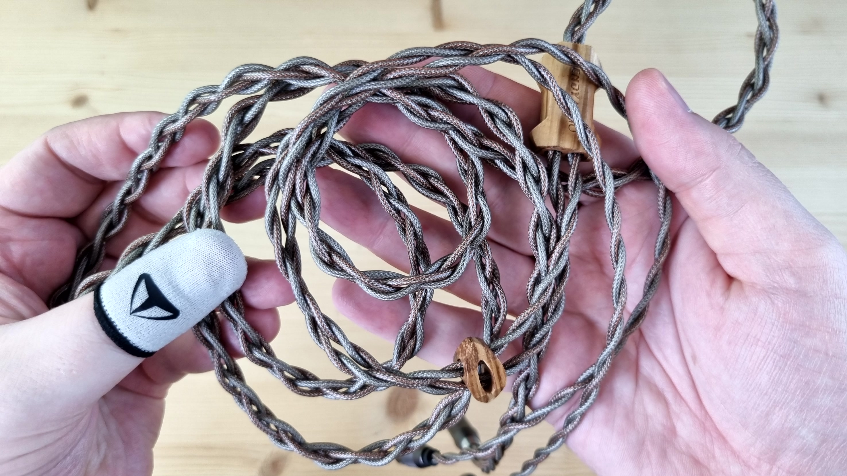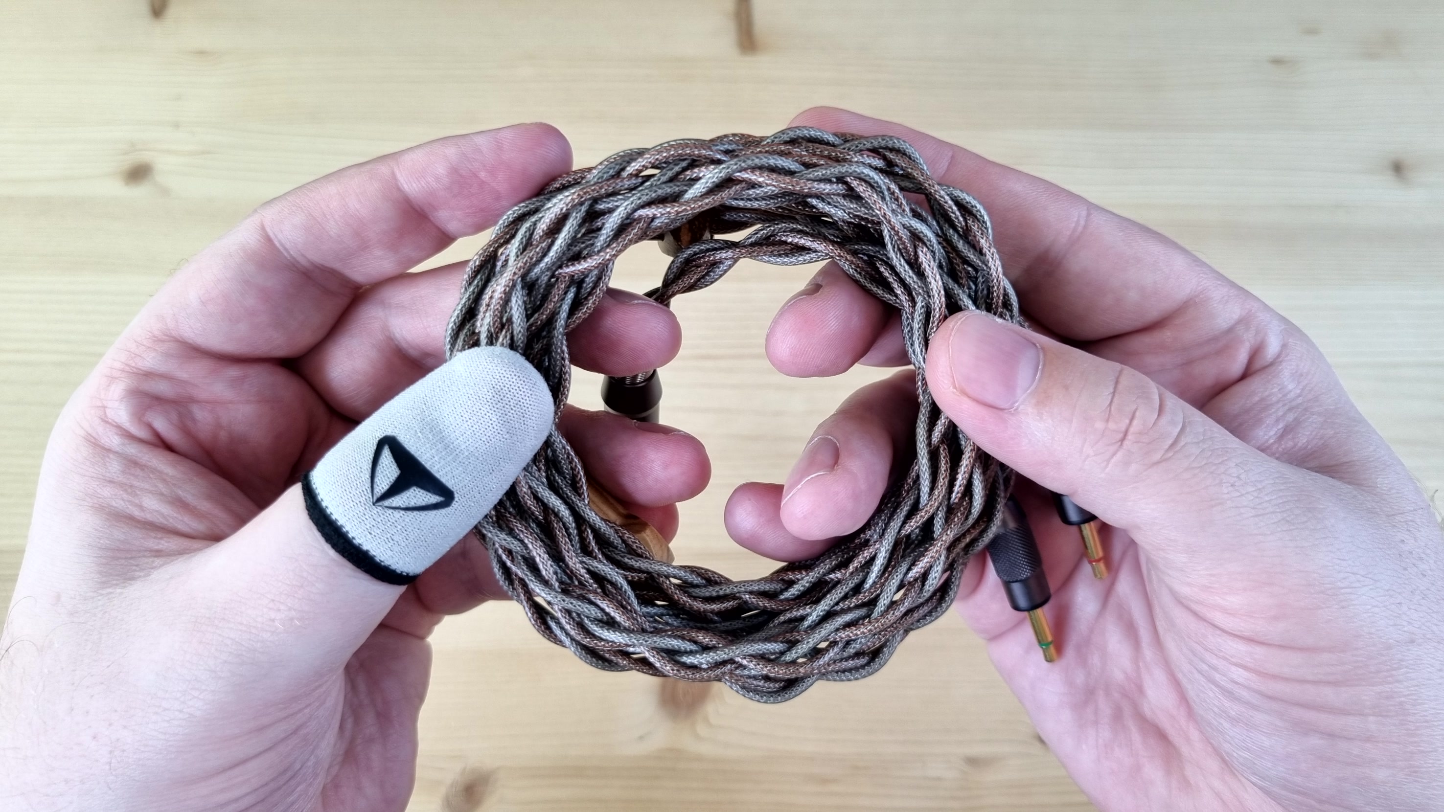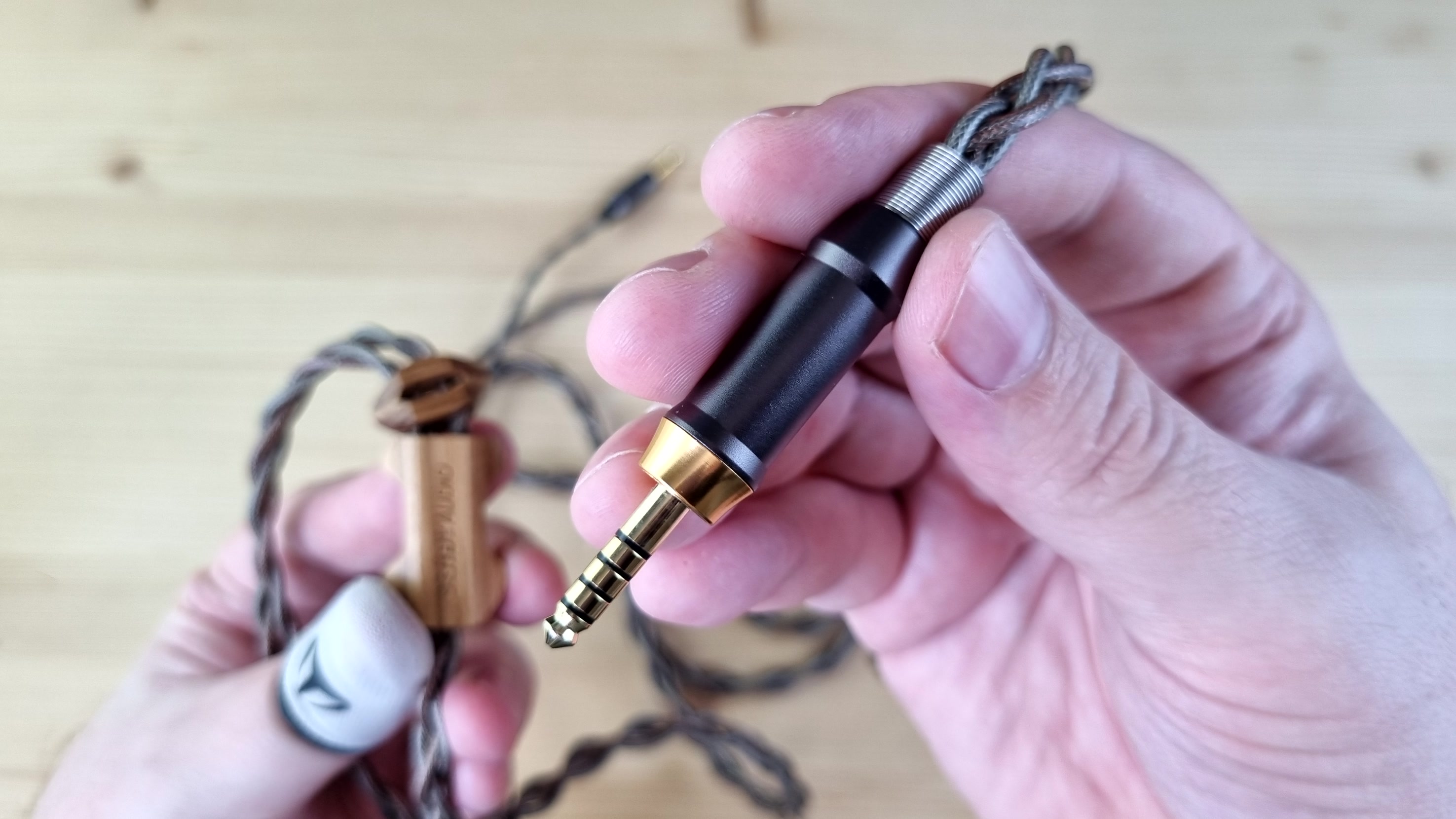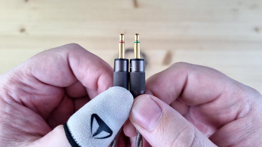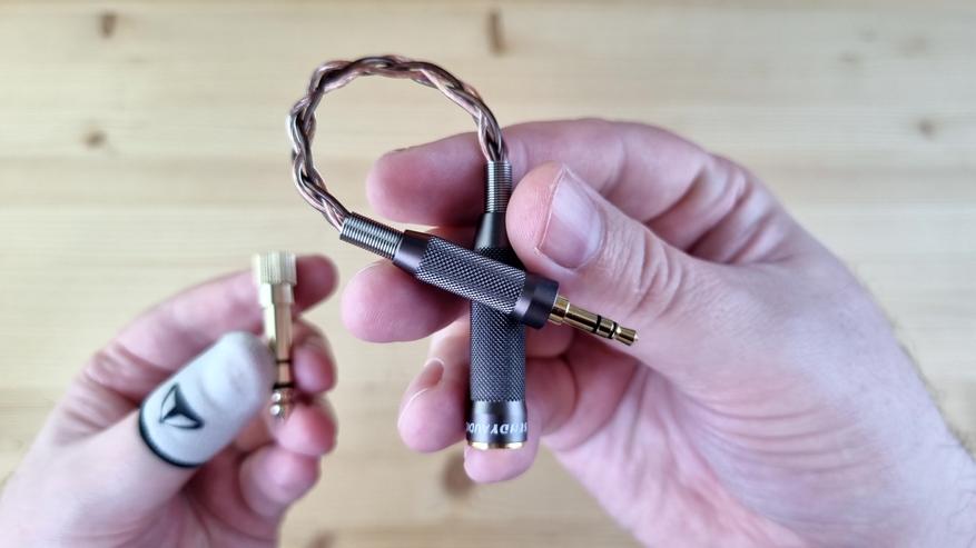 Кабель внешне просто бомба, он толстый, длинный, плетёный, из какой-то сверхчистой меди, сразу на 4.4 мм, да ещё и с большими деревянными вставками. По сопротивлению это примерно 0.2 Ома на каждой из жил. Слушал модель как с ним, так и со старым кабелем от Aiva 2 — оба варианта мне понравились.