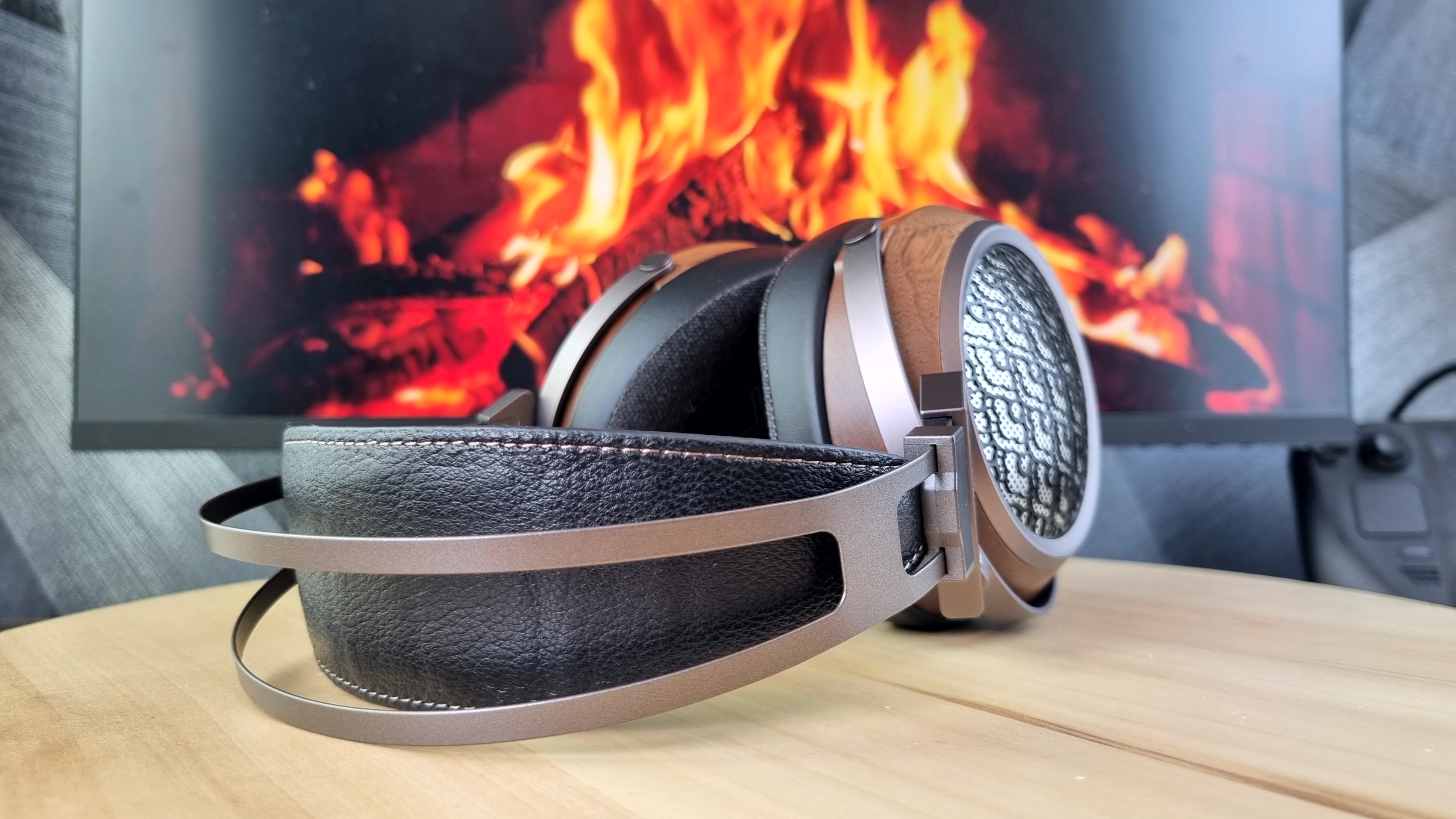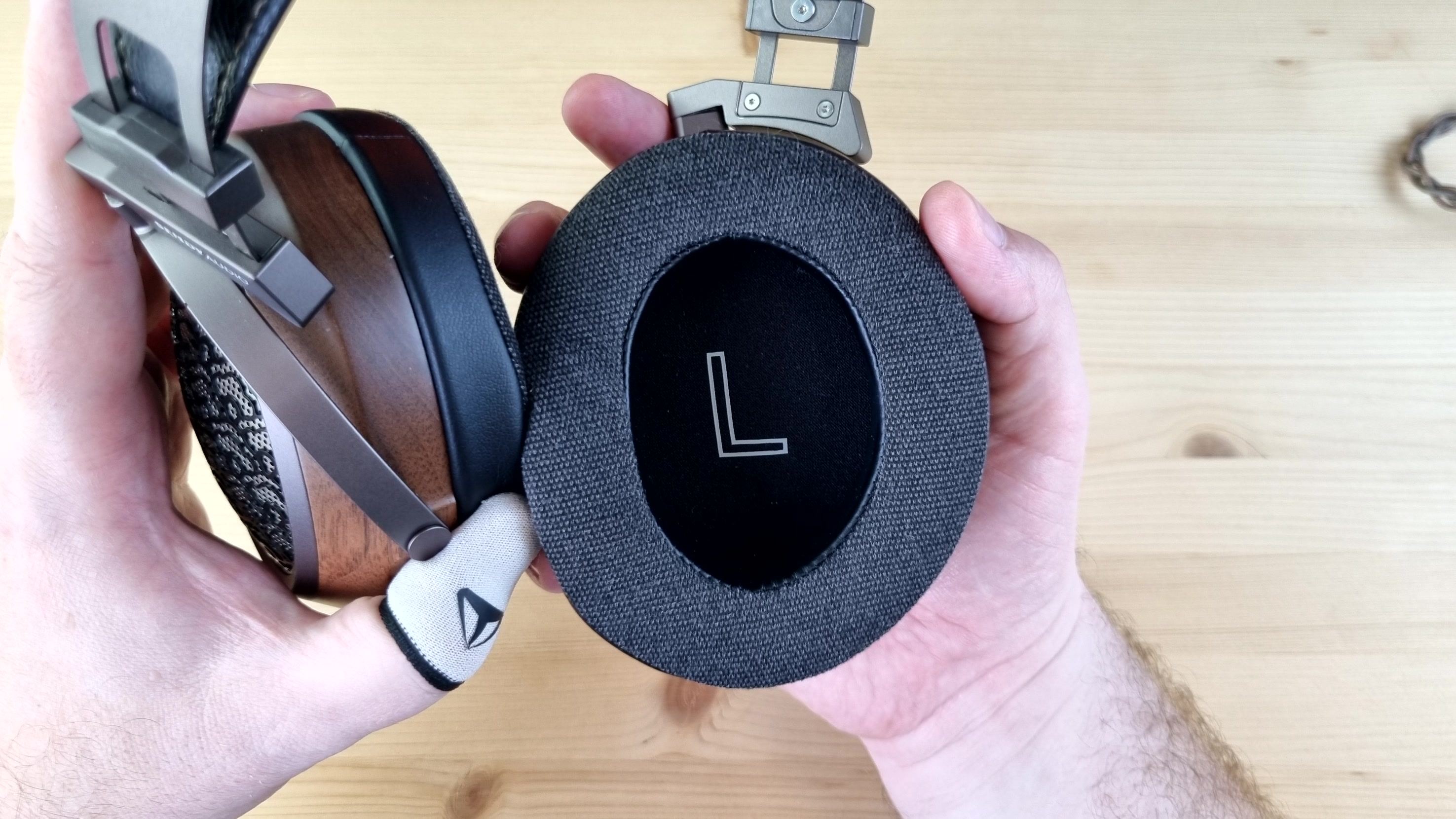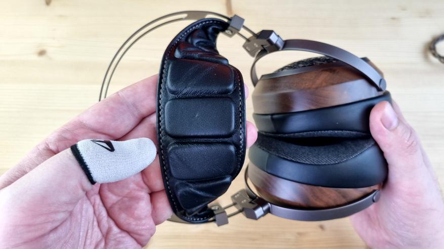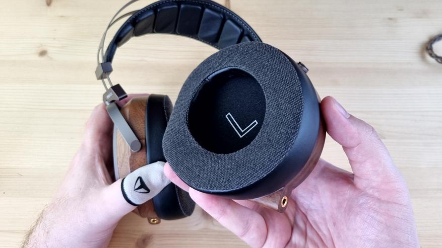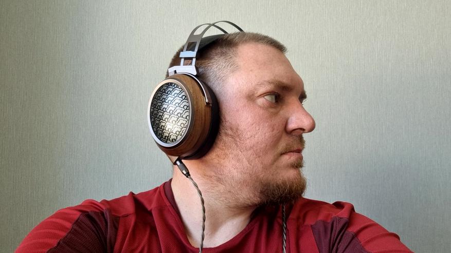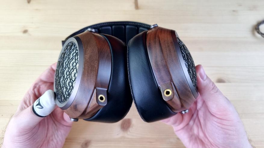 Амубшюры большие, вместительные, на матерчатой основе и с мега комфортным прижимом к голове. Даже лучше, чем было в Aiva 2. При этом вес всей конструкции составляет те же 400 с копейками грамм. Понравилась практически полная акустическая прозрачность, незначительное запотевание ушей и две степени свободы, каждая примерно по 45 градусов.