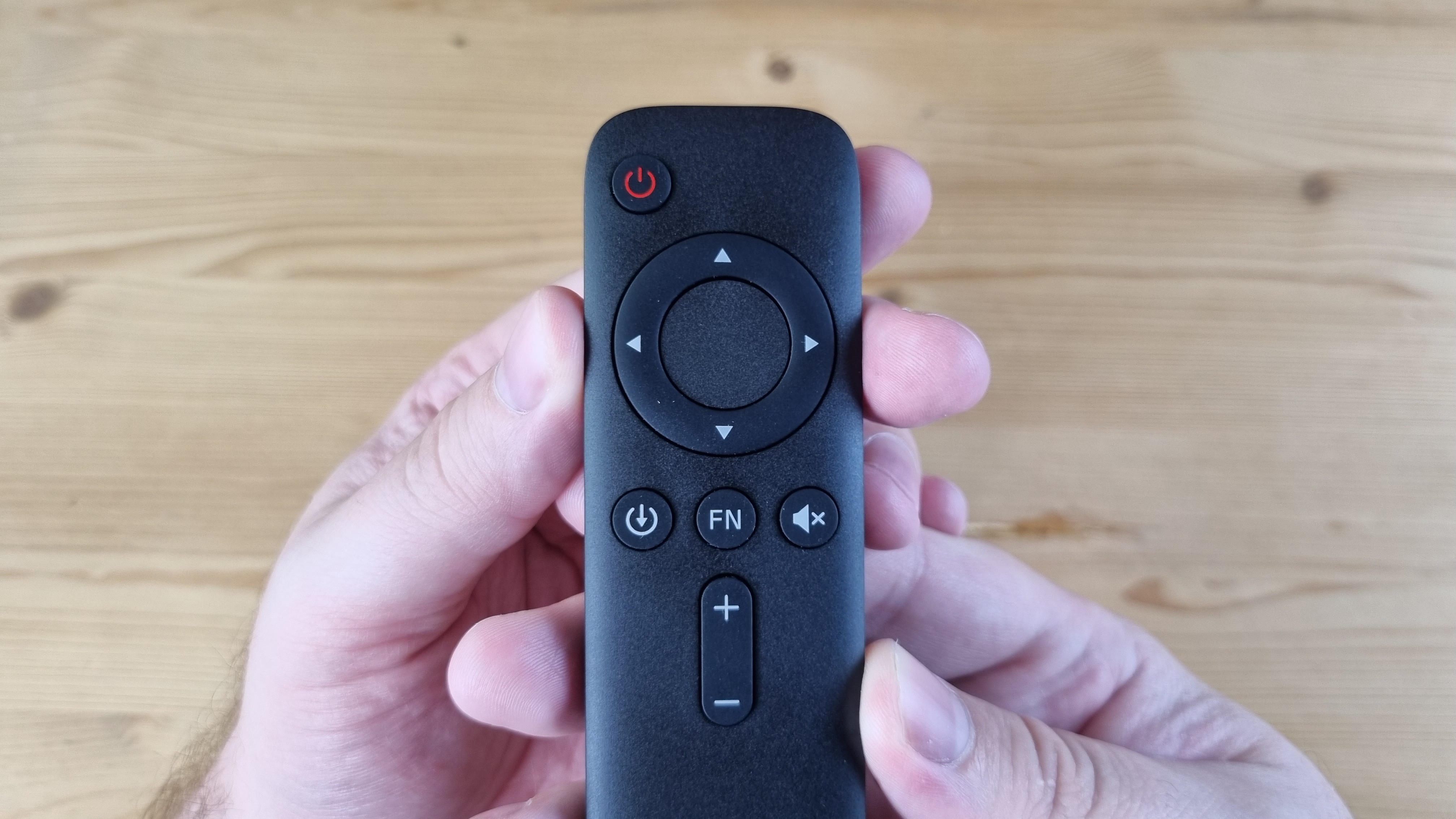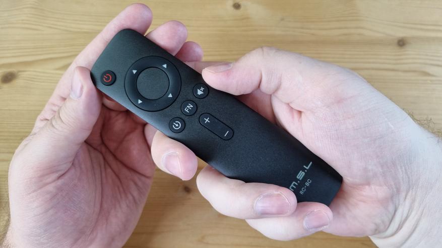 Пульт, как всегда, матовый, с прорезиненными кнопками и питанием от батареек. Из функционала на него вынесли включение-отключение устройства, режим «mute», регулировку уровня сигнала, переключение входов и навигацию по системному меню.