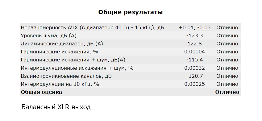 В результате получил все графы в положении «отлично», за единственным исключением: неравномерность АЧХ на XLR заметно лучше, чем на RCA. Впрочем, и это в пределах допустимого.
