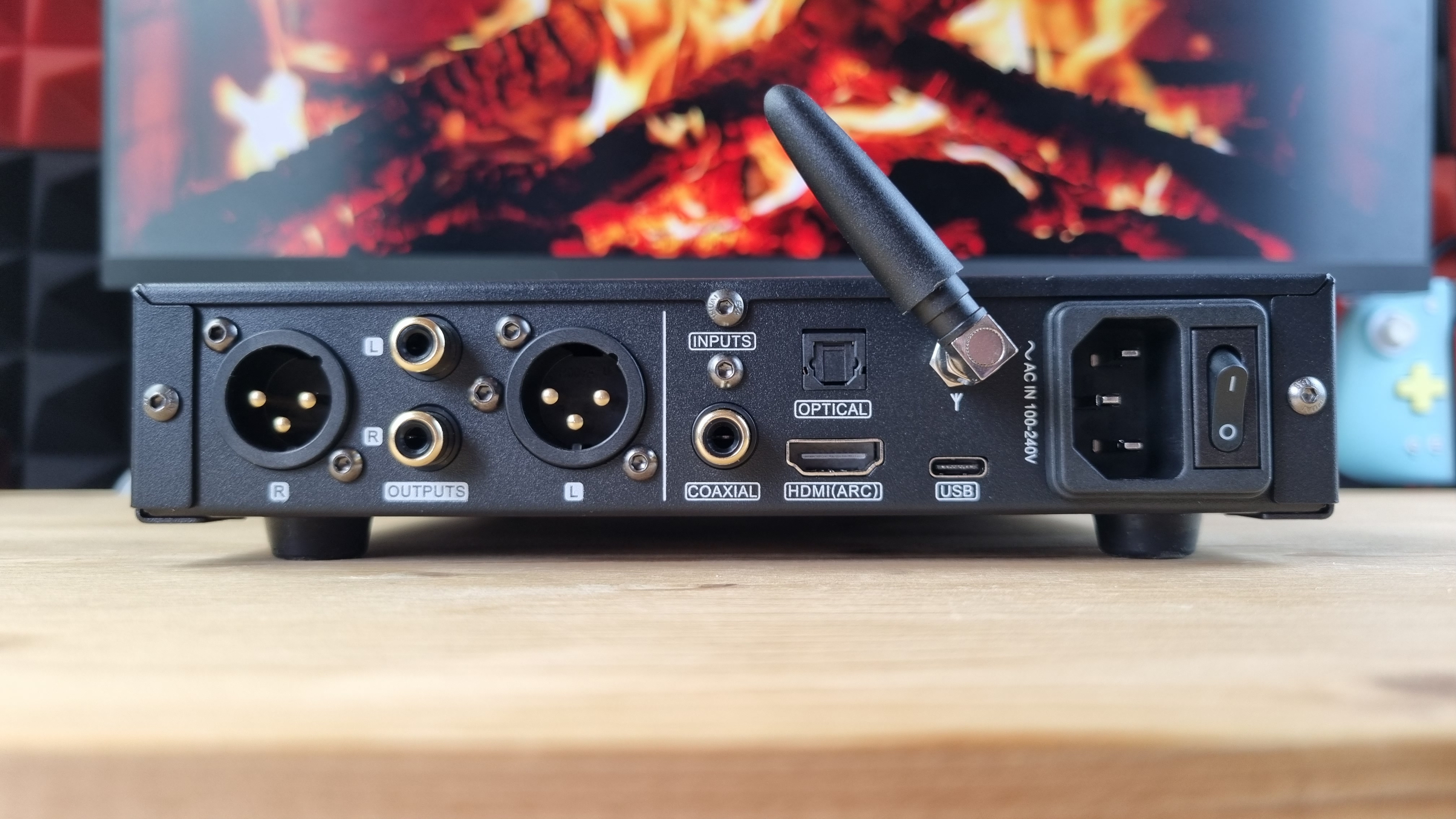 Фиксируется он на четырех прорезиненных ножках, а сзади имеет две секции: для входов и выходов. К первым можно отнести стандартные USB, блютуз, оптику и коаксиал, а также протокол Arc на HDMI разъеме, ну, а из выходов — всеми любимые RCA и балансные XLR.