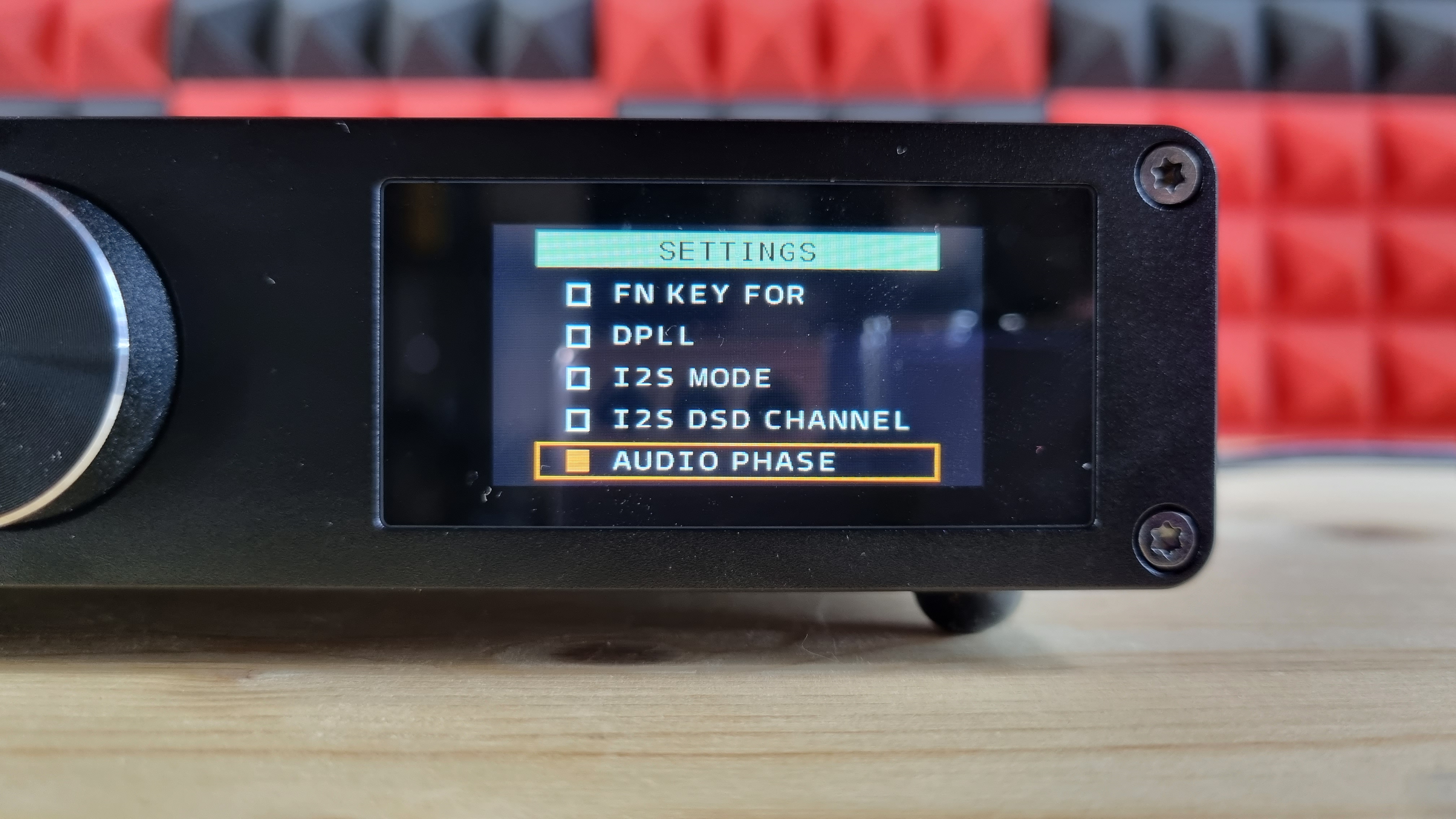 В меню все по-прежнему, здесь можно выбрать один из 6 входов и один из 3 вариантов выхода, любой из 3 цифровых фильтров для PCM, один из 10 вариантов окраса звучания, установить фиксированную громкость, назначить кнопку Fn, откорректировать джиттер, определить для себя значения I2S, выбрать направление фазы, установить время отключения экрана и его яркость, а также сбросить все настройки до значений по умолчанию.