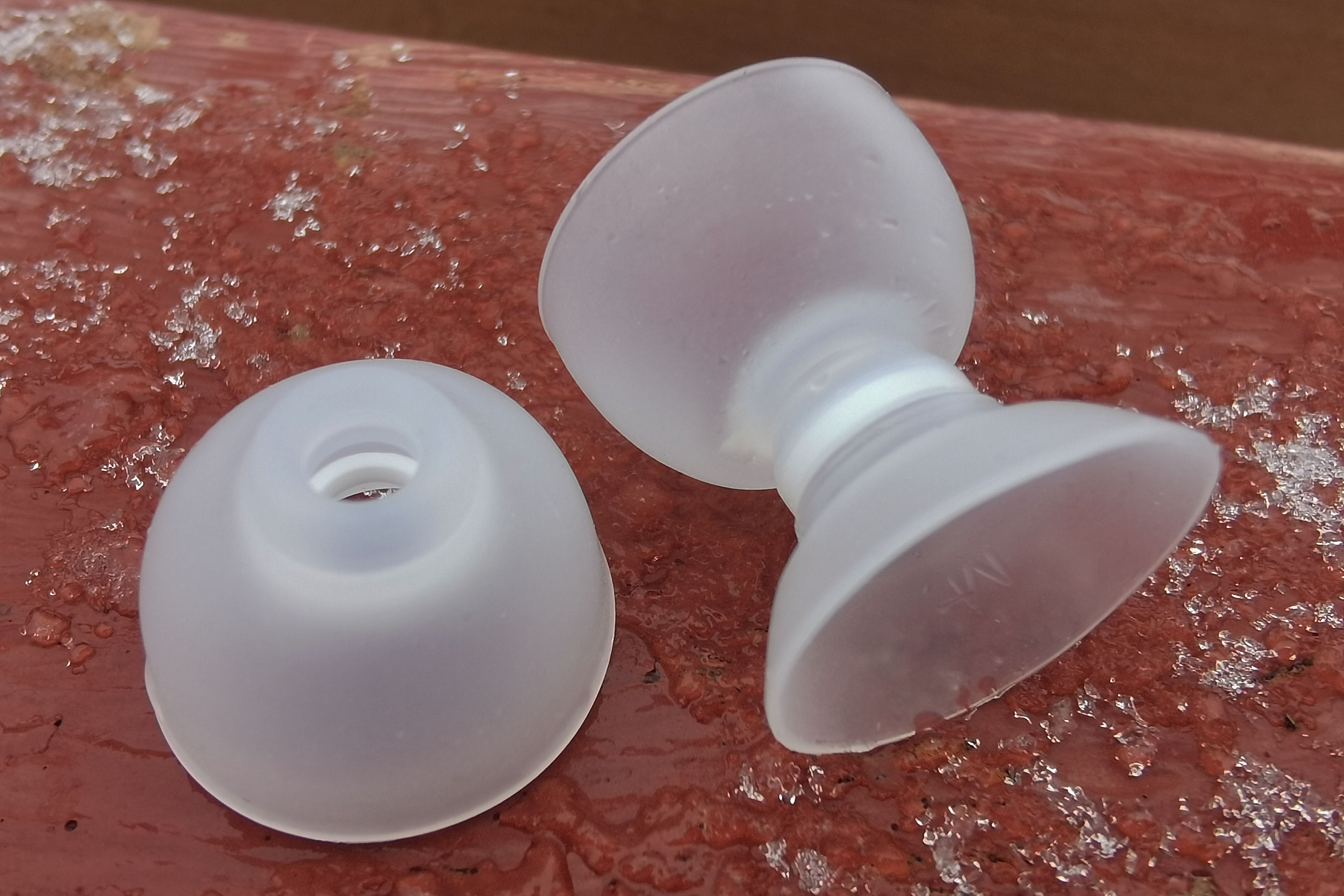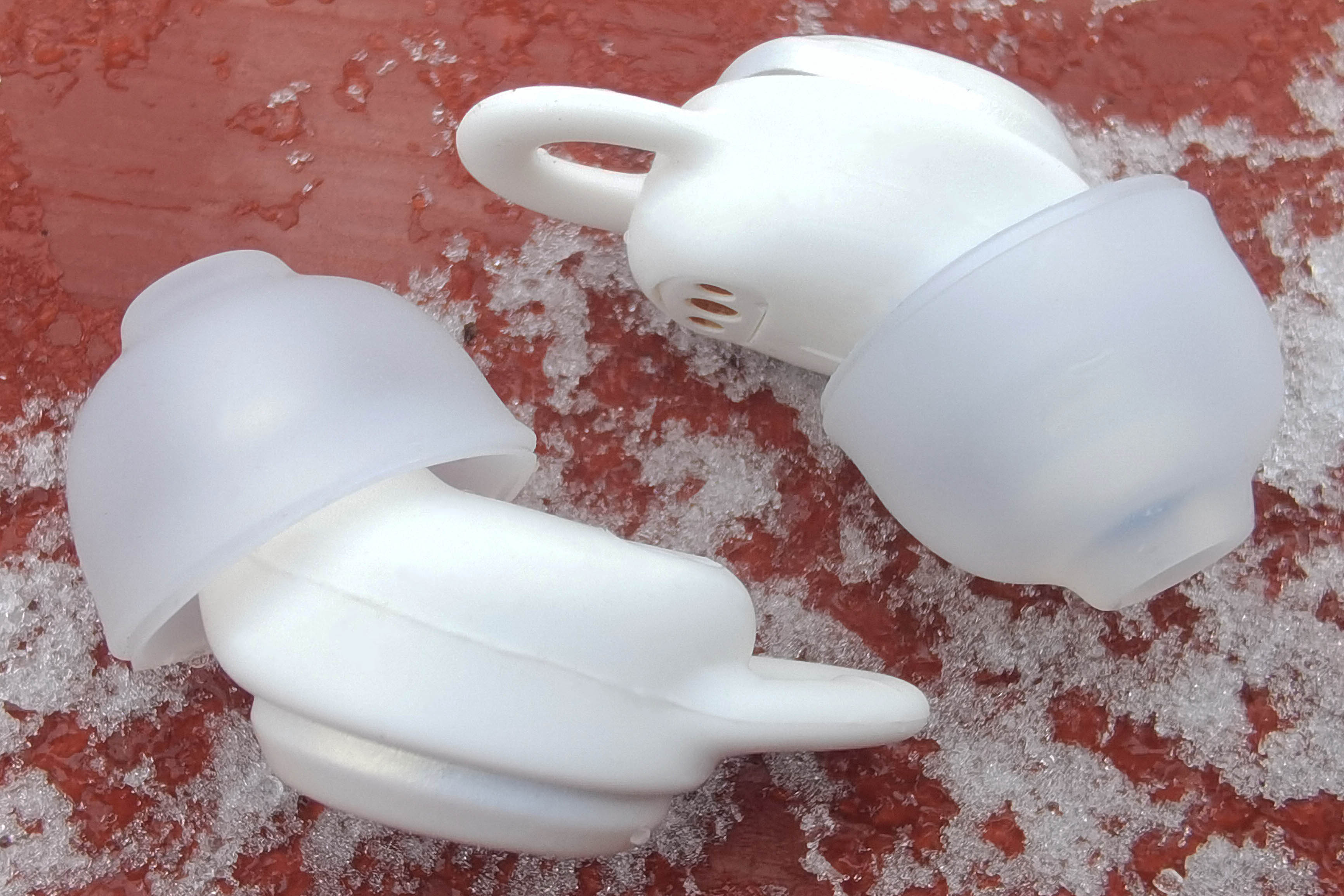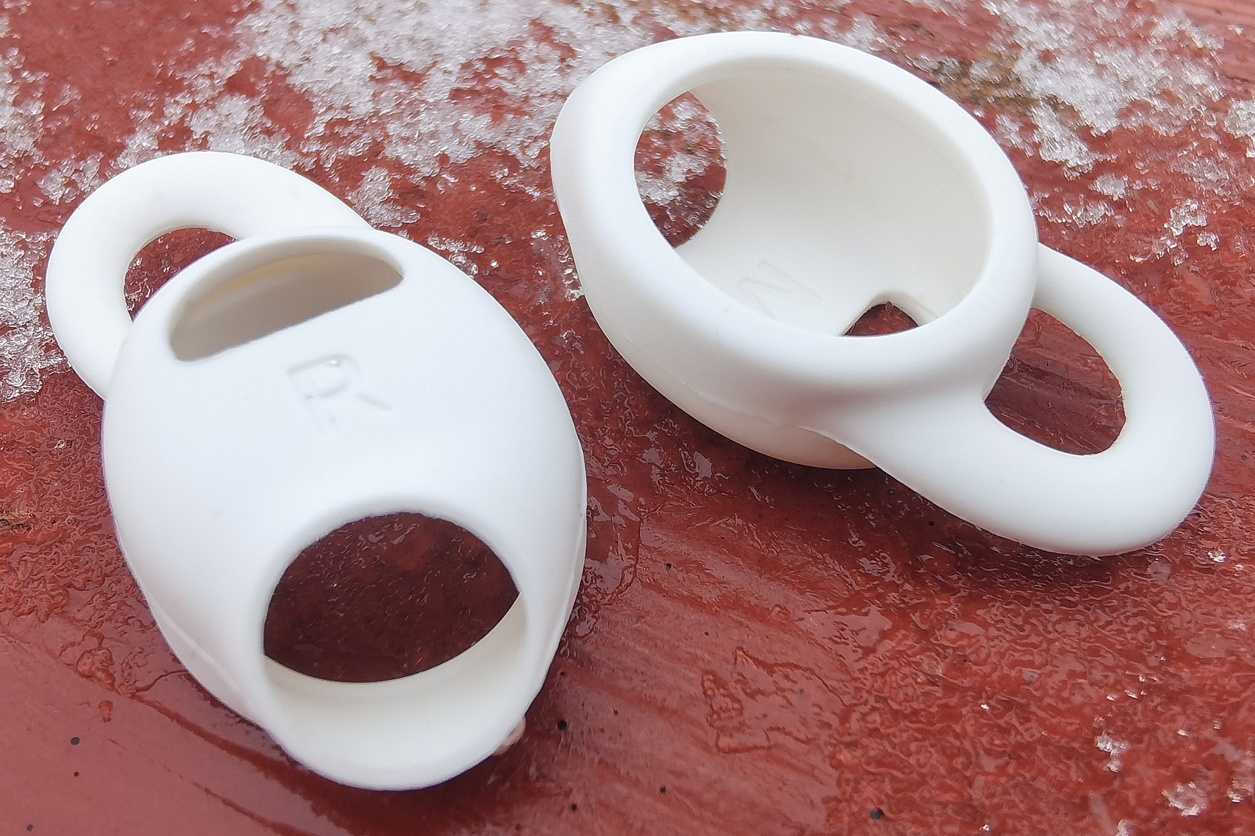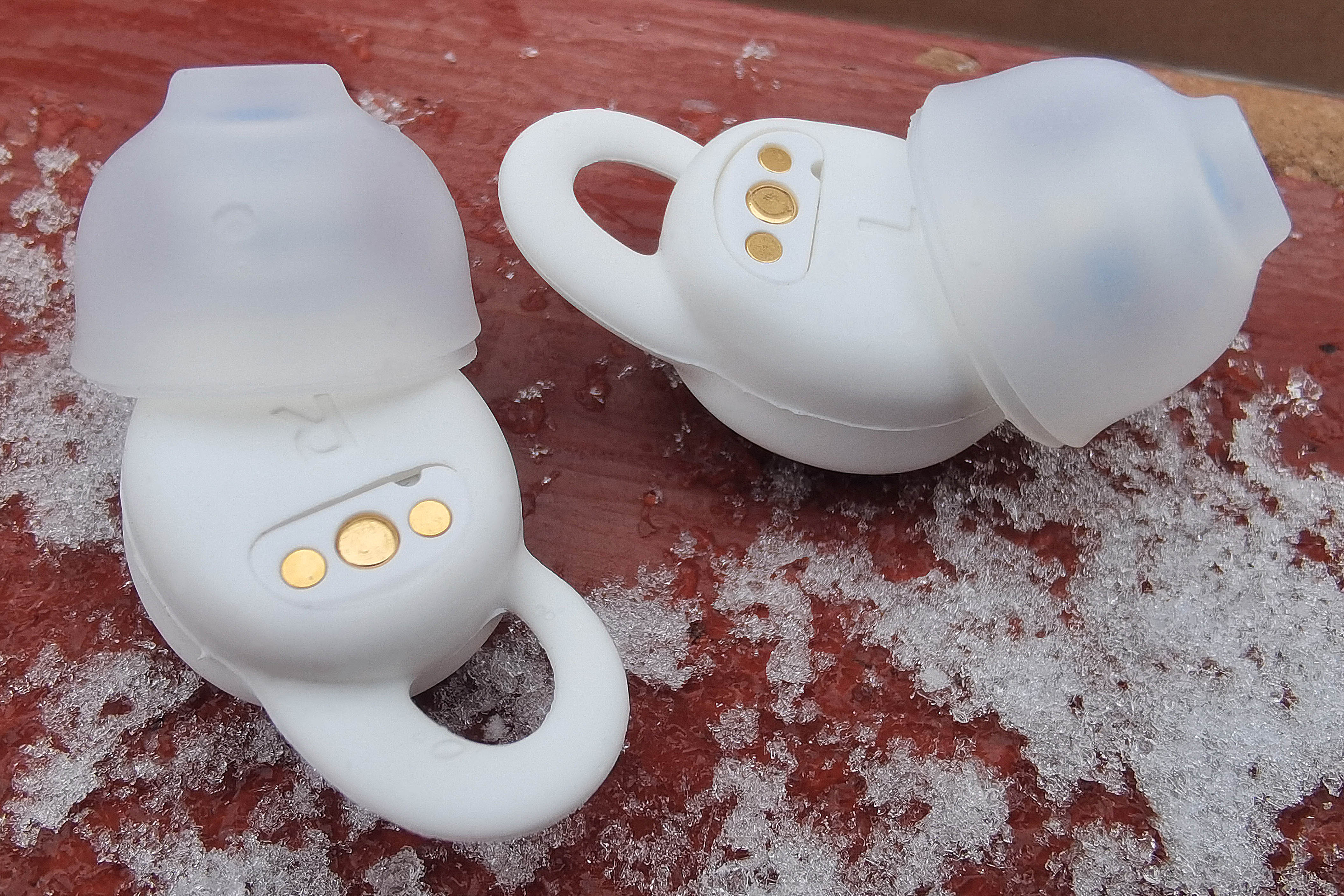 Двойные амбушюры, специально разработанные для этой модели, выполнены из полупрозрачного упругого силикона и обеспечивают гораздо лучшую пассивную шумоизоляцию, чем классические. Накладки же представляют собой белый силиконовый чехол, в который вставляется корпус наушников. Благодаря ему Sleep A10 комфортнее располагаются в ухе. Чтобы не перепутать, какому наушнику какая накладка соответствует, здесь также присутствует обозначение.