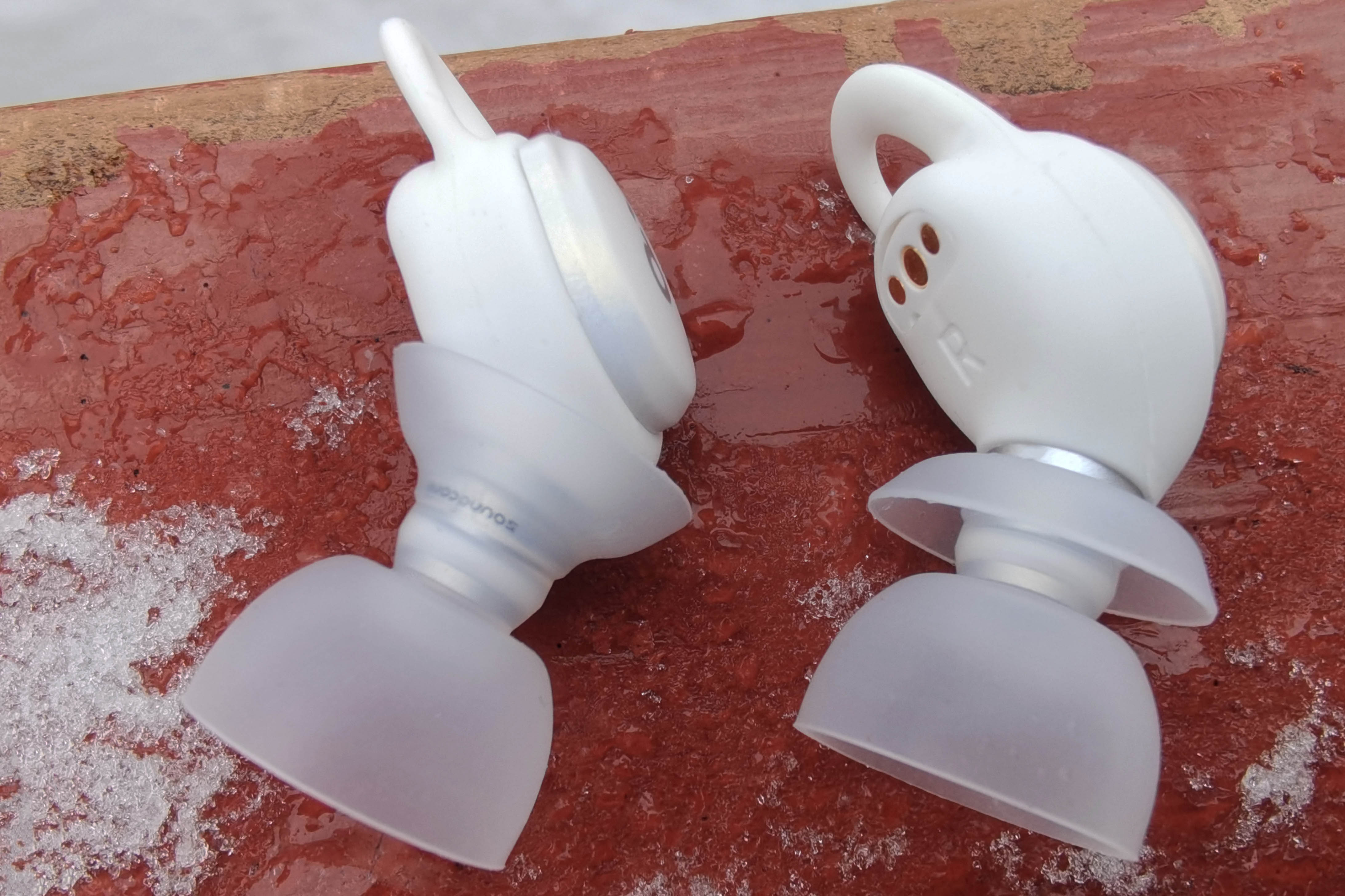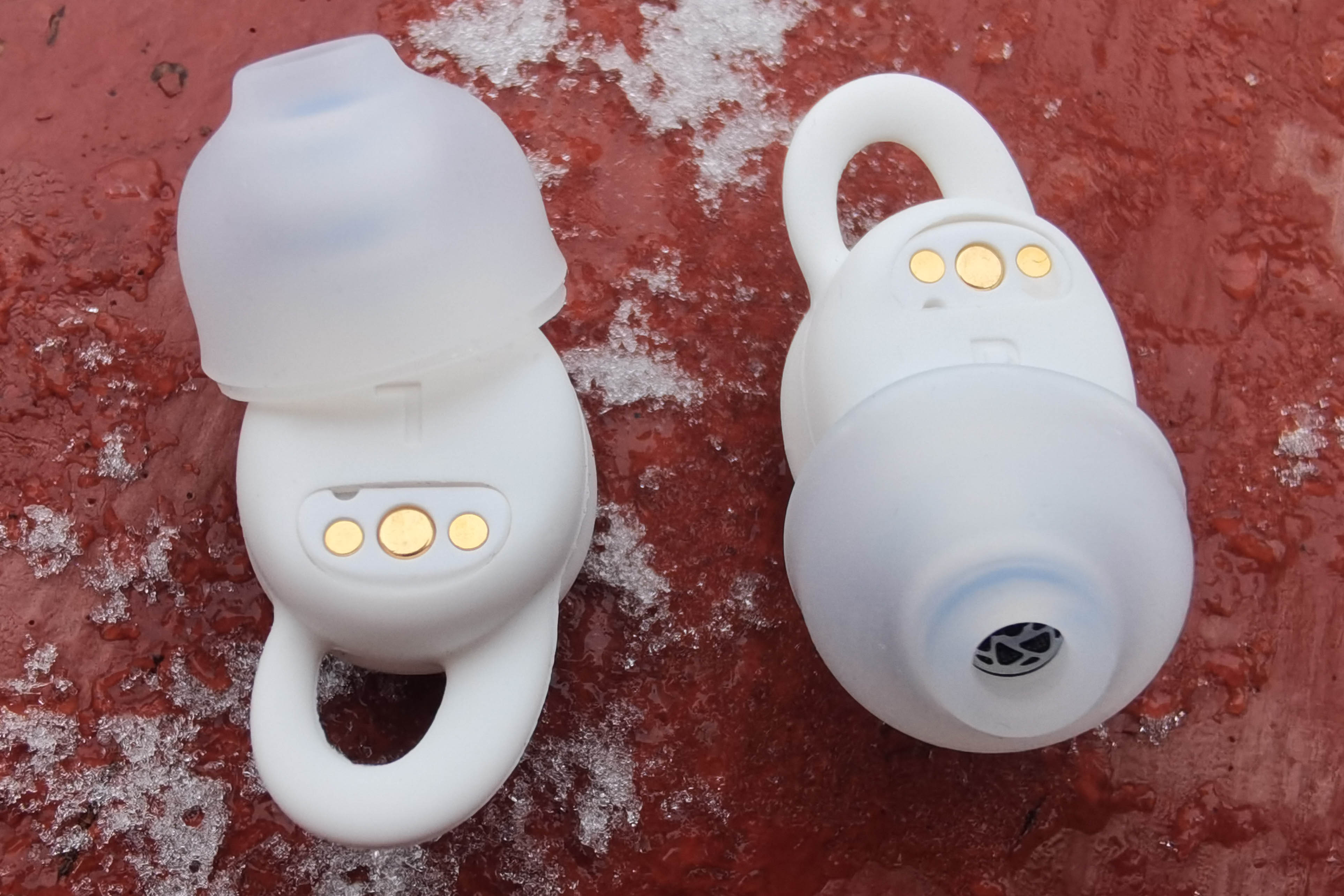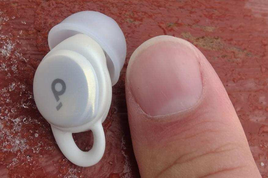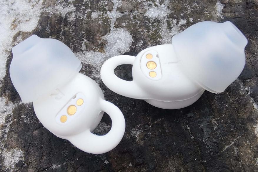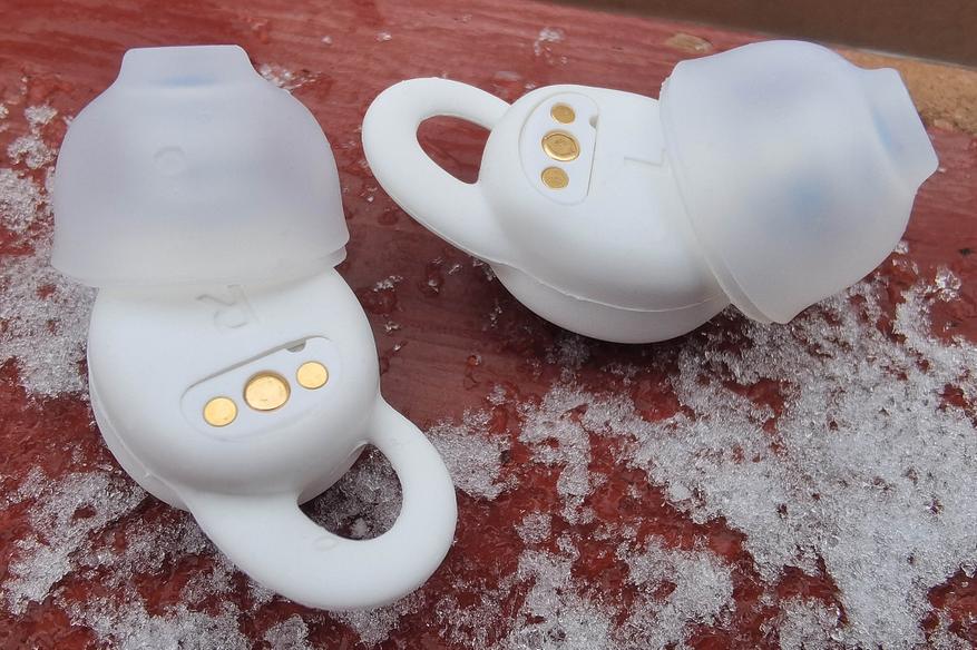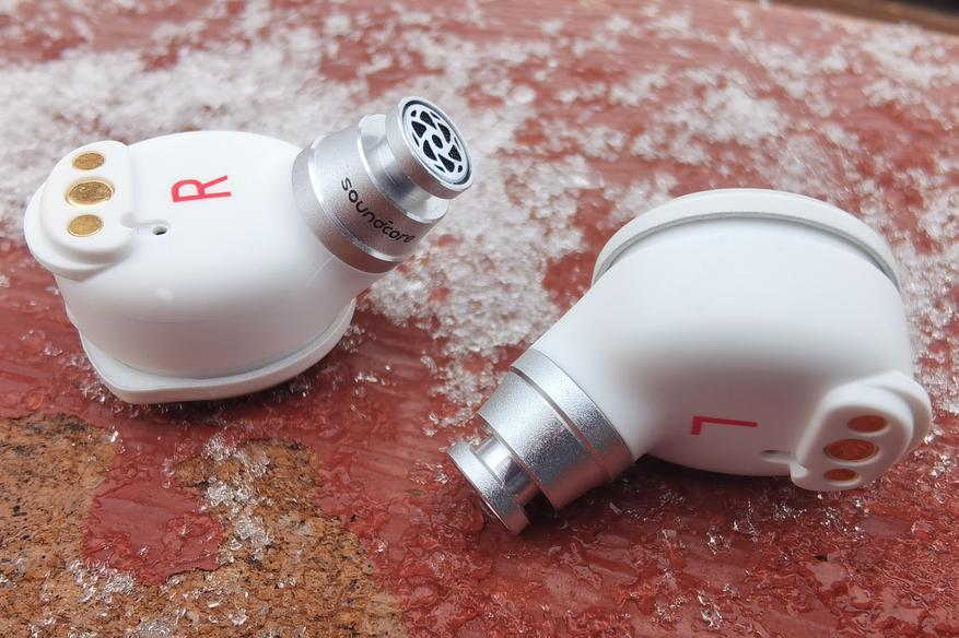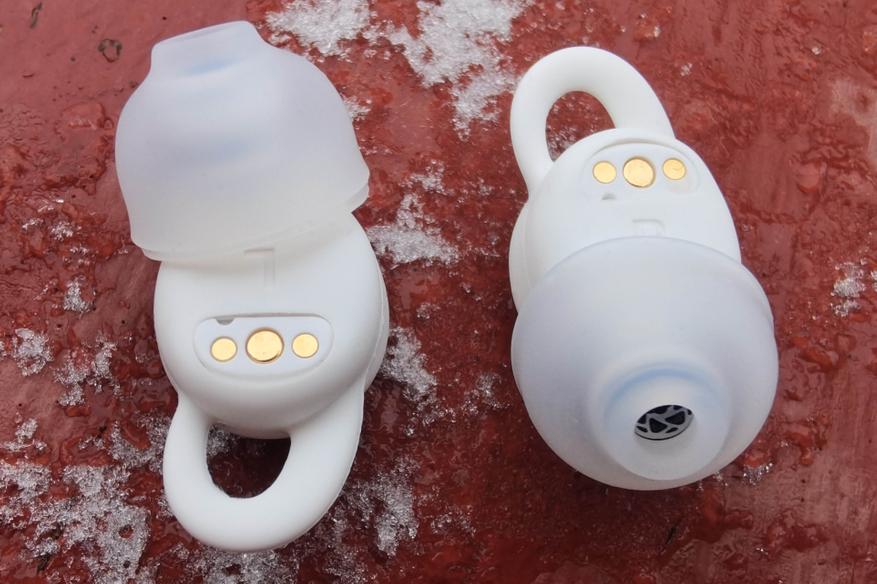 Внешняя серебристая поверхность с логотипом используется для управления постукиванием. С противоположной стороны находятся магнитные контакты, маркировка «R"/"L», а также отверстие микрофона, который используется исключительно для улавливания проникающего шума. Направленный вбок звуковод имеет широкий бортик, надежно удерживающий амбушюр, а от попадания внутрь грязи защищает фигурная металлическая пластинка.