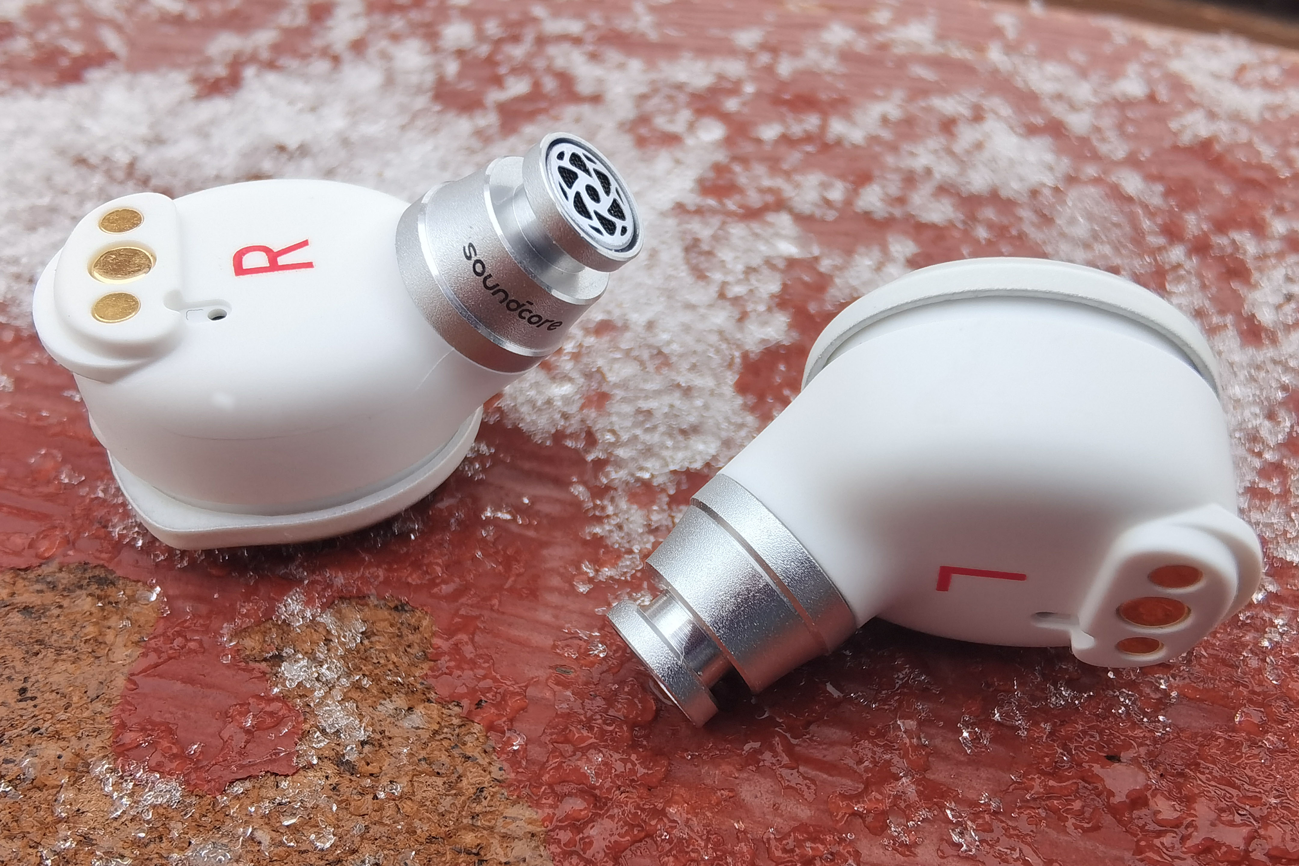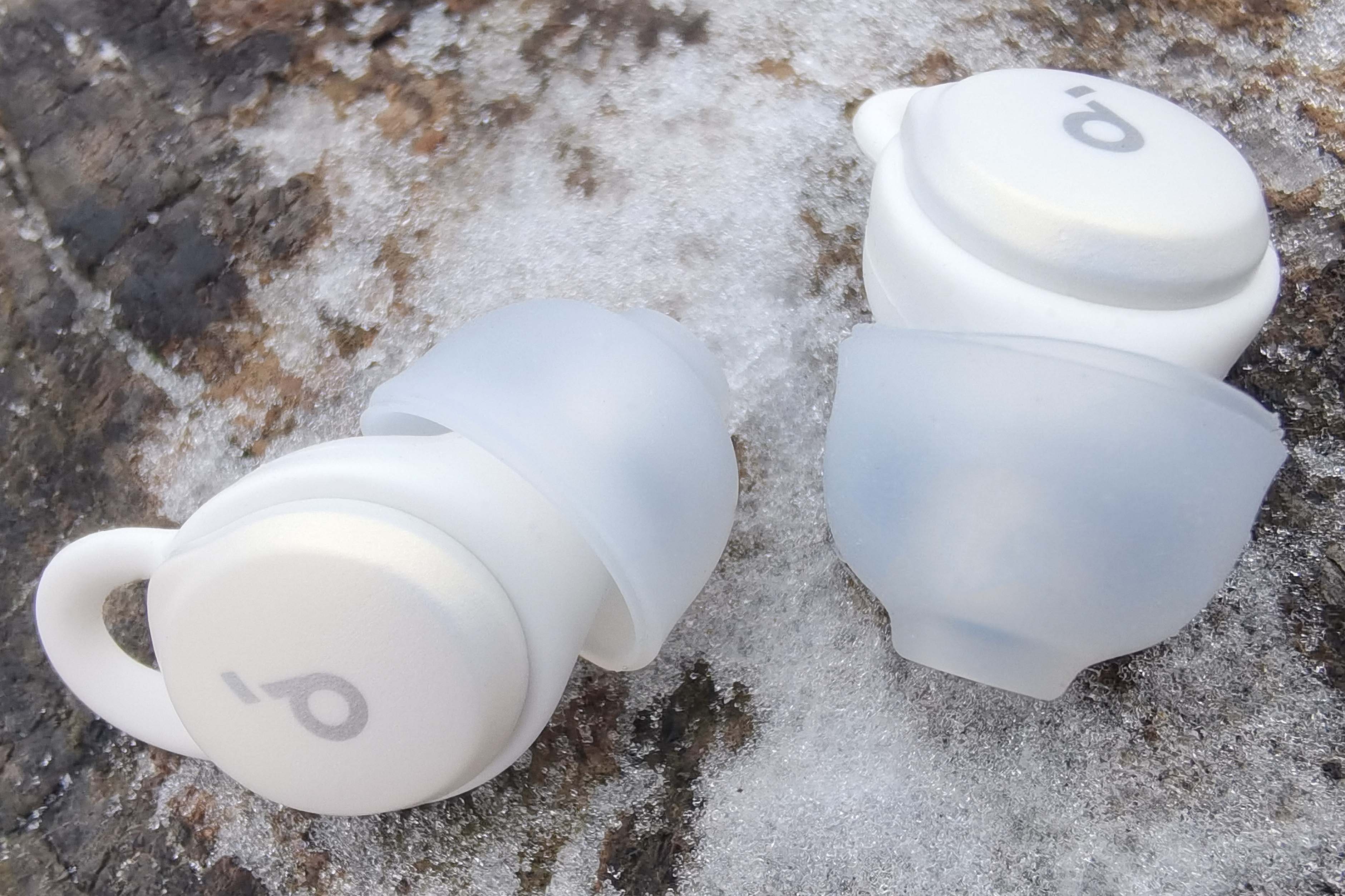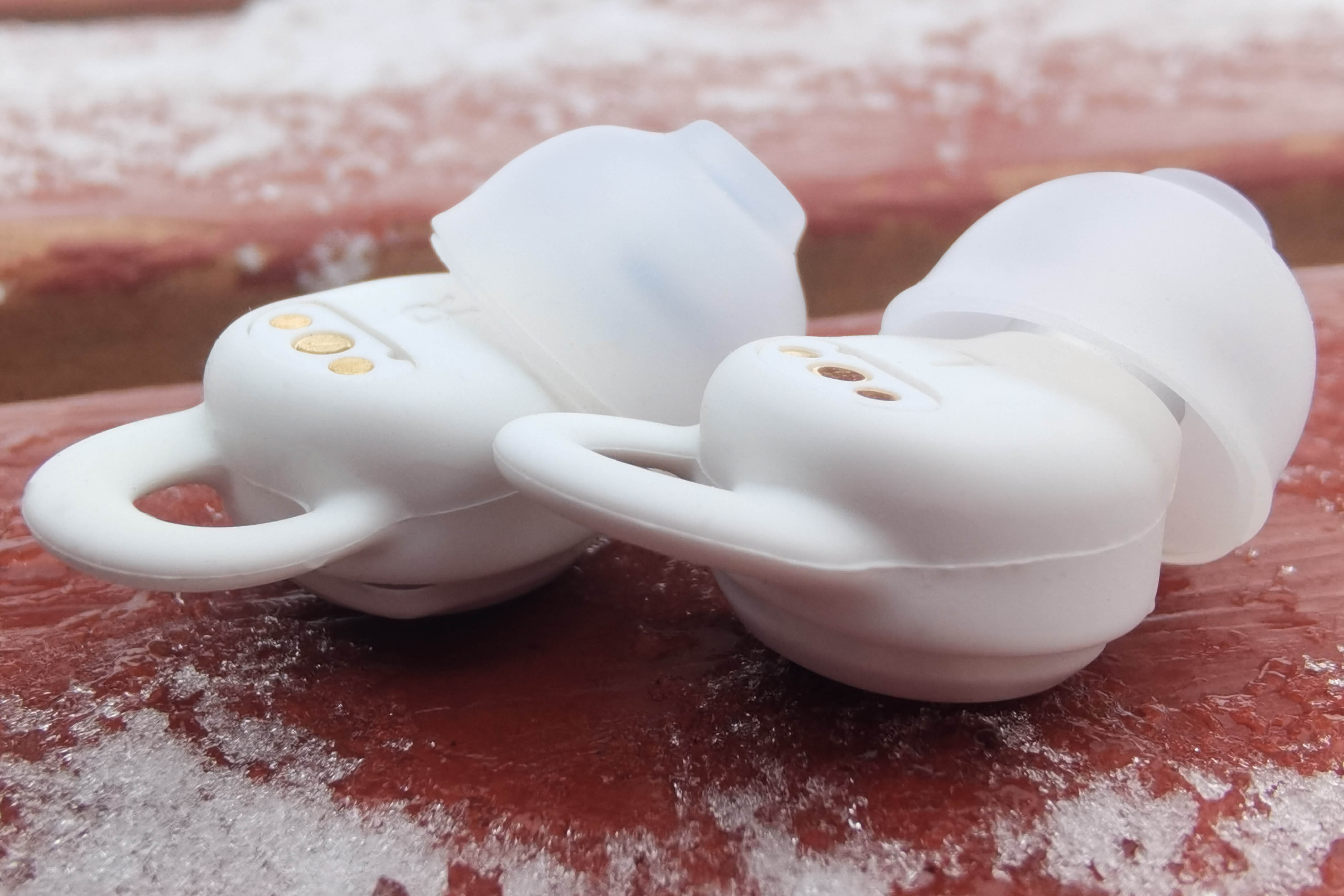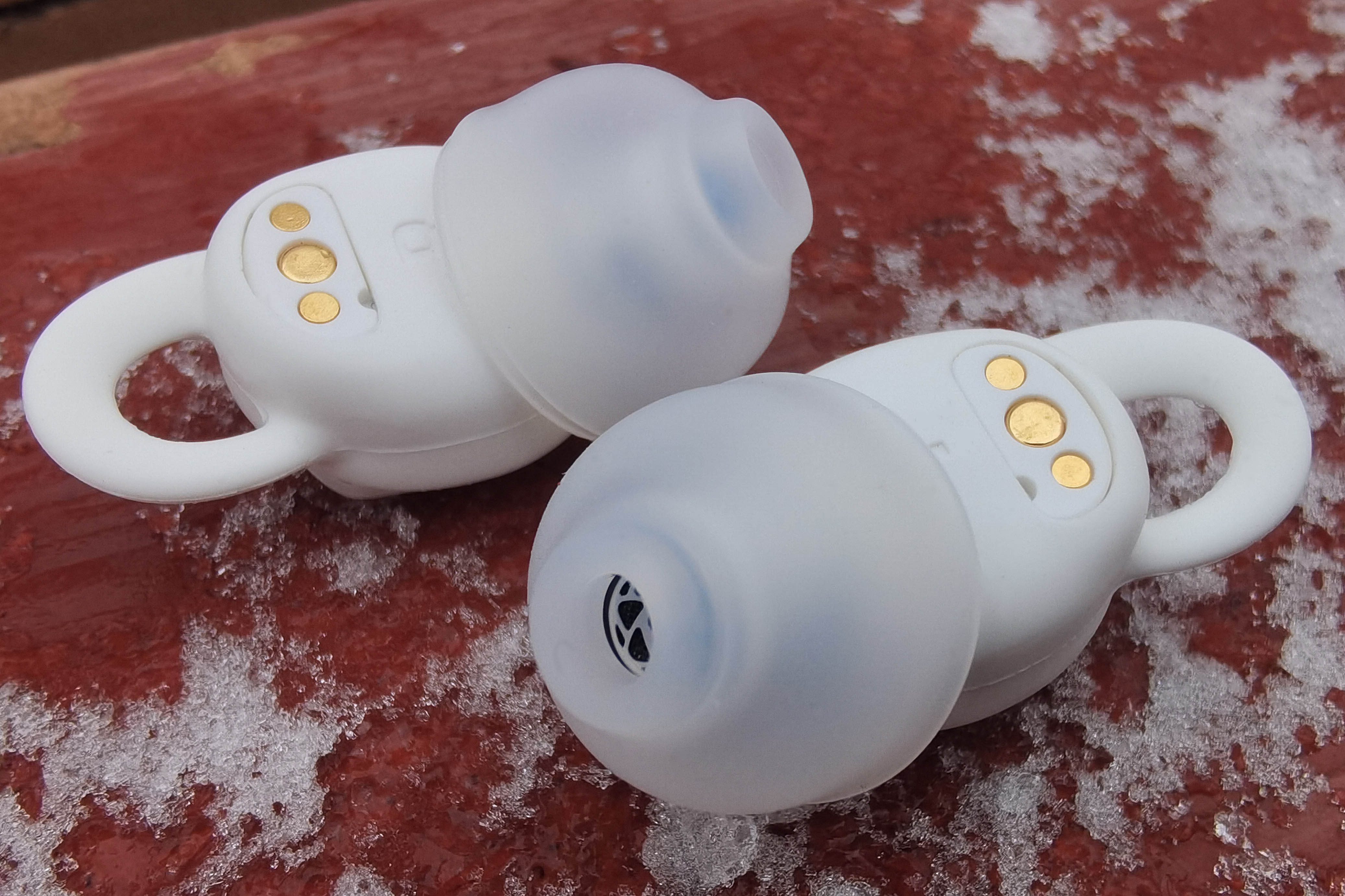 Внешняя серебристая поверхность с логотипом используется для управления постукиванием. С противоположной стороны находятся магнитные контакты, маркировка «R"/"L», а также отверстие микрофона, который используется исключительно для улавливания проникающего шума. Направленный вбок звуковод имеет широкий бортик, надежно удерживающий амбушюр, а от попадания внутрь грязи защищает фигурная металлическая пластинка.