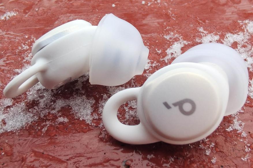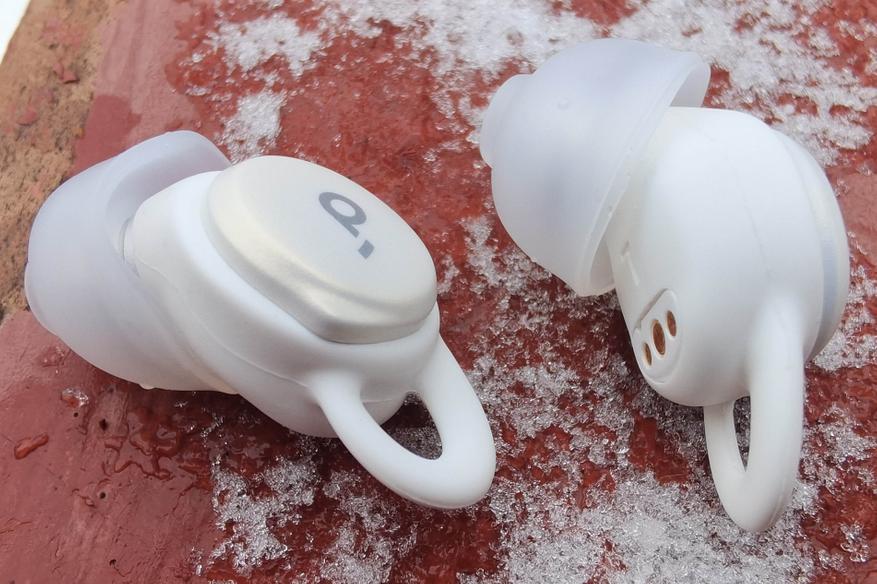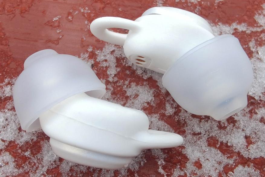 Две пары из трех имеют небольшое ушко, которым наушники цепляются за завиток ушной раковины. Такая конструкция не дает им выпасть даже во время беспокойного сна, а благодаря глубокой посадке, ничто не помешает лежать на боку. Разнообразие амбушюр и накладок позволяет каждому пользователю подобрать оптимальное для себя сочетание. Соответствие стандарту IPX4 обеспечивает защиту от дождя, если будите использовать гаджет на улице. Качество изготовления вопросов не возникает: все швы выполнены аккуратно.