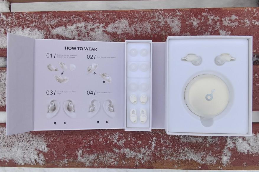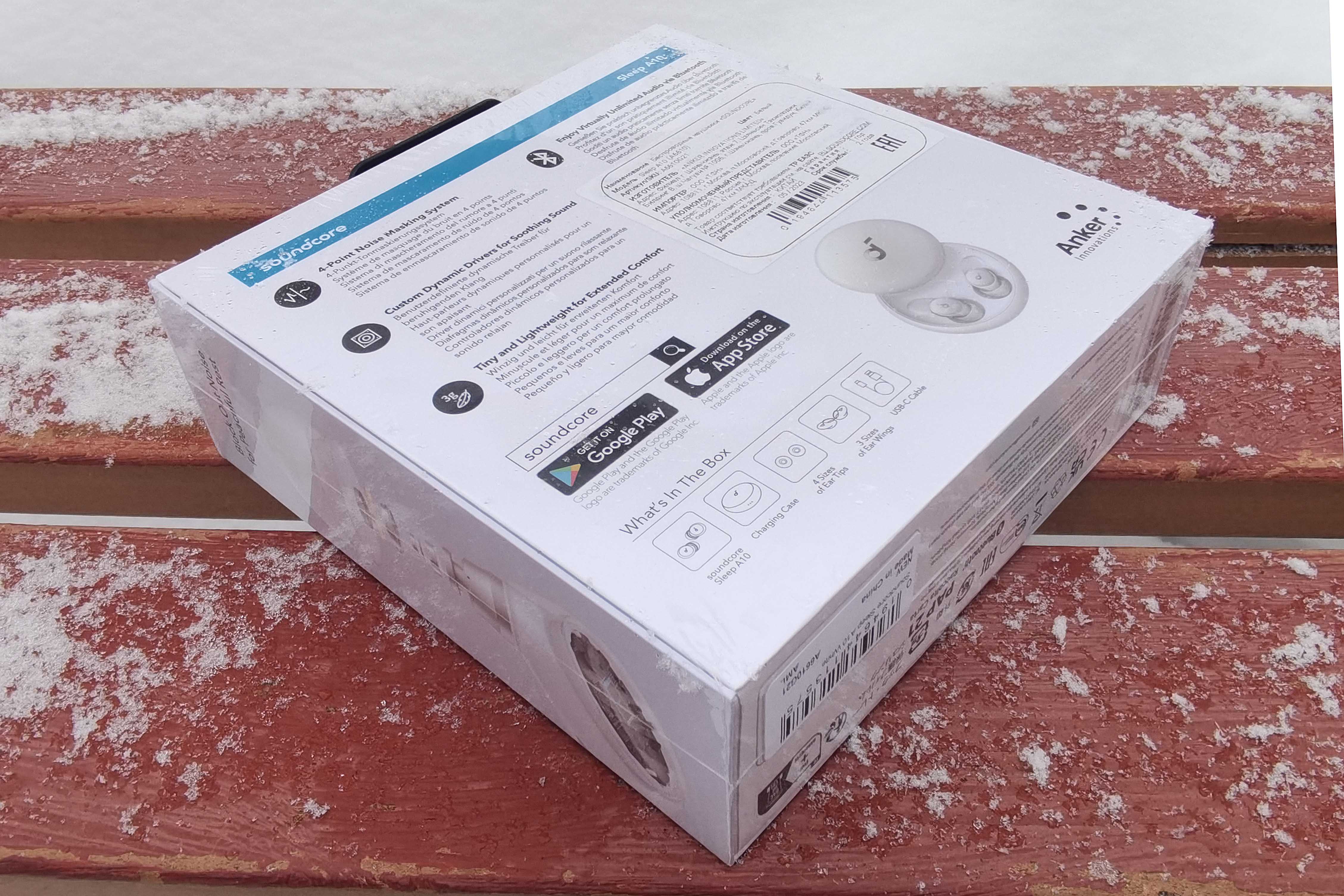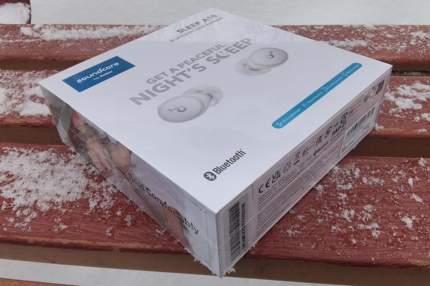 Sleep A10 поставляется в презентабельной коробке-книжке из толстого белого картона, украшенной описанием различных «фишек» продукта. С внутренней стороны на крышке приведена схема правильной установки гаджета в ушной канал.