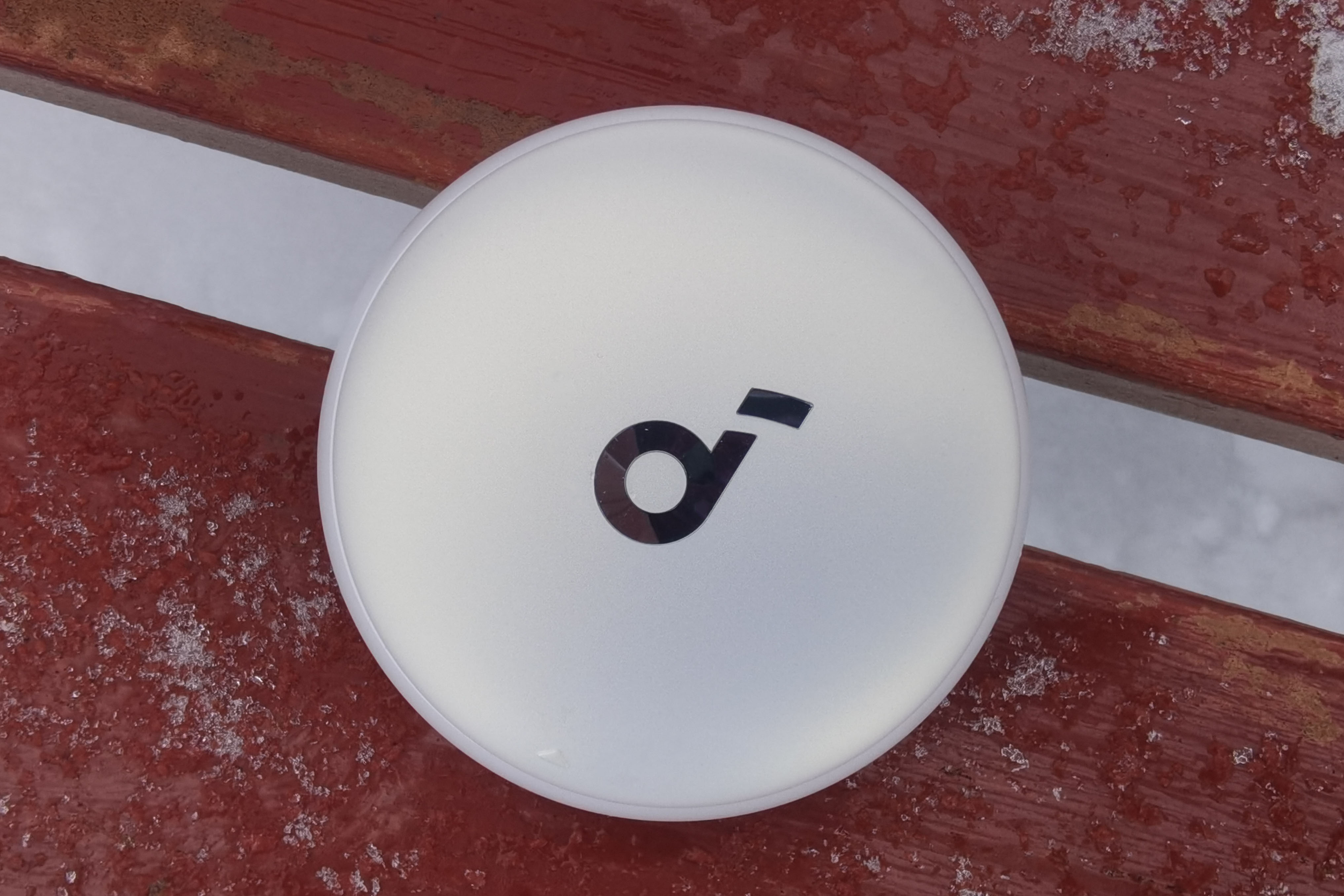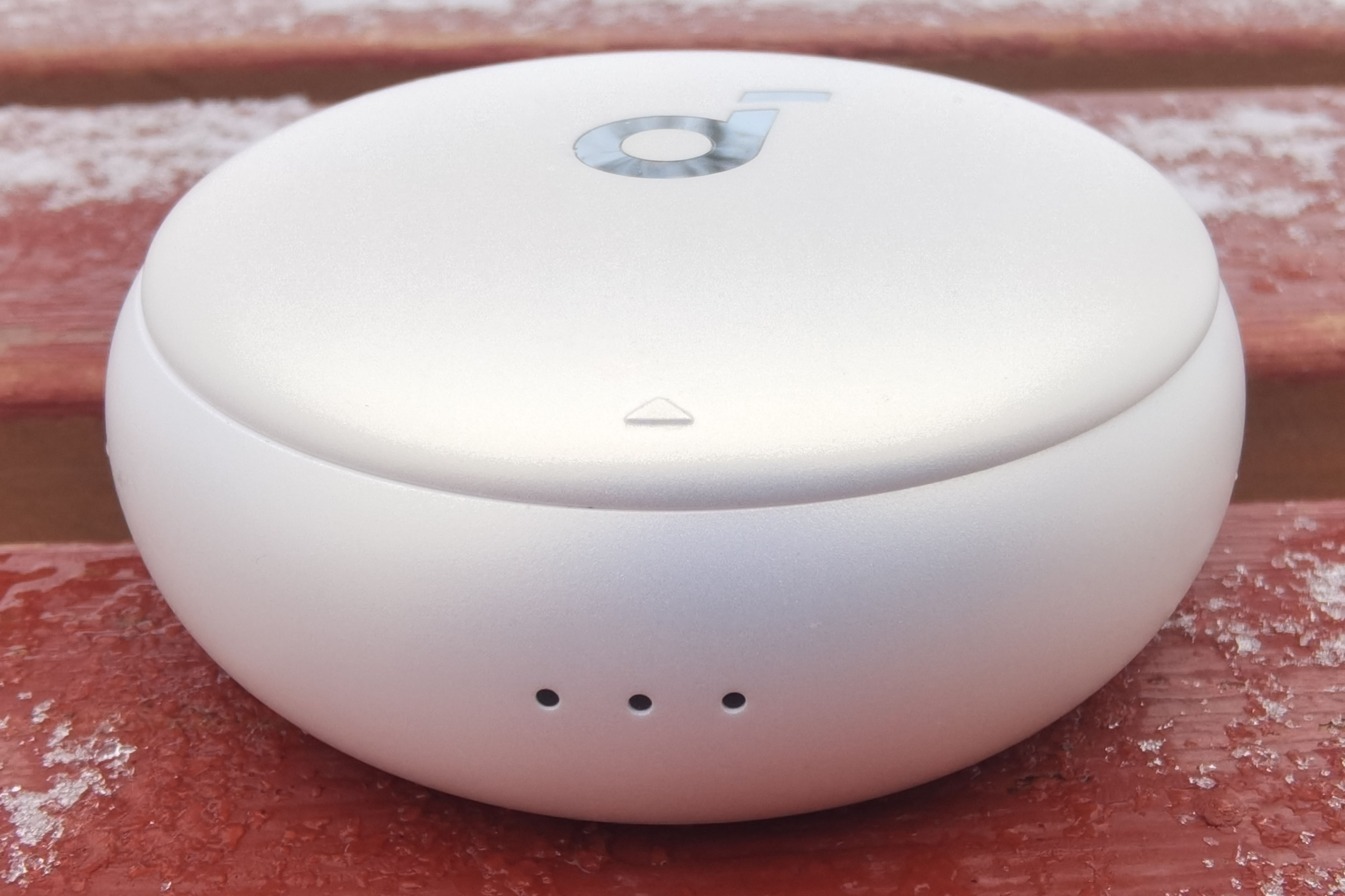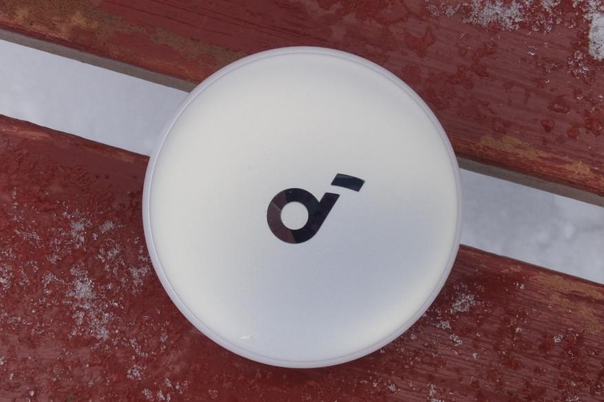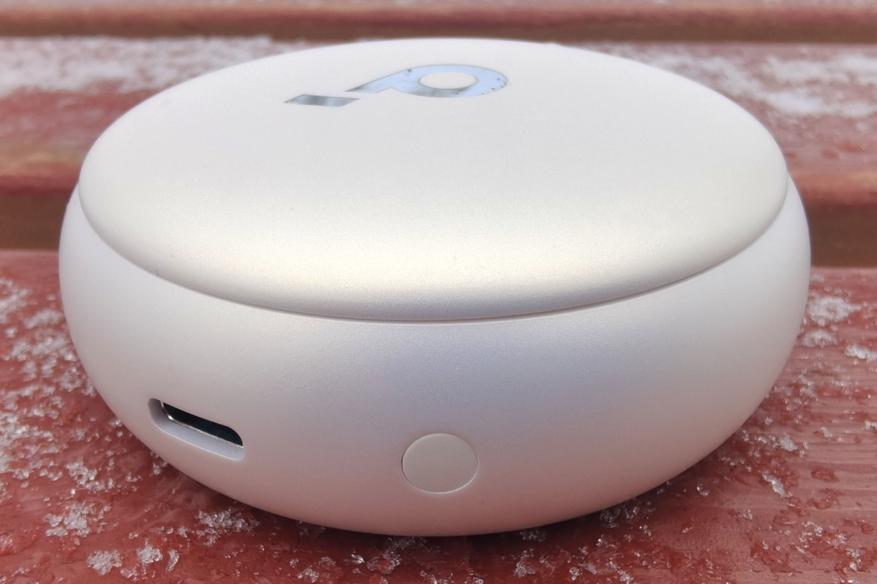 Зарядный кейс имеет форму шайбы. Его габариты (63x63x26.5 мм) и вес (64.5 г) позволяют беспрепятственно носить его в кармане. Раскрытие осуществляется по типу слайдера: плотно прилегающая крышка оснащена доводчиками. Быстро обнаружить направление сдвига помогает небольшая риска на ней.