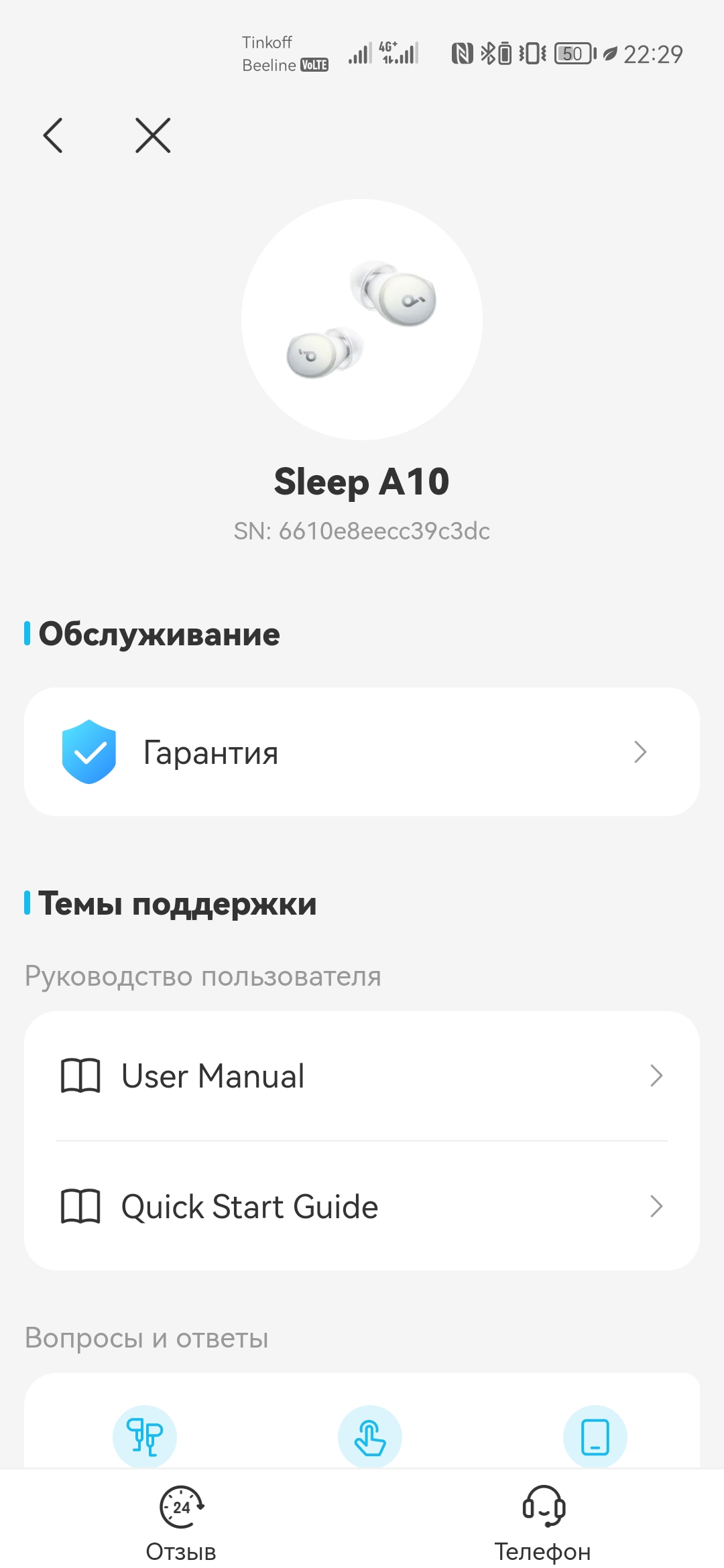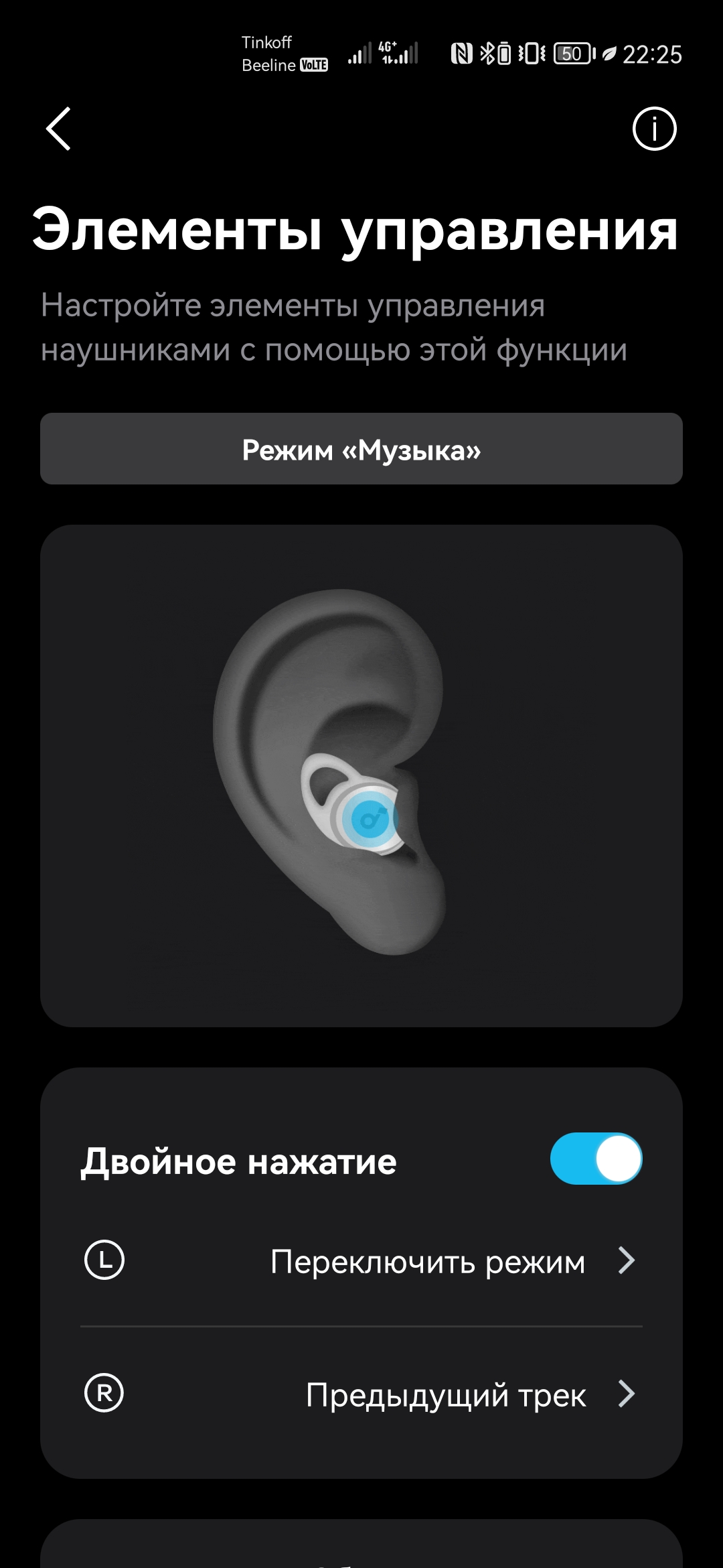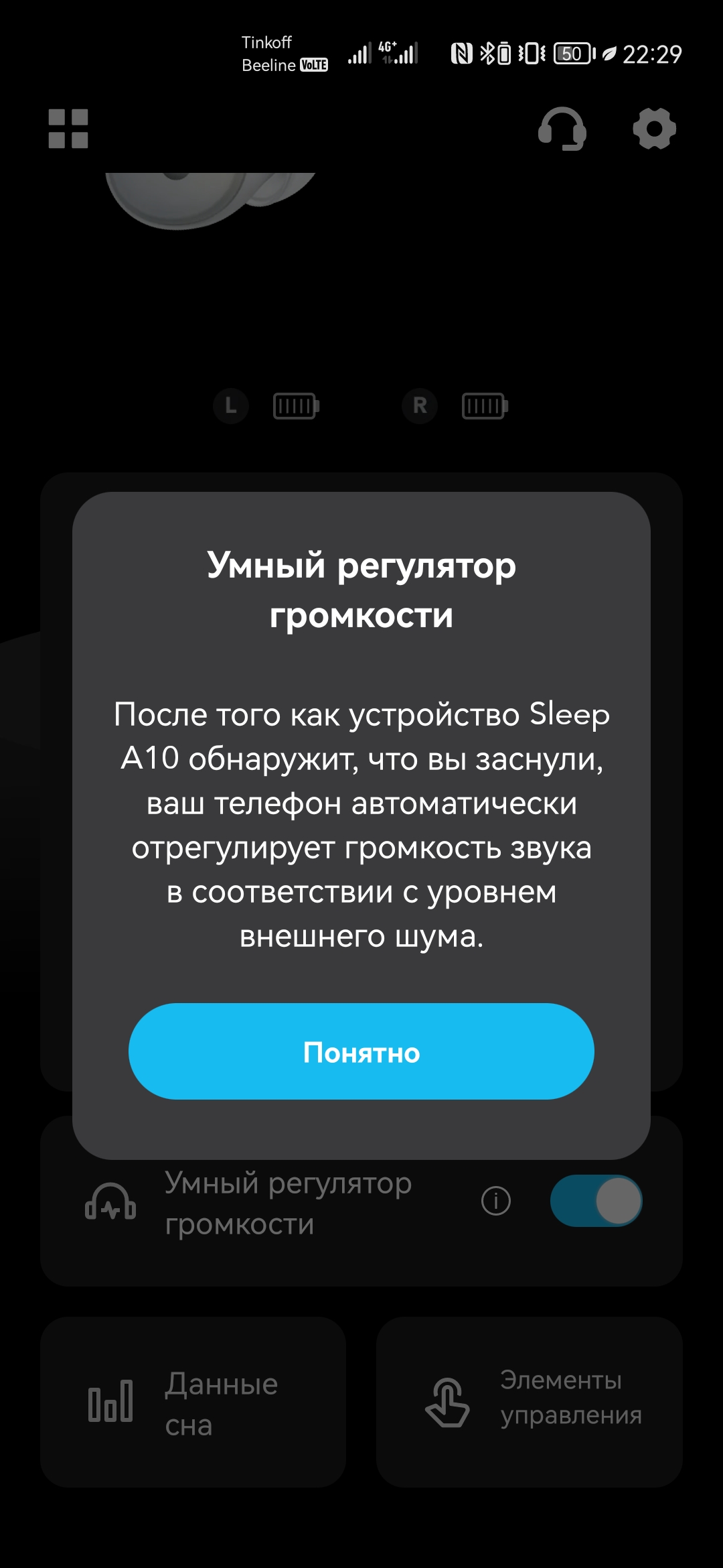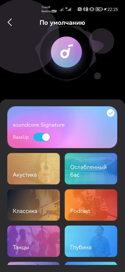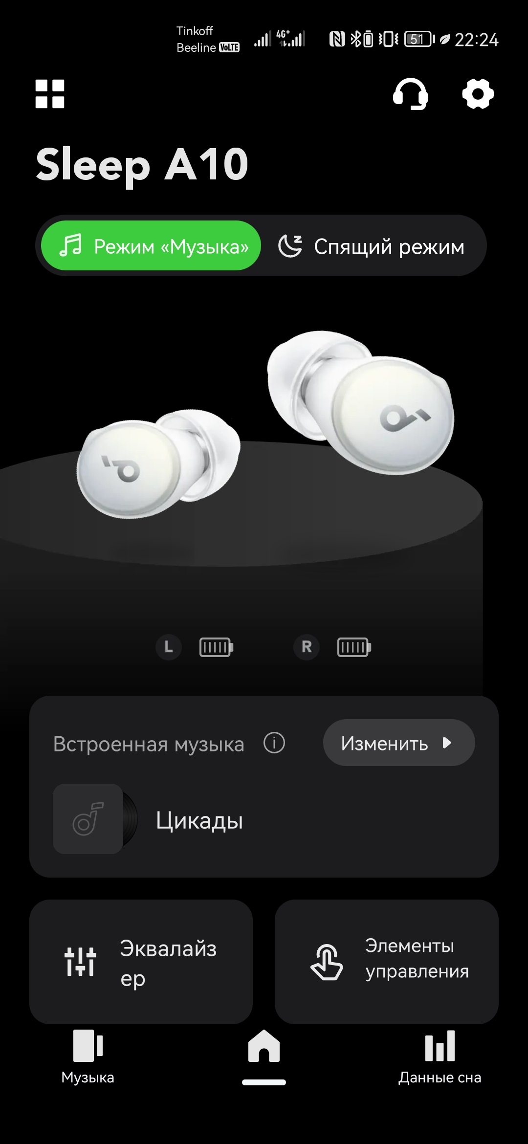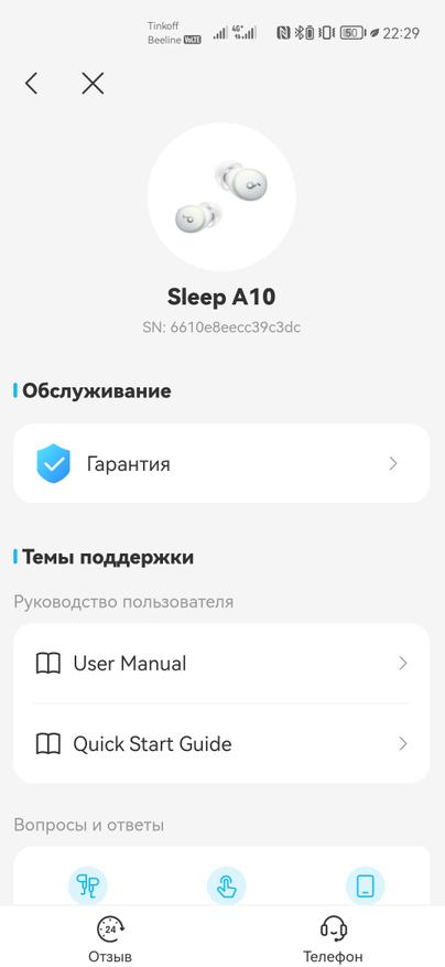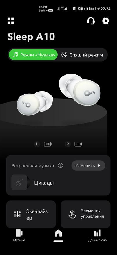 Использование Sleep A10 предполагается в тесном взаимодействии с фирменным приложением Soundcore, доступным как на Android, так и iOS. После регистрации и добавления наушников, появляется множество дополнительных возможностей. Под центральным изображением находятся иконки с текущим уровнем заряда каждого наушника. Для чехла такой нет, да и проценты смотрелись бы здесь более наглядно.