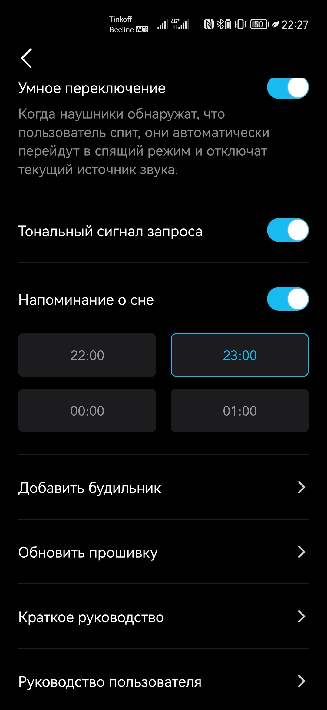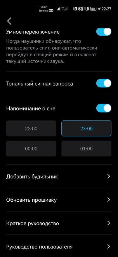 В настройках есть возможность активировать автоматическое переключение в режим сна при засыпании, отключить звуковые подсказки, добавить напоминание о необходимости отдыха (отображается непосредственно в самом приложении), установить будильник, обновить прошивку и ознакомиться с руководством пользователя. В «Спящем режиме» можно задать таймер отключения, посмотреть статистику по сну, отрегулировать громкость воспроизведения загруженного трека, а также включить автоподстройку под окружение.
