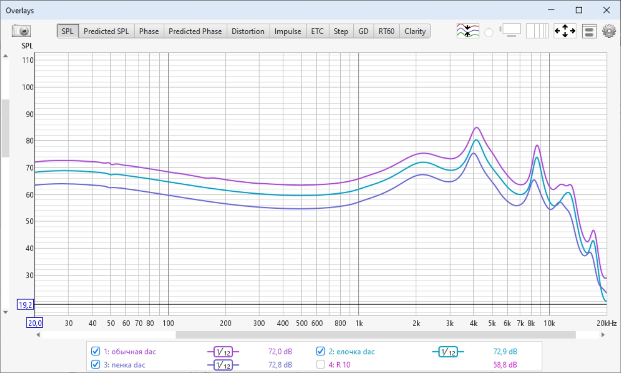 Пики совпадают с представленной на коробке АЧХ, но за счет другого масштабирования в моей АЧХ более ярко видны особенности звука.