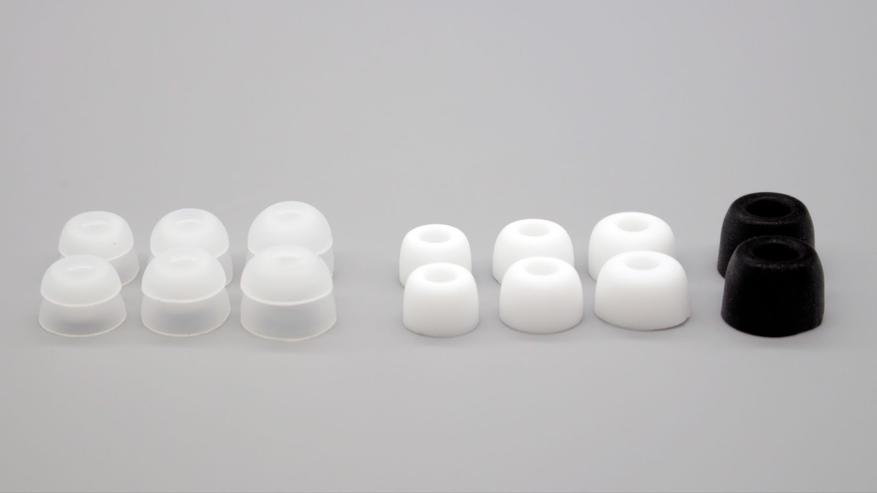 Аксессуары находятся в отдельной коробочке. Производитель комплектует набором амбушюр трех видов. Классические и ёлочки представлены в трех размерах, а вот насадки-пенки — только одна пара.