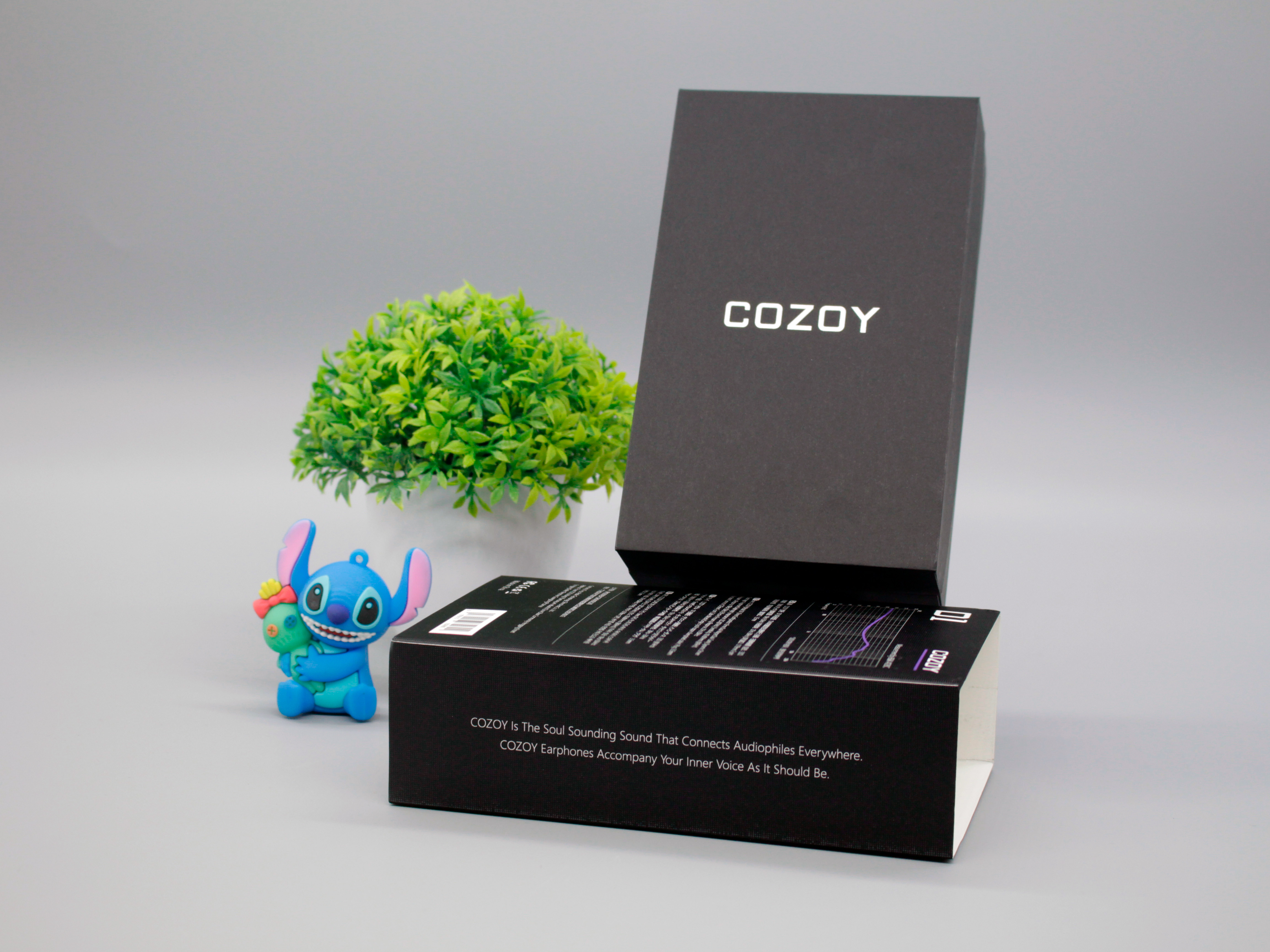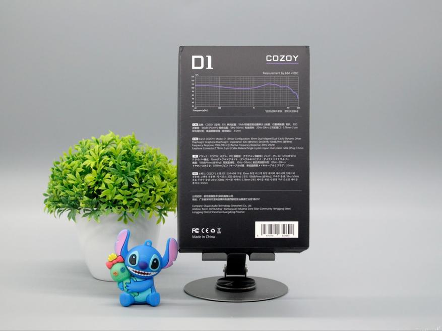 Наушники поставляются в коробке черного цвета с тактильно приятной текстурой. На передней части скромно указано название бренда — Cozoy. Задняя сторона коробки более информативна — указано название модели, АЧХ и характеристики на четырех языках.