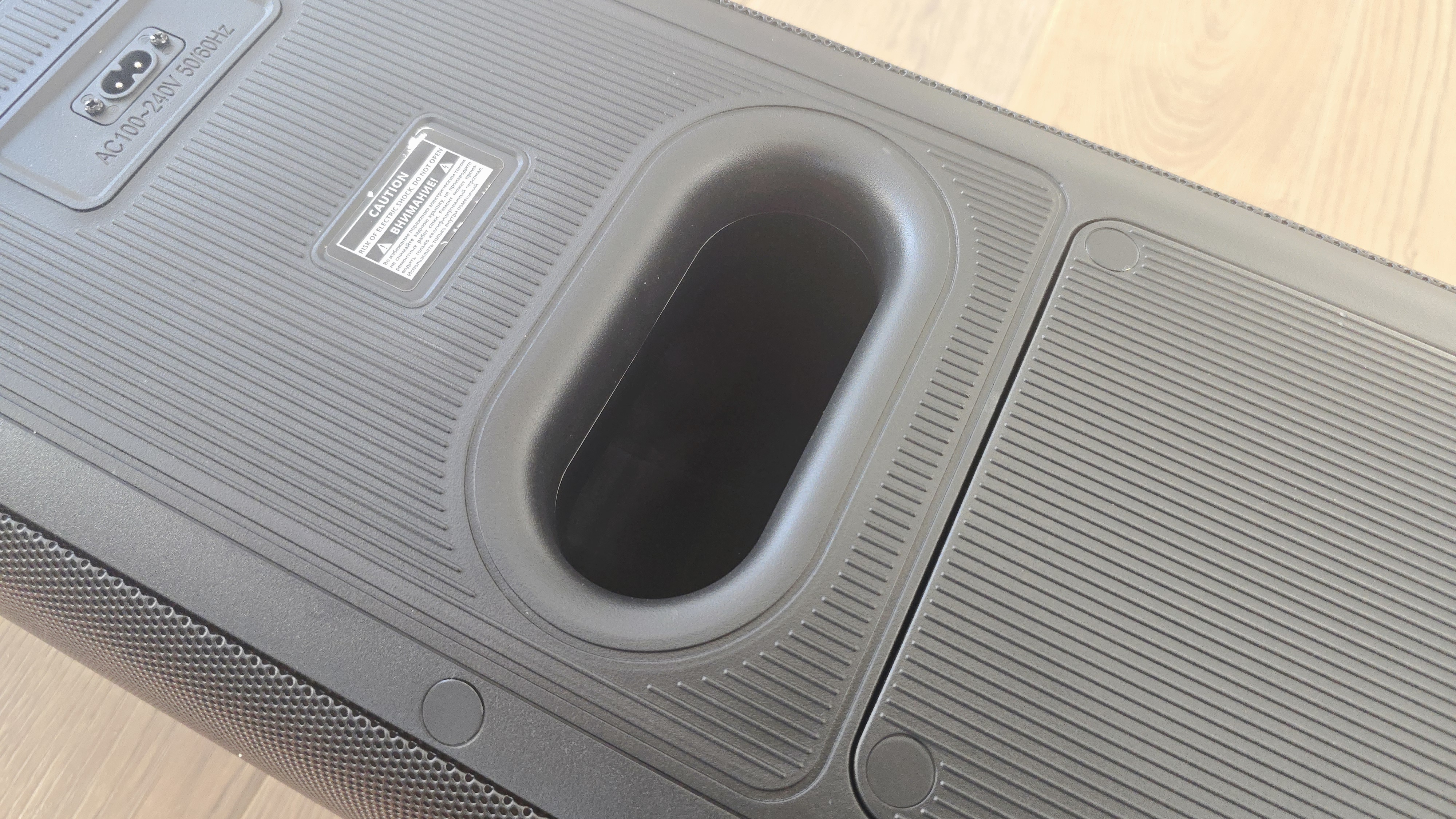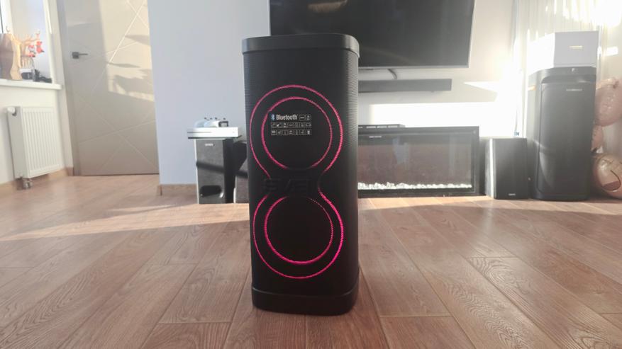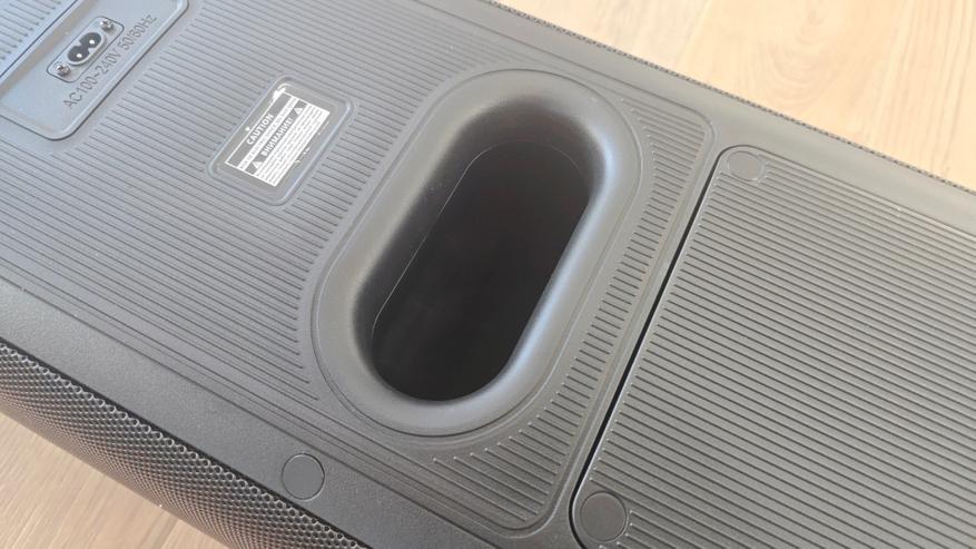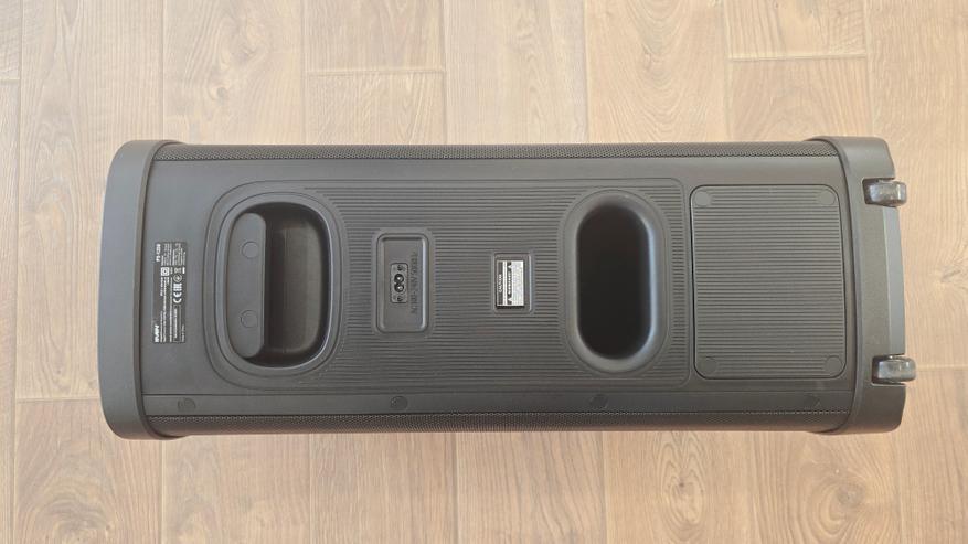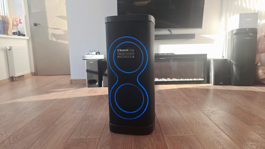 На передней стороне, помимо перфорированной решетки и логотипа компании, расположена подсветка. Она оформлена в виде двух крупных световых колец, размещенных одно над другим, строго по оси корпуса. Под решеткой скрыта акустическая часть: здесь установлены два низкочастотных динамика диаметром 180 мм и два высокочастотных динамика диаметром 70 мм, которые визуально читаются по геометрии подсветки. Световые кольца встроены за решетку и не выступают наружу, поэтому даже в выключенном состоянии передняя панель остается аккуратной и нейтральной. Помимо колец, на передней стороне также размещены светодиоды стробоскопа, которые дополняют основную подсветку и работают как отдельный визуальный элемент. В нижней и верхней части передней панели заметны пластиковые накладки, которые выполняют защитную функцию.