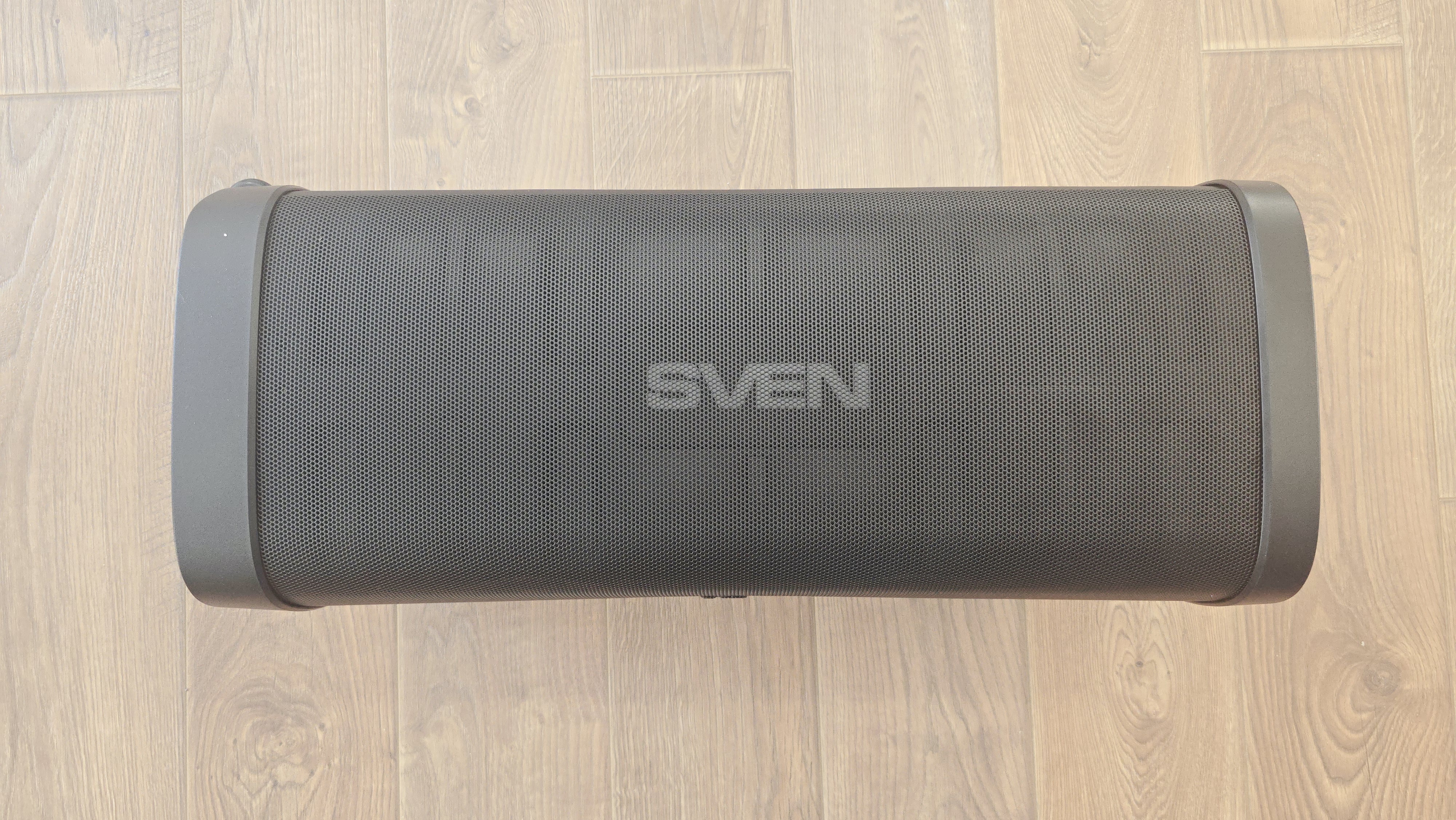 Боковые грани у колонки одинаковые. Здесь корпус по-прежнему закрыт акустической решеткой, и в центре боковой поверхности расположен логотип SVEN. В пассивном состоянии он выглядит как аккуратное тиснение, а при включении подсвечивается изнутри.