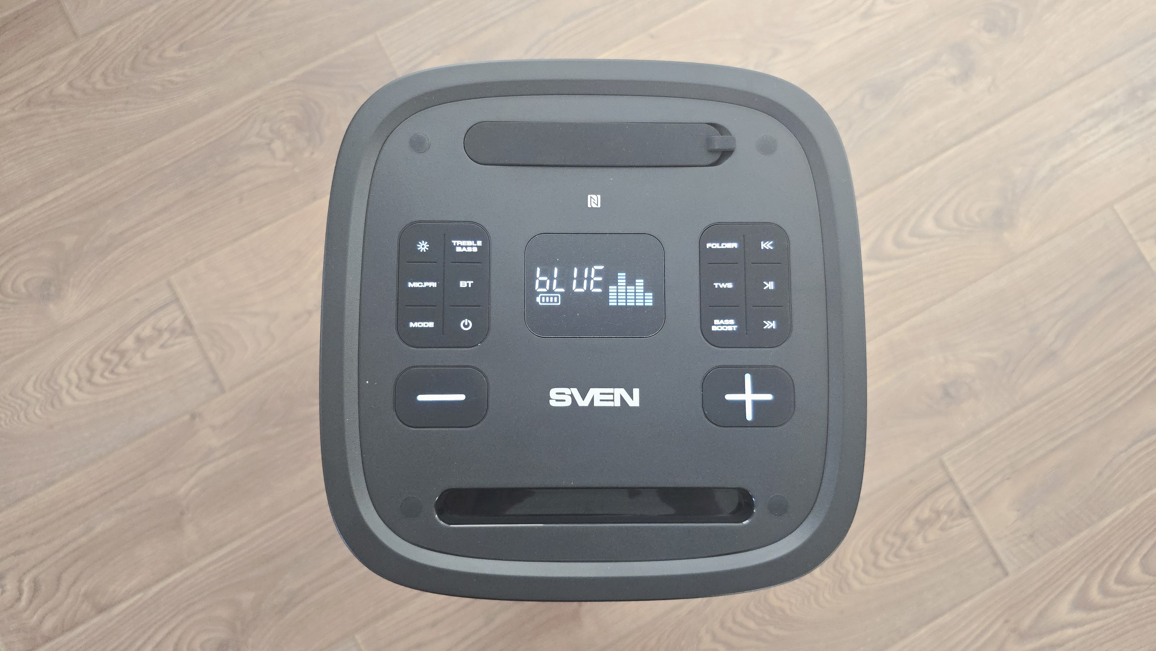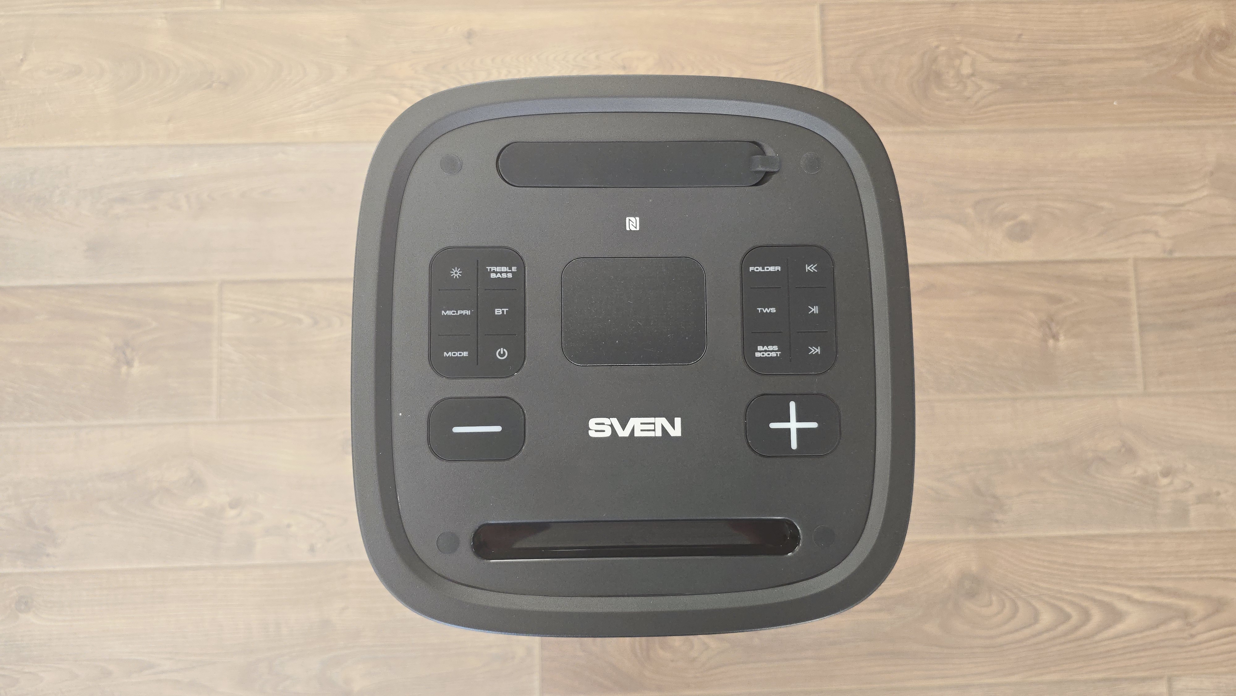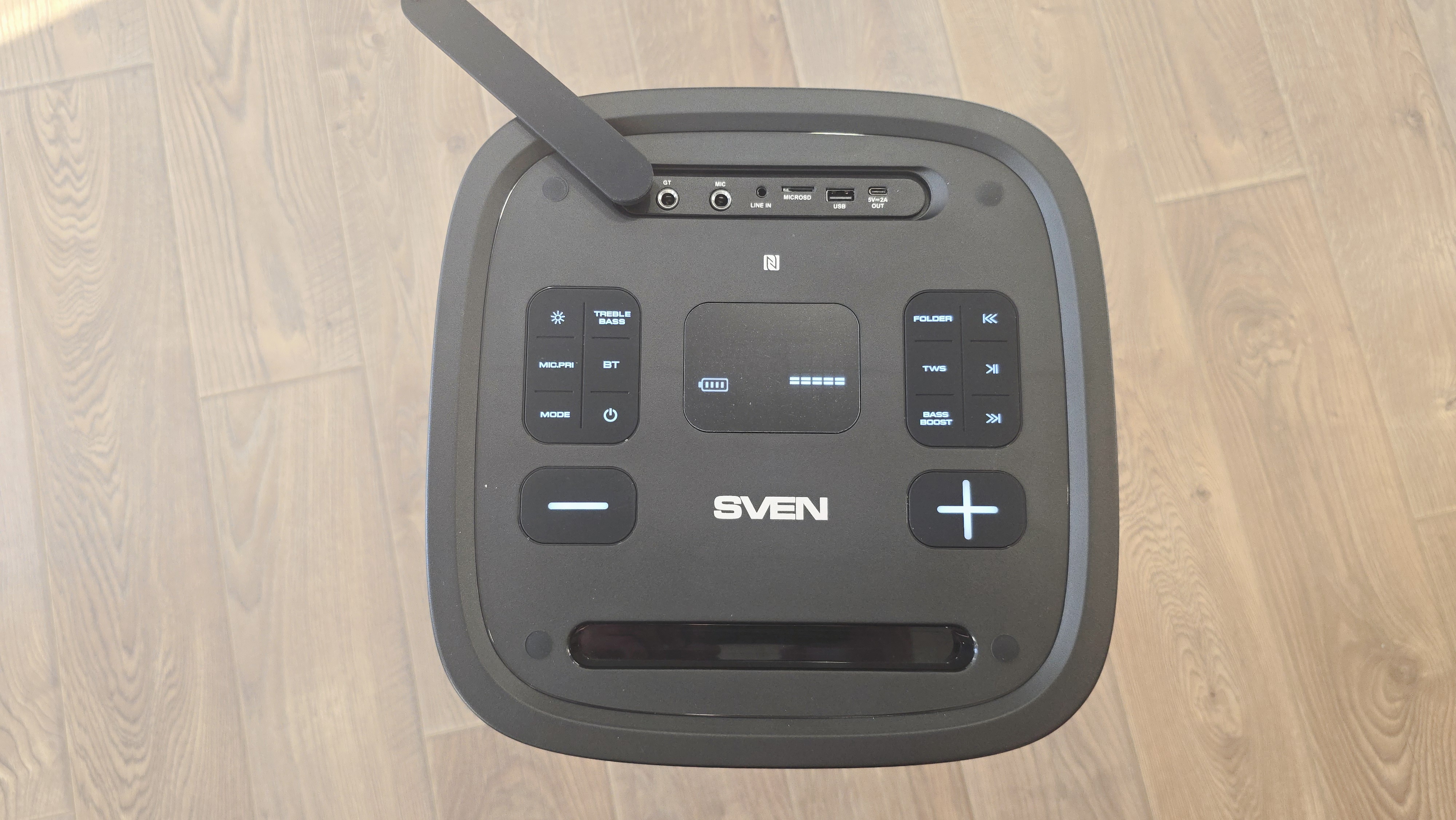 Верхняя панель — самый насыщенный элемент с точки зрения деталей. Она утоплена относительно кромки корпуса и имеет слегка матовую поверхность. В центральной части расположен дисплей, на котором отображается режим работы, уровень сигнала и индикатор заряда. Экран встроен заподлицо, без выступающих рамок. По обе стороны от него размещены кнопки управления, сгруппированные симметрично. Слева находятся кнопки, связанные с режимами работы, Bluetooth, подсветкой, приоритетом микрофона и питанием. Справа — блок управления воспроизведением, TWS, выбором папок и усилением баса. Кнопки плоские, с четкими подписями, хорошо различимыми даже без подсветки. Чуть ниже расположены две крупные кнопки изменения громкости, выполненные отдельно от основного блока. Они заметно больше остальных и визуально выделены, что упрощает управление на ощупь. Между ними размещен логотип SVEN. Ближе к переднему краю верхней панели сделана продольная ниша, которая используется как подставка для смартфона. Телефон встает под небольшим углом и фиксируется достаточно глубоко, чтобы не выскальзывать при вибрации. В задней части верхней панели находится отсек с разъемами. Он утоплен и прикрыт резиновой заглушкой, защищающей порты от влаги и пыли. Под заглушкой расположены входы для микрофона и гитары, линейный вход, слот для microSD, USB-порт для флешки, разъем USB для зарядки внешних устройств и порт USB Type-C для зарядки самой колонки. Все разъемы подписаны и расположены в один ряд, без наложения друг на друга. Рядом с ними размещена зона NFC, обозначенная отдельным значком.