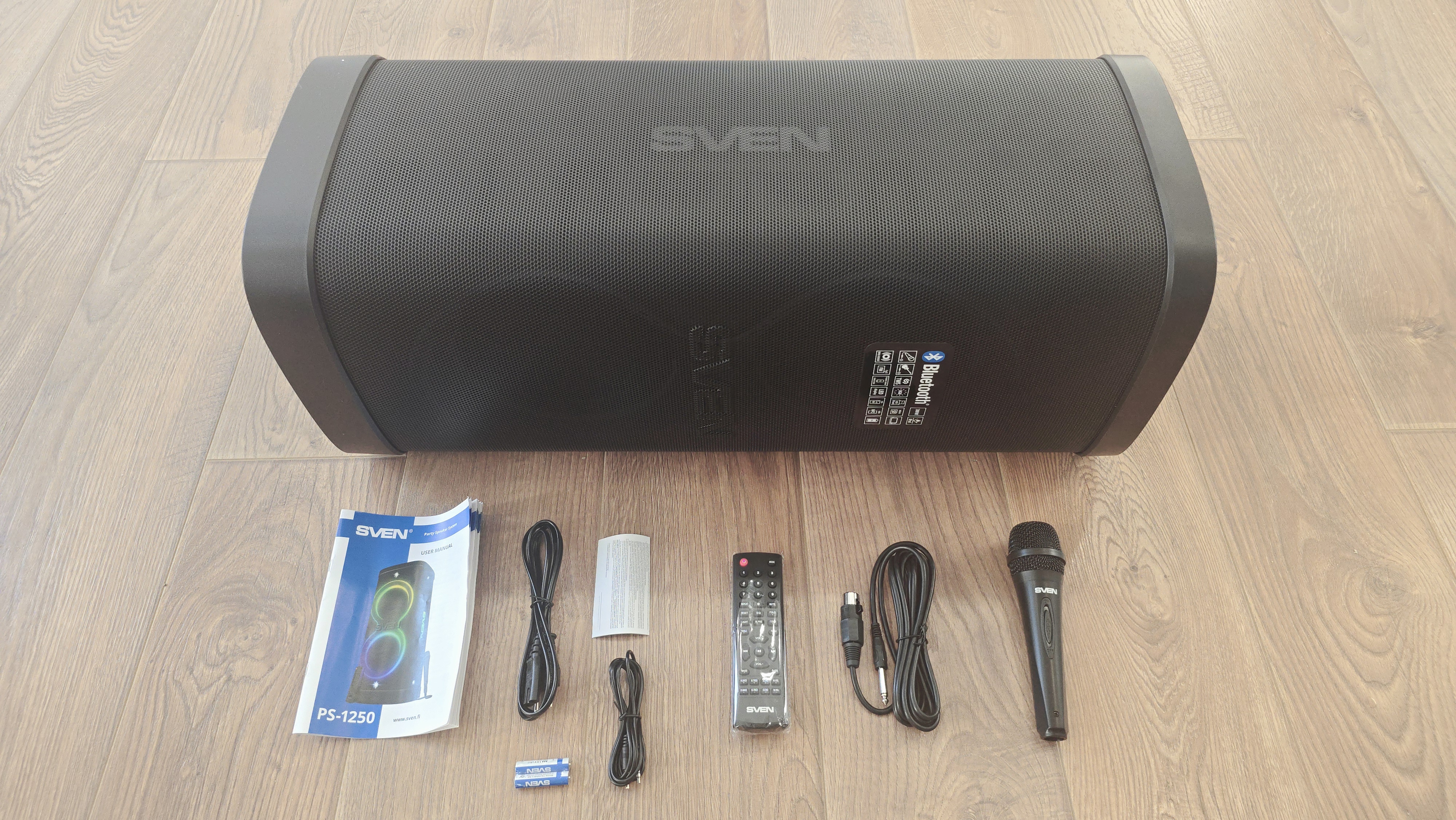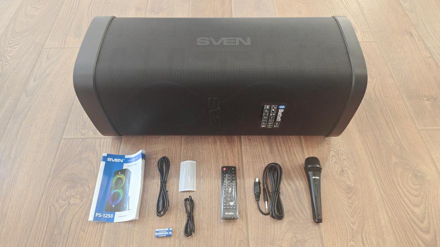 В комплект поставки входит Sven PS-1250, сетевой кабель, кабель mini-jack/mini-jack, ПДУ, два батарейки AAA, проводной караоке-микрофон, руководство пользователя и гарантийный талон.