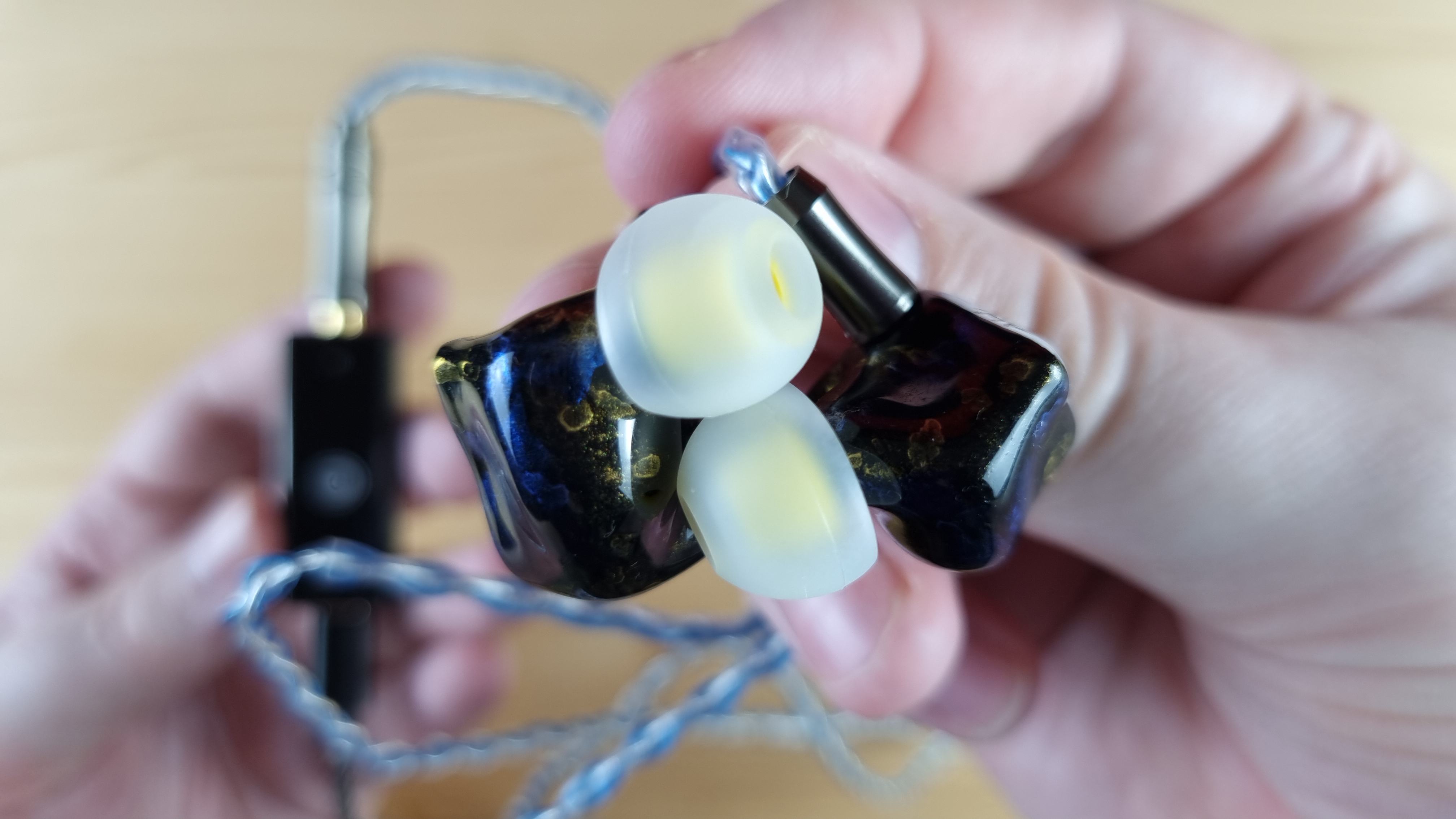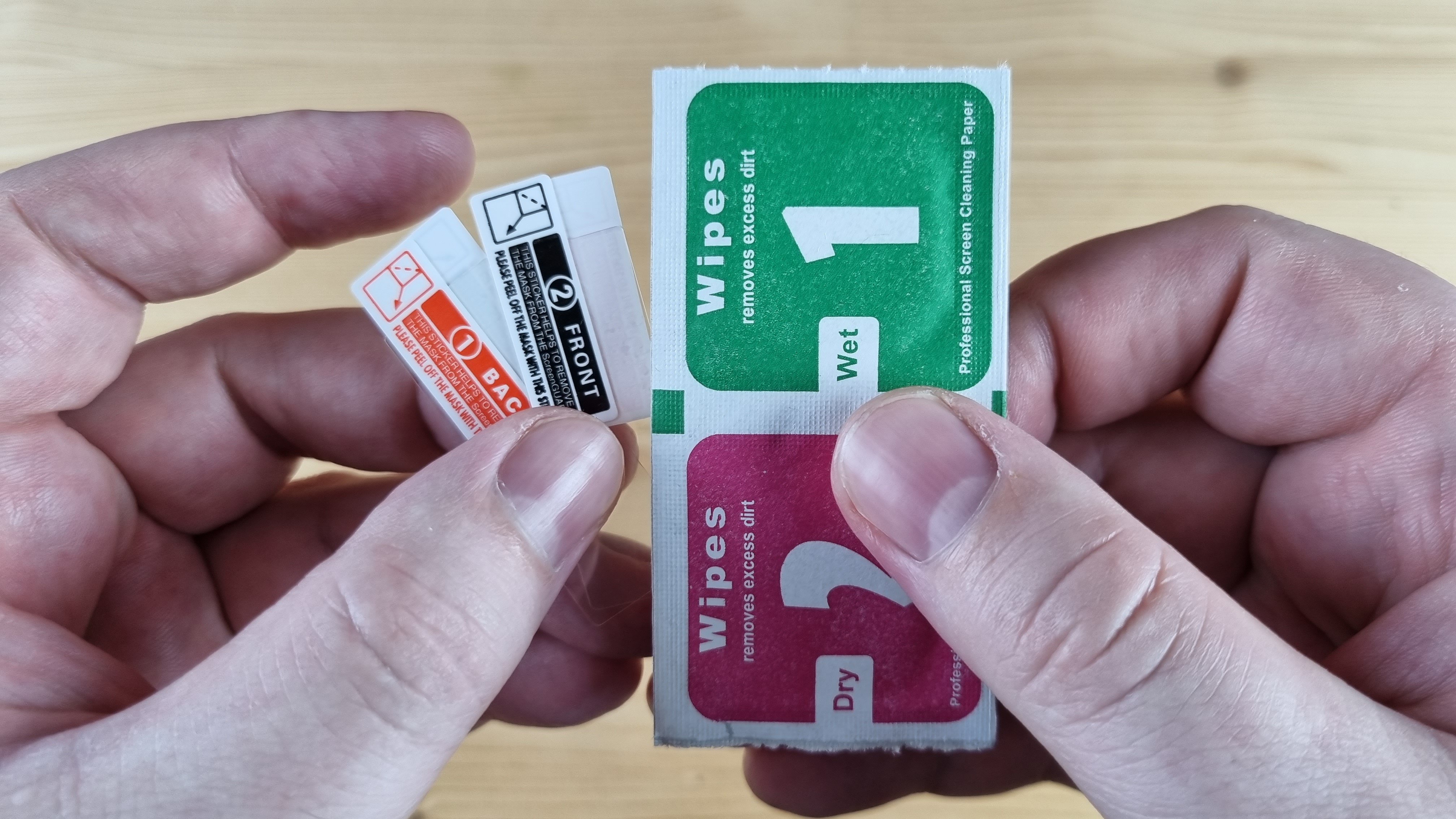 Комплект, на этот раз, немного расширили. Помимо знакомой нам наклейки о Hi-Res Audio сертификации, переходника с Type C на классический USB разъем и кабеля MicroUSB на Type C, я нашел две пленочки на переднюю и заднюю часть, а также пару салфеток. К слову, салфетки были и в третьей ревизии, а вот пленочки — это уже нечто новое.