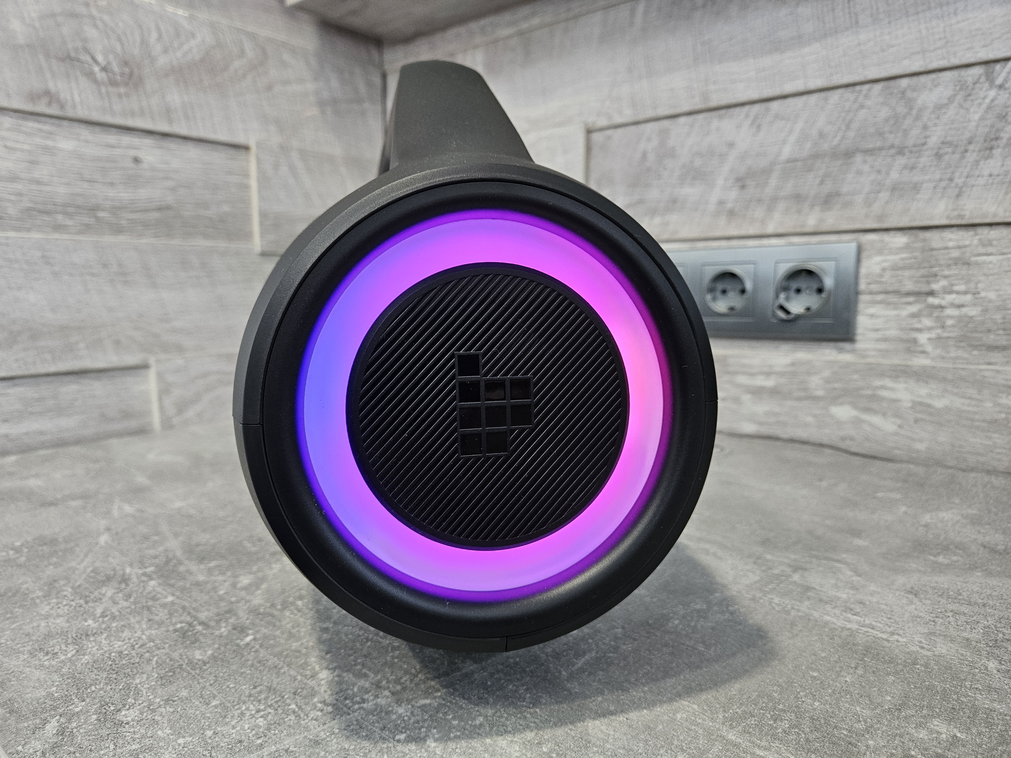 По бокам корпуса находятся пассивные излучатели с RGB-подсветкой. Их конструкция полупрозрачна — через силиконовые амортизаторы эффектно подсвечивается RGB-подсветка. Пользователь может выбирать между различными световыми эффектами: статичной цветовой палитрой или динамическим режимом, где интенсивность свечения синхронизируется с громкостью звука. Это добавляет колонке стильный вид и позволяет создать иллюзию присутствия на дискотеке.