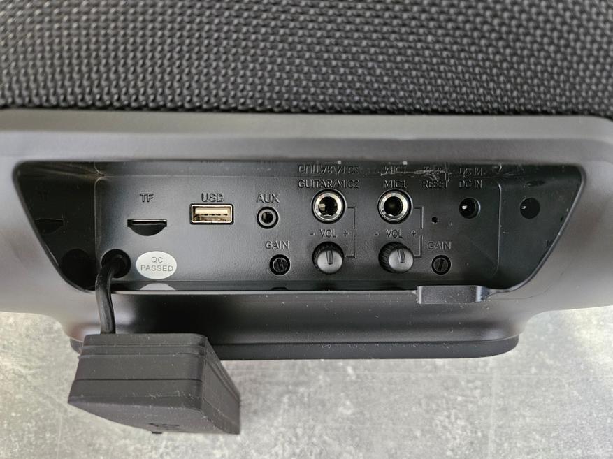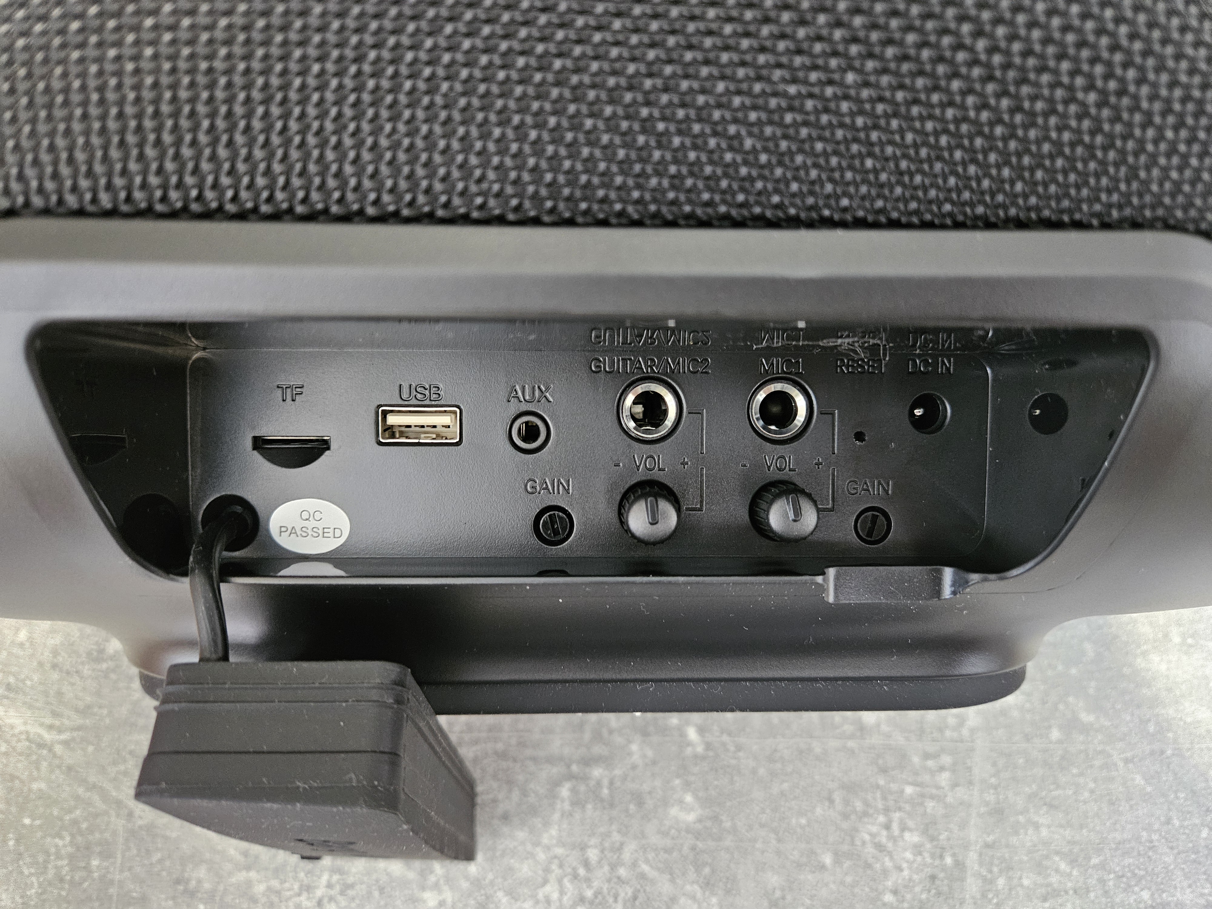 Колонка обладает влагозащитой IPX6, поэтому её можно использовать под дождём или у воды. Все разъёмы надёжно спрятаны под толстой резиновой заглушкой: здесь есть слот для microSD, USB-порт для флешек, AUX-вход, разъём для зарядки и два специальных входа — для микрофона или электрогитары, с возможностью регулировки усиления сигнала.